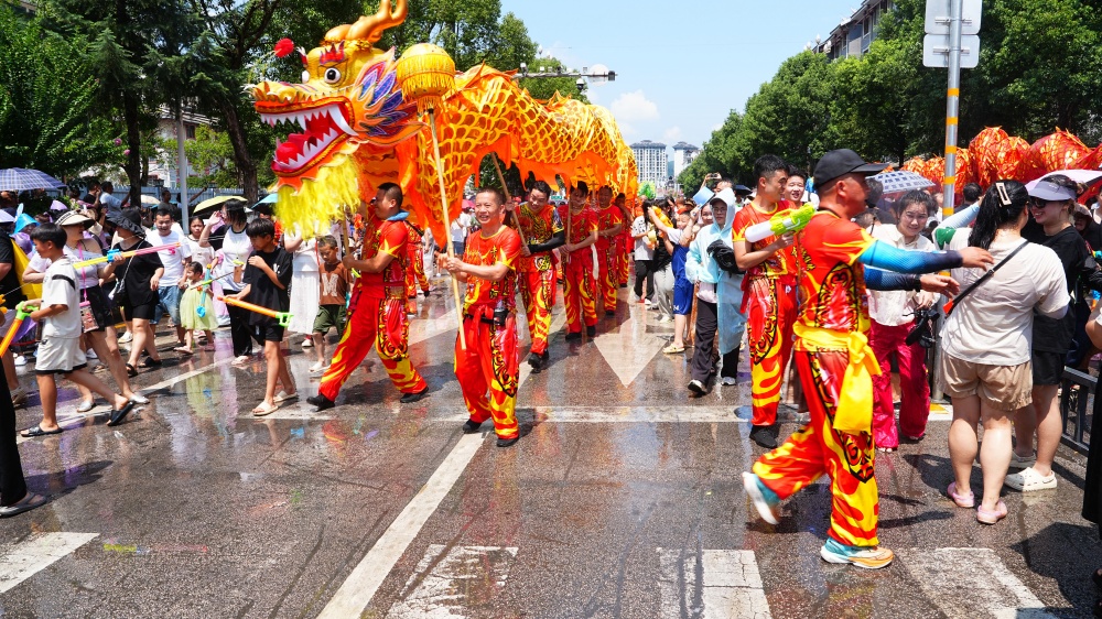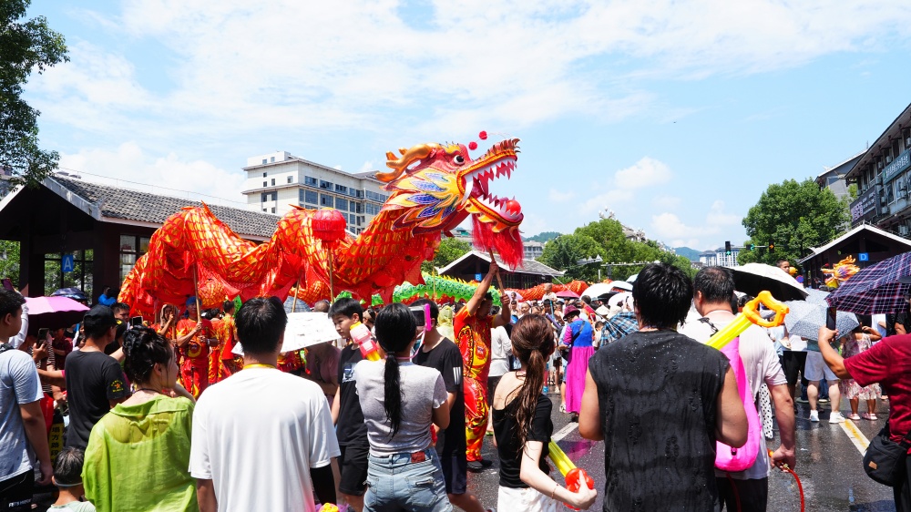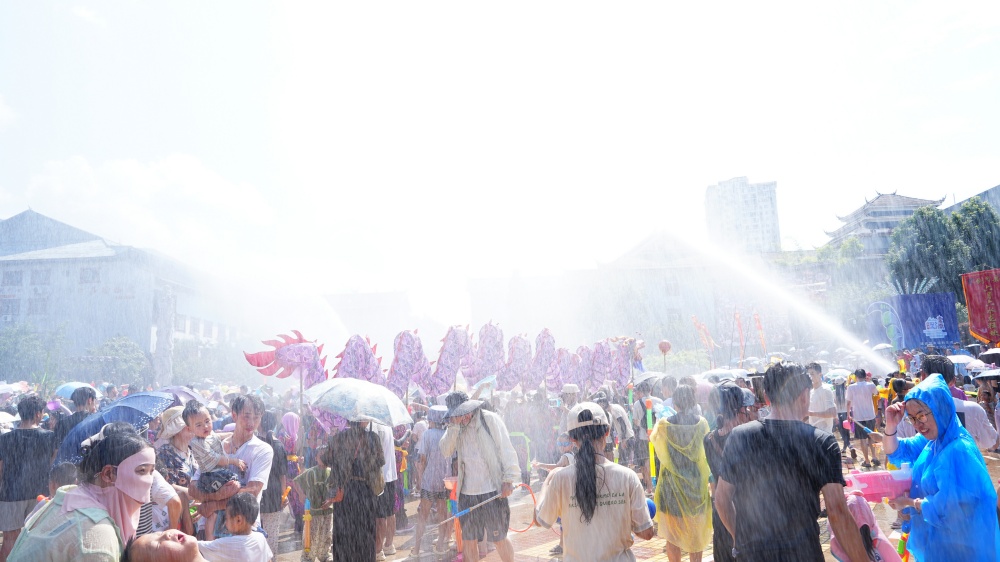 四周的觀眾早已按捺不住,成了這場狂歡最熱情的“助燃劑”,他們手持水槍、水盆等“武器”,互相潑水祝福,縱情投入這場水的狂歡,清涼的水花在空中飛濺,象征著吉祥與幸福的傳遞。歡聲笑語漫過街角,人與龍共舞,人與人相樂,盡情享受著夏日的清涼與節(jié)日的喜悅。