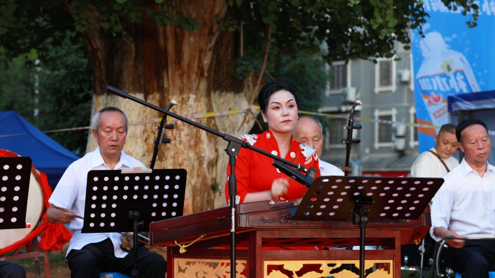 與劇場(chǎng)演出不同,此次展演選擇露天場(chǎng)地,觀眾可自由駐足觀看。帶著孩子前來聆聽的姜政豪說:“沒想到在家門口就能看到這么好的表演。節(jié)目比較豐富,樂器、獨(dú)唱、獨(dú)奏,都各有特色,孩子看到樂器也很想學(xué)?!毖莩鑫猜?,全體演員與觀眾合唱《我和我的祖國》,許多人揮舞手機(jī)燈光,將氣氛推向高潮。