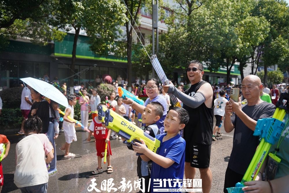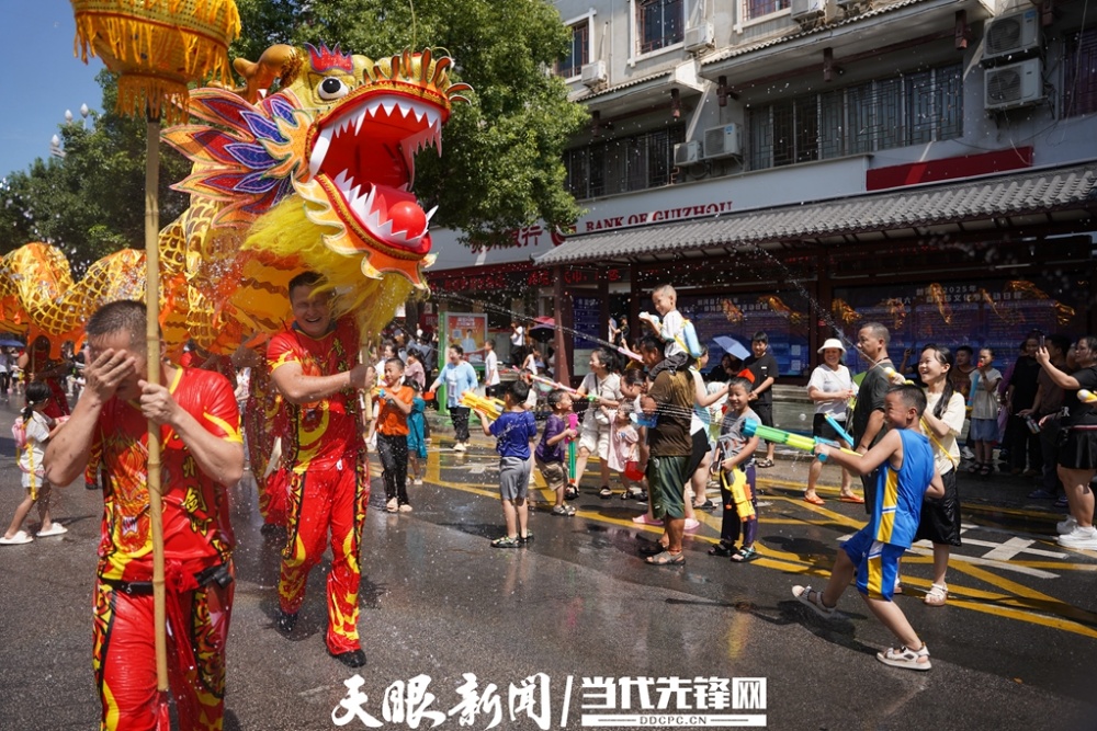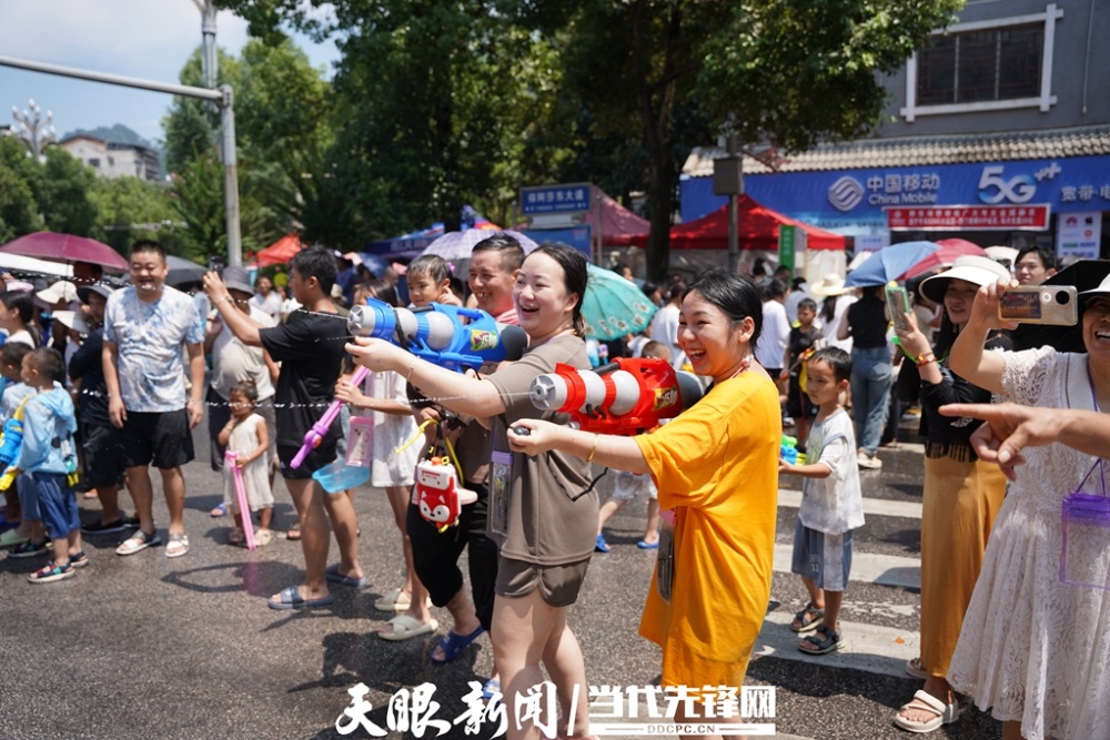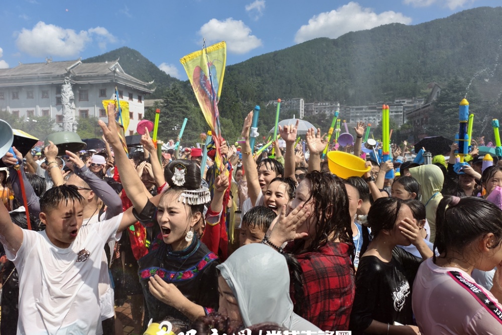 當(dāng)水龍隊(duì)伍進(jìn)入人群,頃刻間便點(diǎn)燃了全場(chǎng)激情,游客與當(dāng)?shù)厝罕姴粩嘞蛄鶙l水龍潑水,同時(shí)小朋友們也拿起水槍道具互相潑水玩耍。一時(shí)間,劍河縣城的道路上充滿(mǎn)了歡聲笑語(yǔ),水聲、笑聲、歡呼聲不絕于耳。