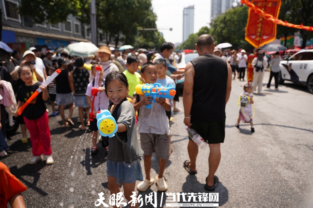 “我要第一個(gè)潑到龍頭!”現(xiàn)場(chǎng)的小朋友手拿水槍向即將進(jìn)場(chǎng)的水龍巡游隊(duì)伍喊道。