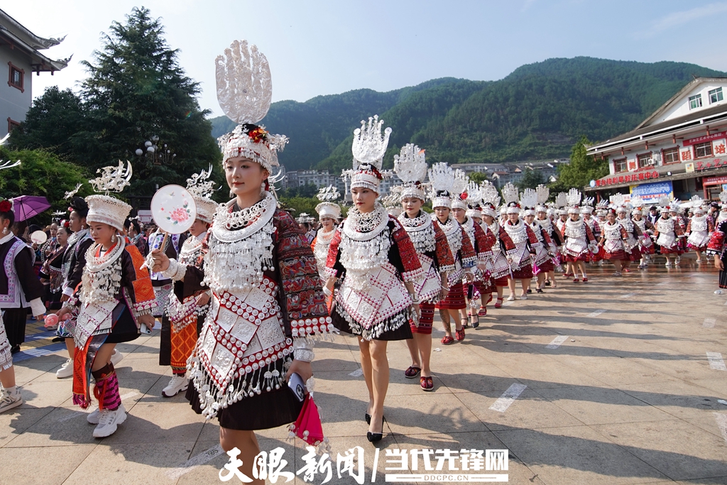 活動(dòng)現(xiàn)場(chǎng),當(dāng)?shù)馗髅缱逯档娜罕娚碇魇绞⒀b,宛如一幅現(xiàn)實(shí)的“百苗圖”,引得游客爭(zhēng)相拍照。隨后,苗族群眾以中心的木鼓為圓心,形成一層又一層的“同心圓”,在“祭師”的吶喊聲中,木鼓震天如雷,苗族群眾擺開手臂,踏步而舞,萬(wàn)人水鼓舞瞬間點(diǎn)燃全場(chǎng)熱情。