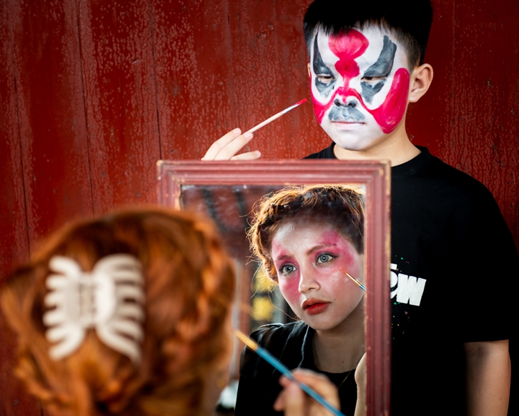 “化油彩妝時,周老師告訴我,不同顏色代表不同性格,藍(lán)色臉表示剛猛,粉色臉象征端莊?!币Ψ颇却舜卧诙神R“家風(fēng)學(xué)堂”學(xué)習(xí)侗戲,完整體驗了從化油彩妝、穿戲裝、排練到登臺的全流程演出環(huán)節(jié)。