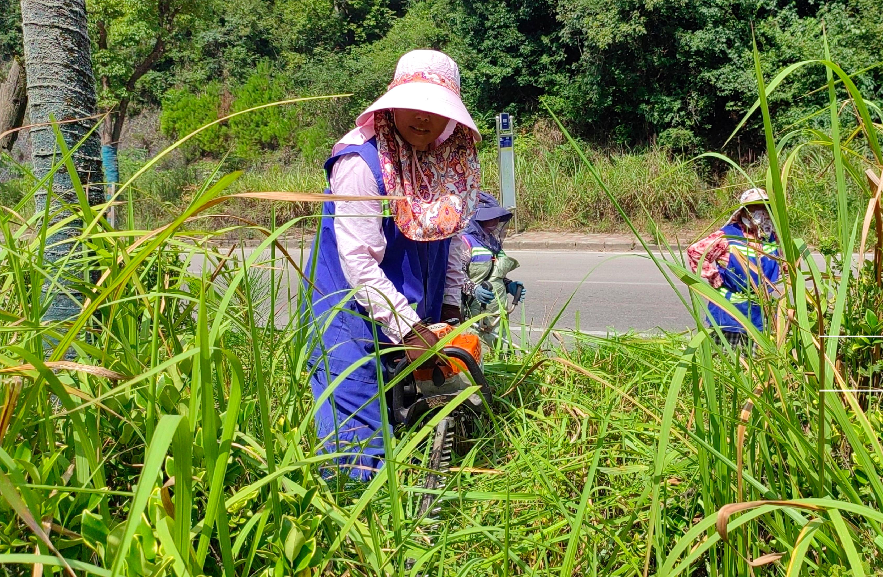 在二臺線,易凱川手持綠籬機的身影格外醒目。他手臂和小腿布滿雜草劃出的紅痕,皮膚被烈日暴曬的黝黑,卻仍專注修剪著過長的枝椏:“夏天雜草瘋長,現(xiàn)在不清,過幾天就控制不住了,為了城市的美觀,我們一線工人累一點苦一點也值得?!?/p>