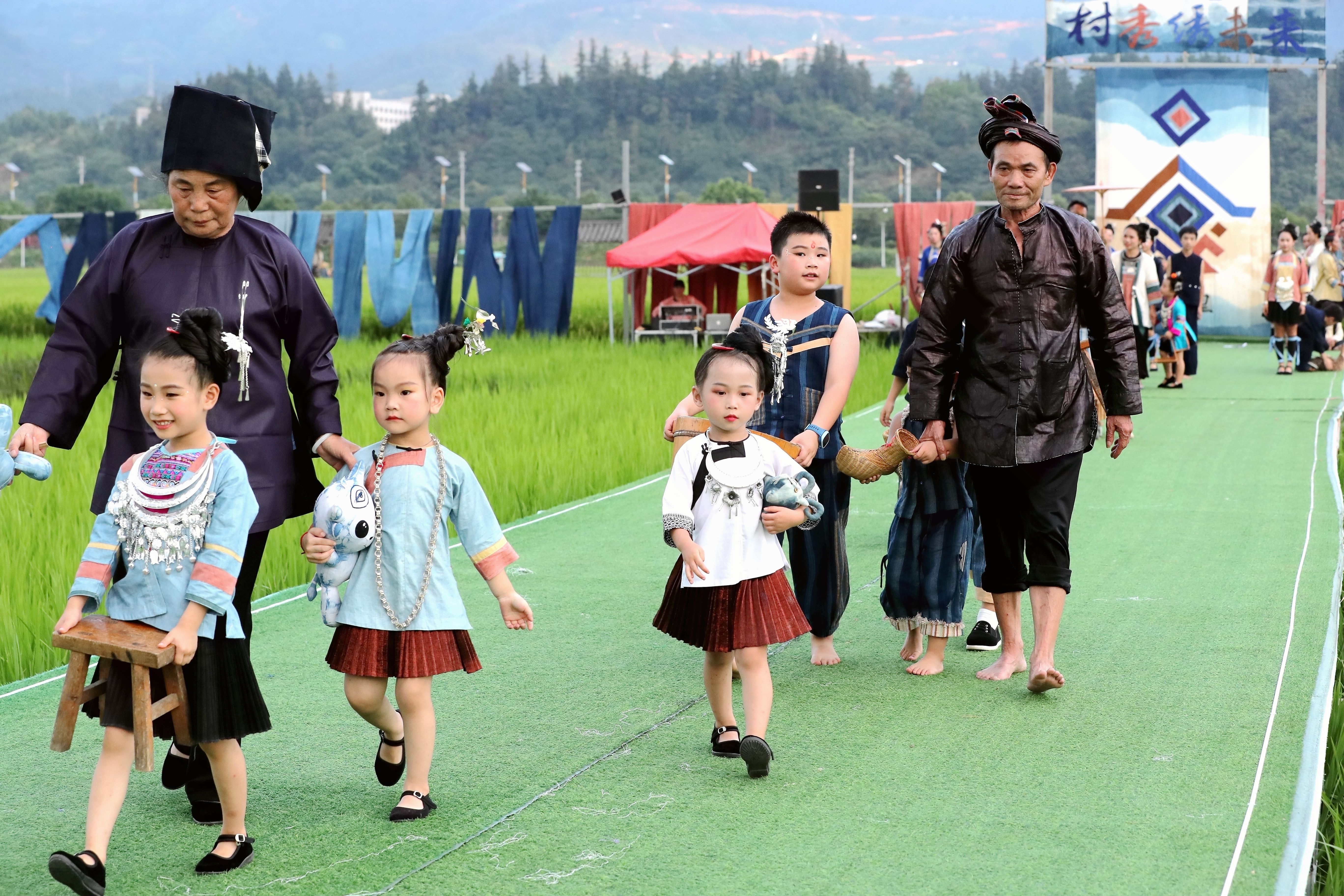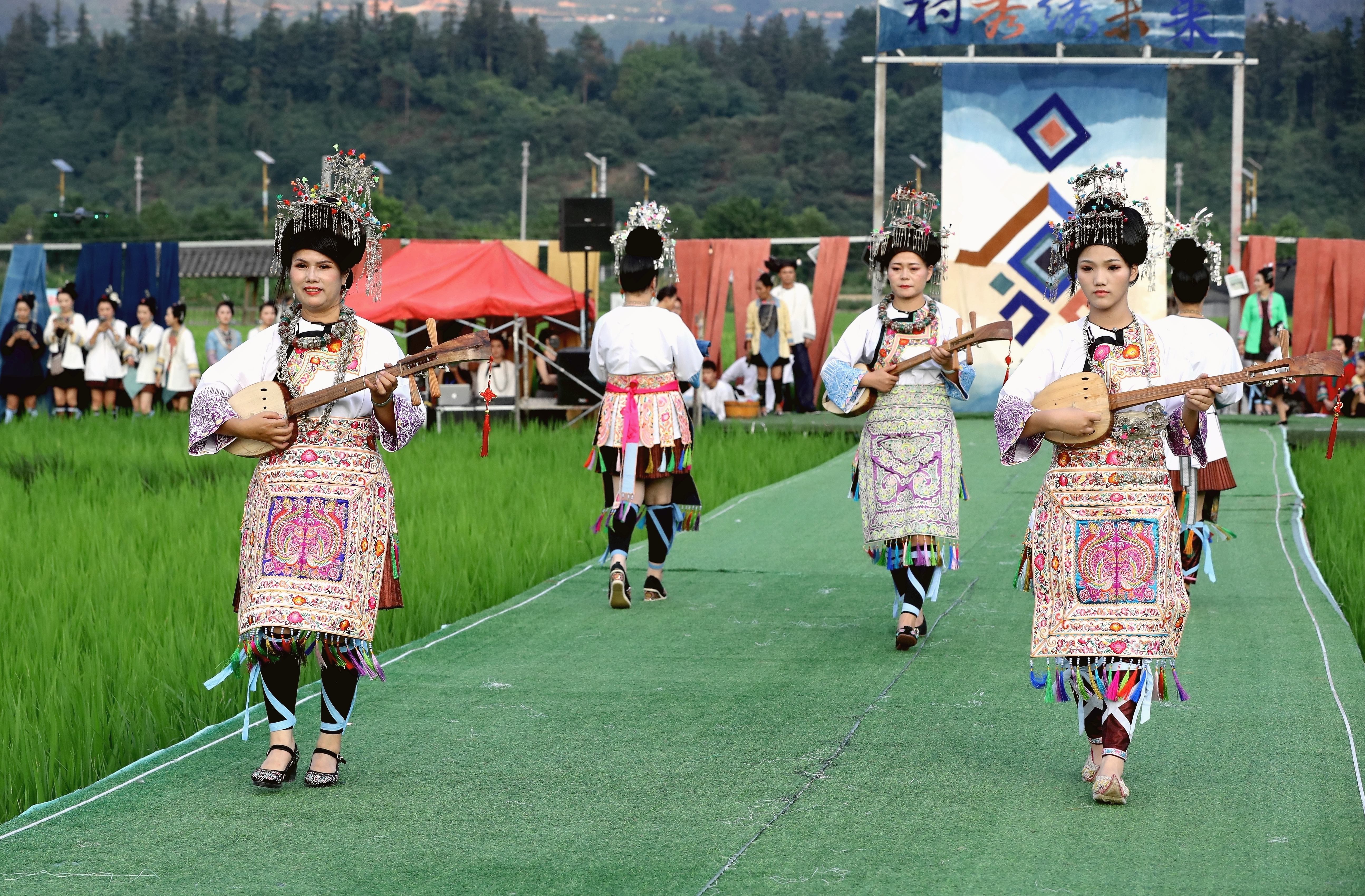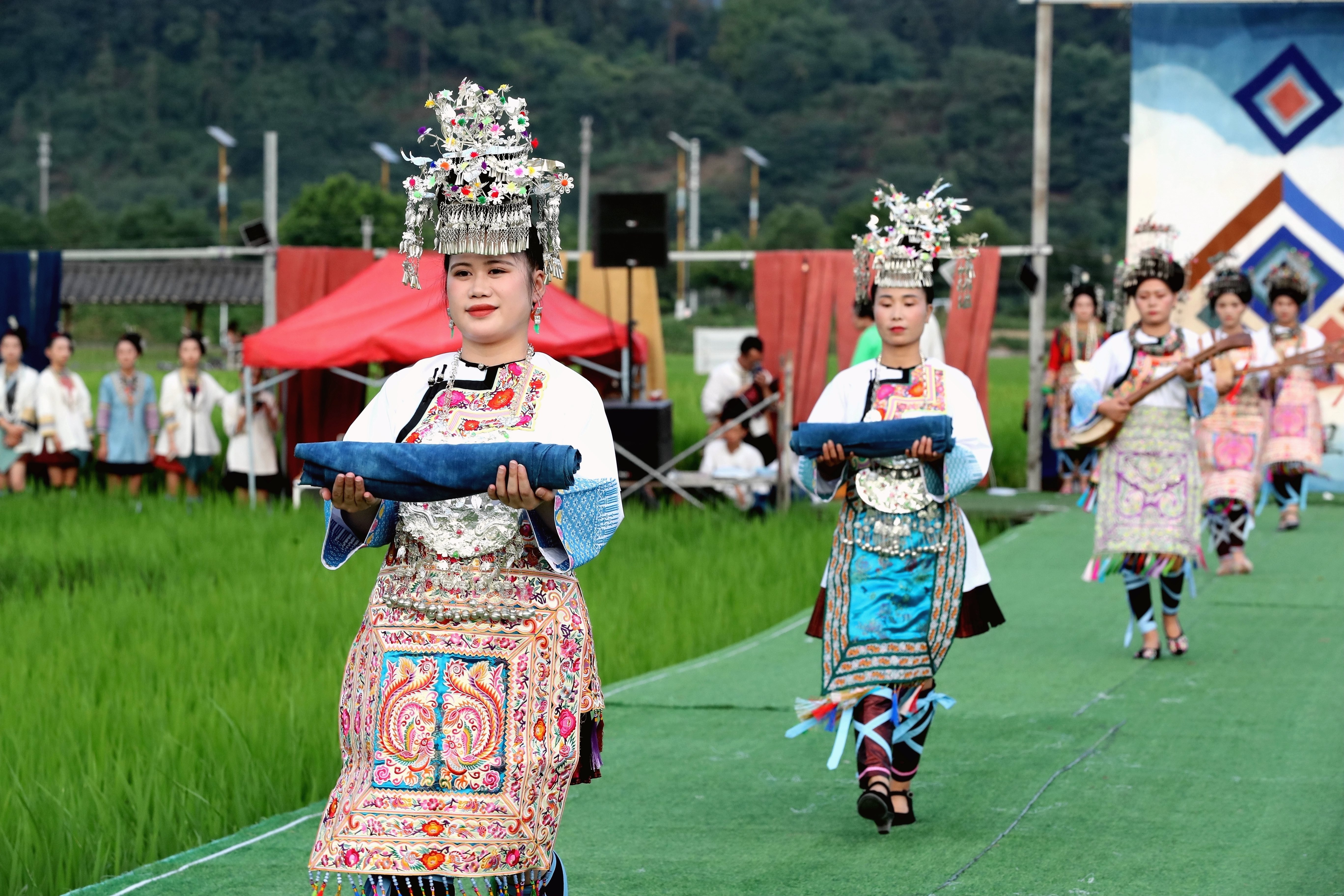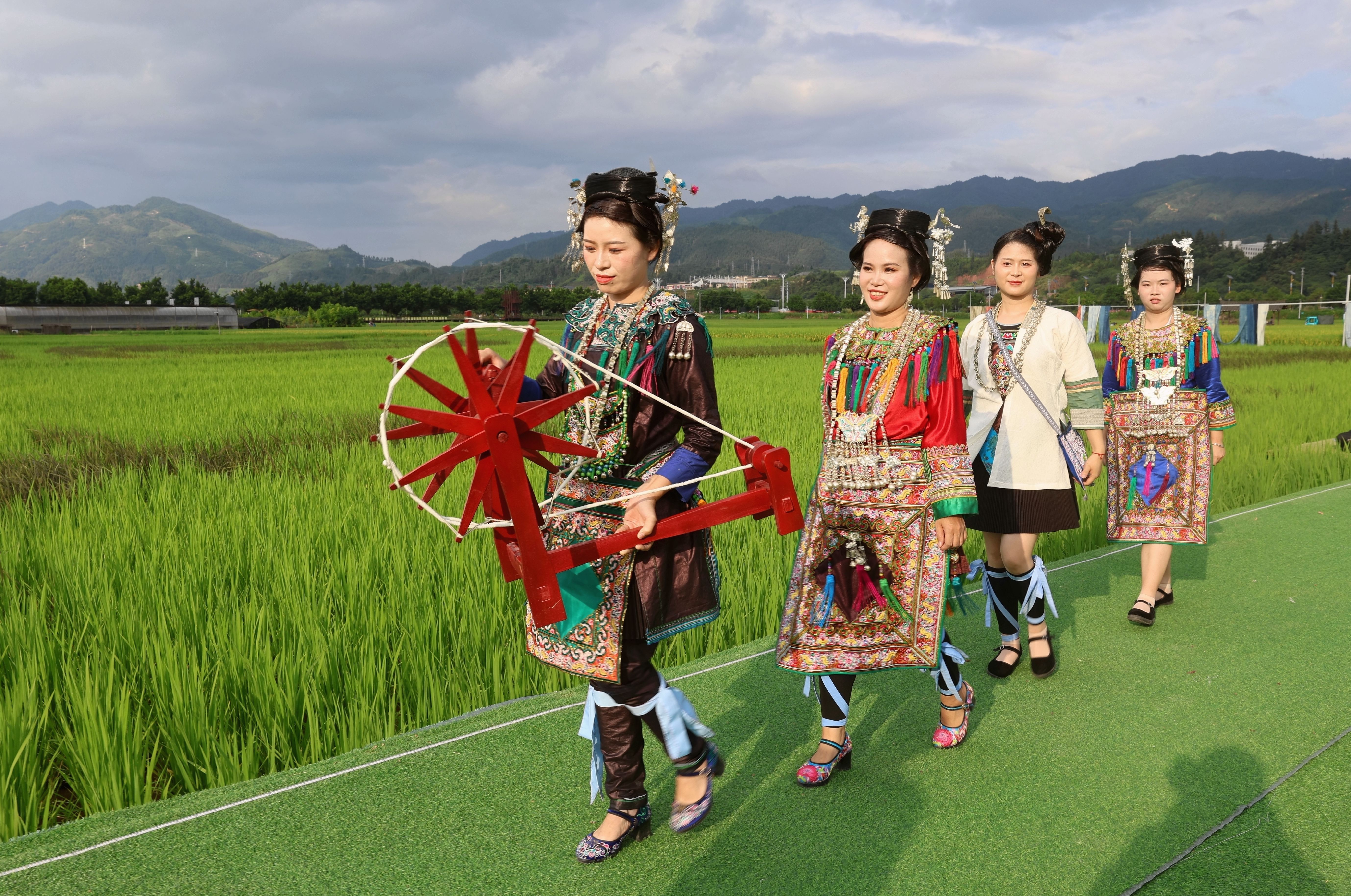 當(dāng)日,貴州省黔東南苗族侗族自治州榕江縣古州鎮(zhèn)在車江大壩田園風(fēng)光舉辦“村秀?繡未來”主題活動,當(dāng)?shù)卮迕裆碇⒀b參加“村秀?繡未來”走秀,展示她們刺繡工藝、紡織技藝、藍(lán)染制作、建筑工匠等絢麗多彩的民族文化?!按逍恪被顒邮且浴拔幕x能鄉(xiāng)村?傳統(tǒng)煥新時(shí)尚”為核心理念,旨在深度融合榕江侗族文化遺產(chǎn)與鄉(xiāng)村旅游融合發(fā)展政策,借助貴州“村超”賽事帶來的流量效應(yīng),打造集“非遺文化+生態(tài)展示+產(chǎn)業(yè)轉(zhuǎn)化”于一體的鄉(xiāng)村旅游標(biāo)桿。舉辦極具特色的活動,吸引眾多游客前來感受獨(dú)特的民族風(fēng)情,多姿多彩的民族服飾向游客展示榕江少數(shù)民族文化魅力。