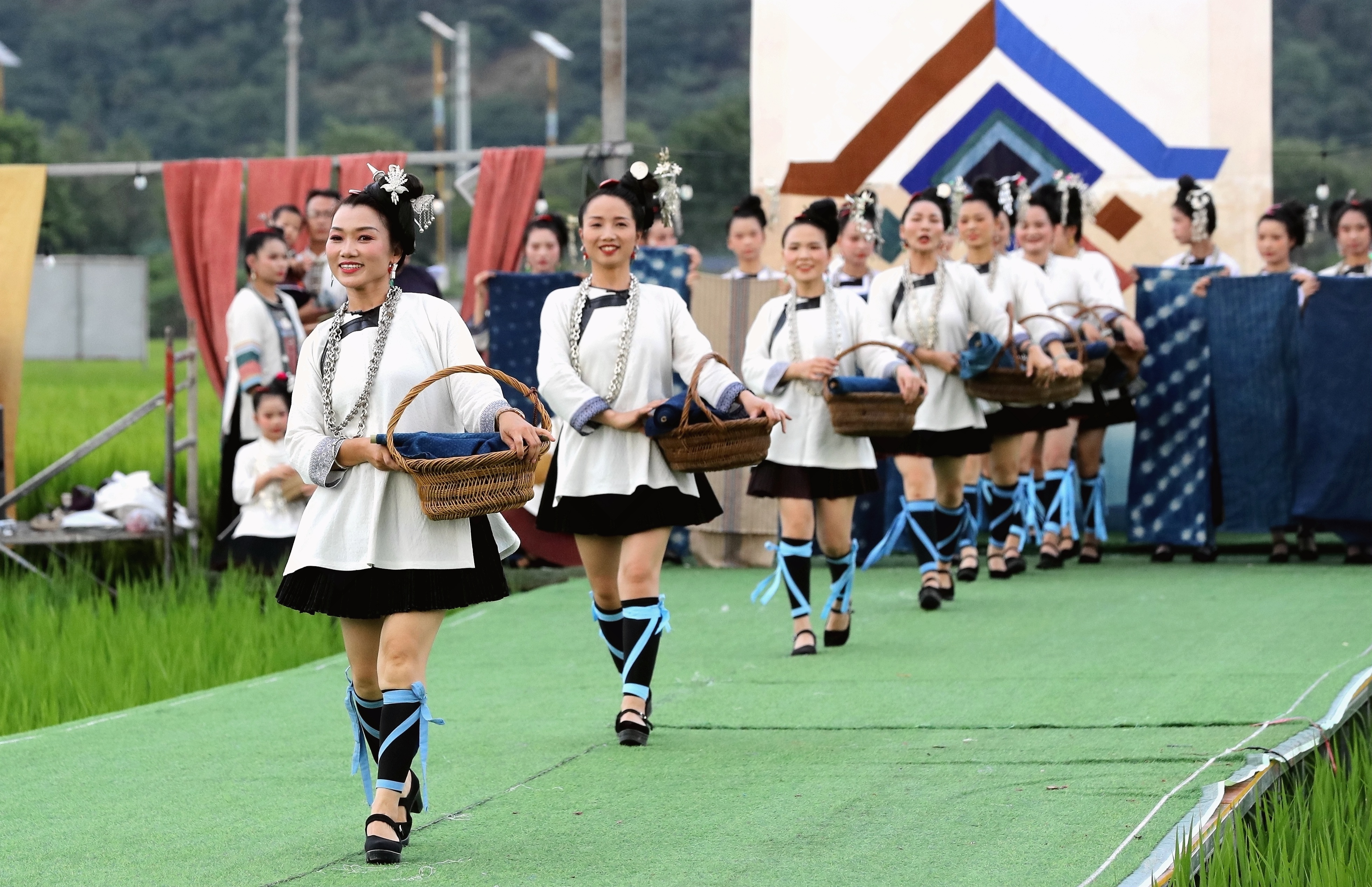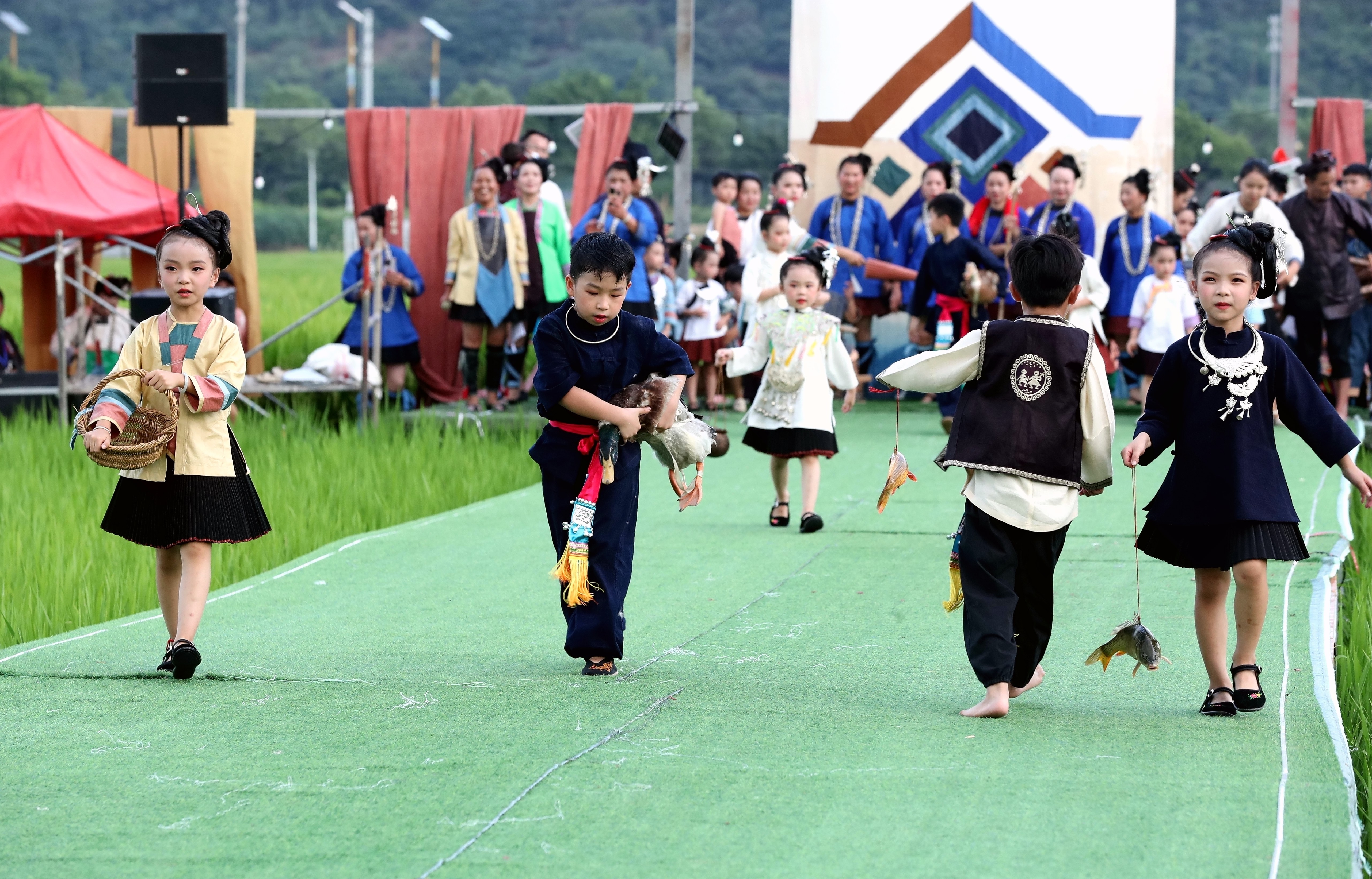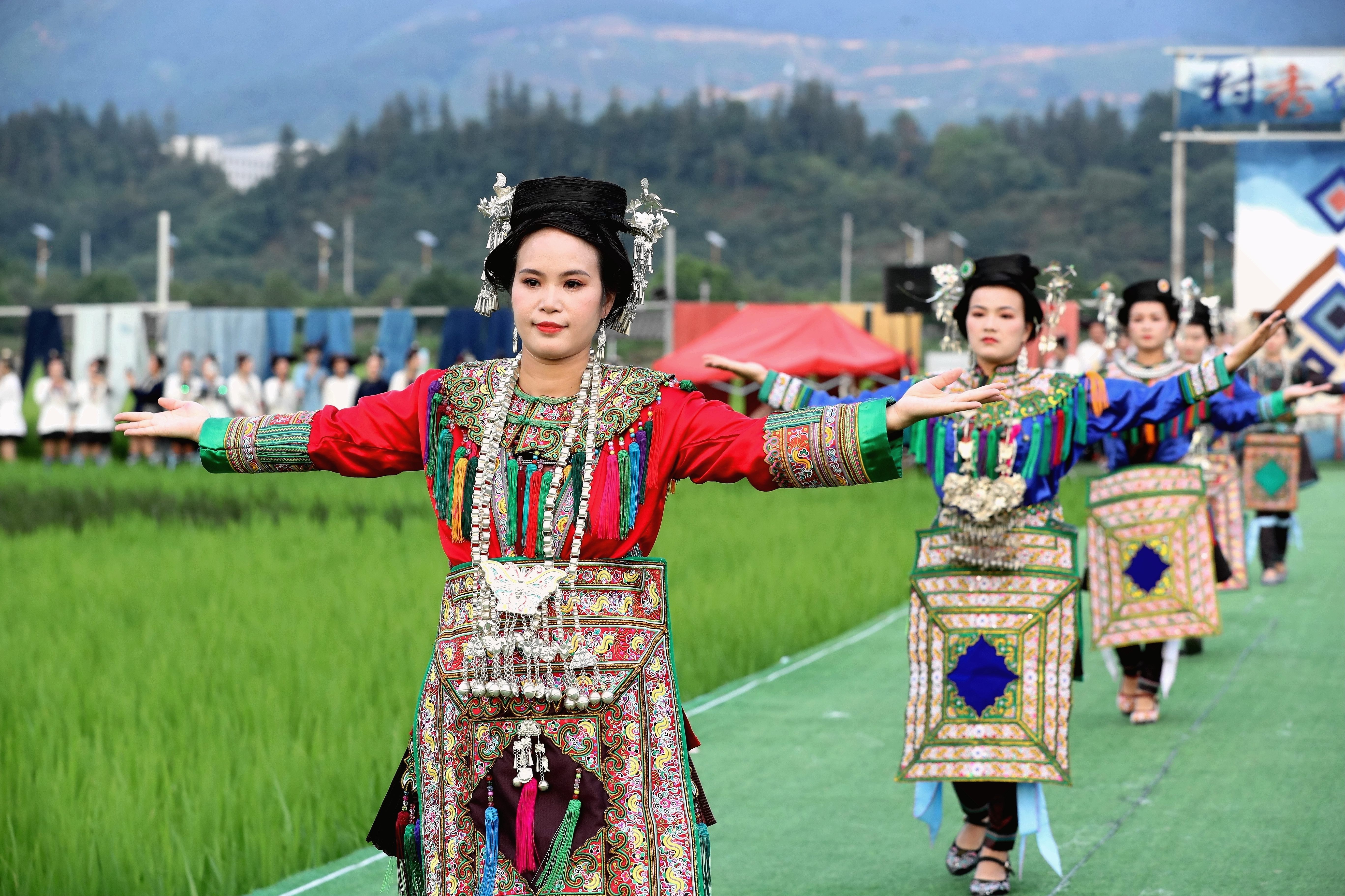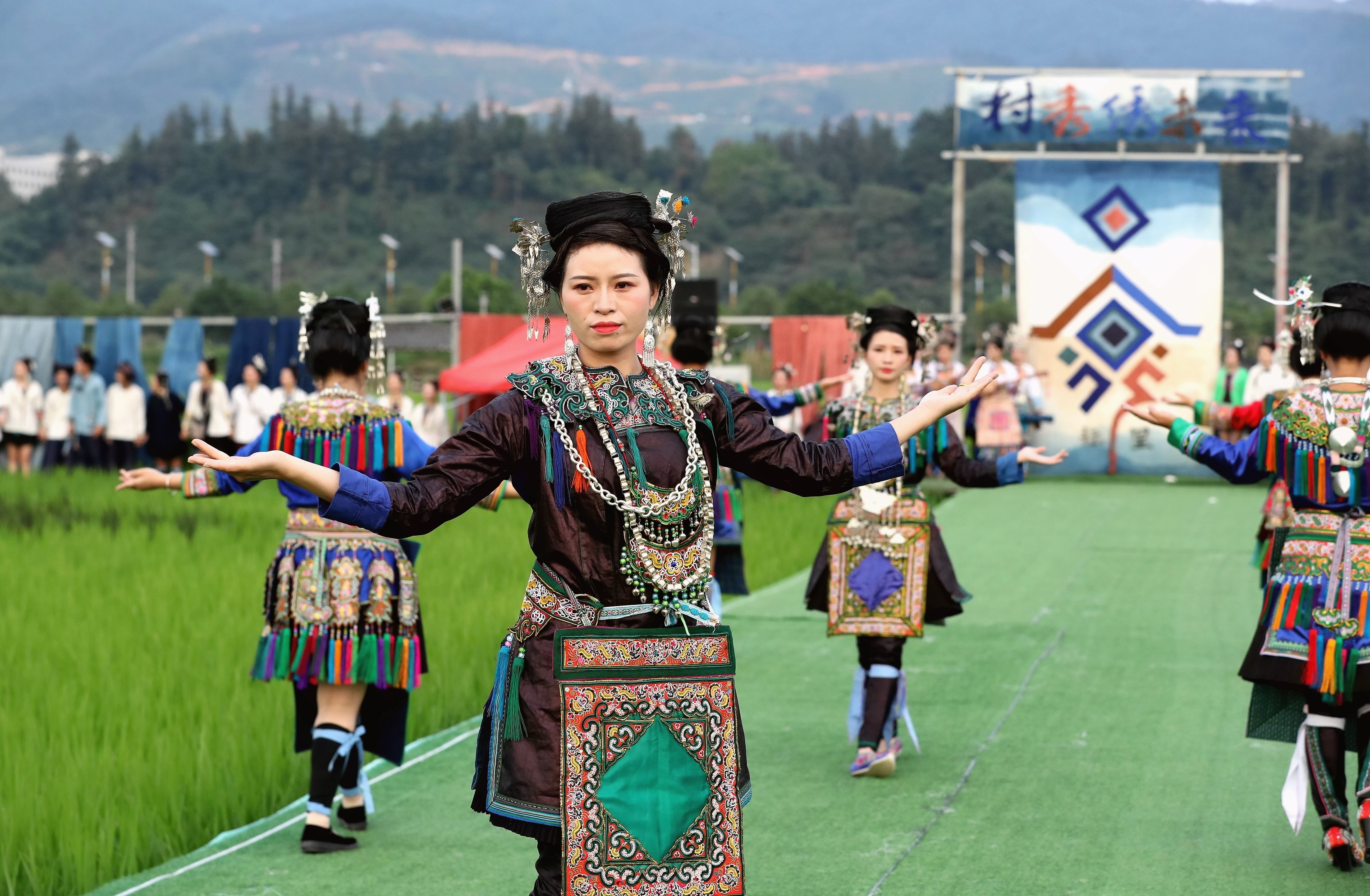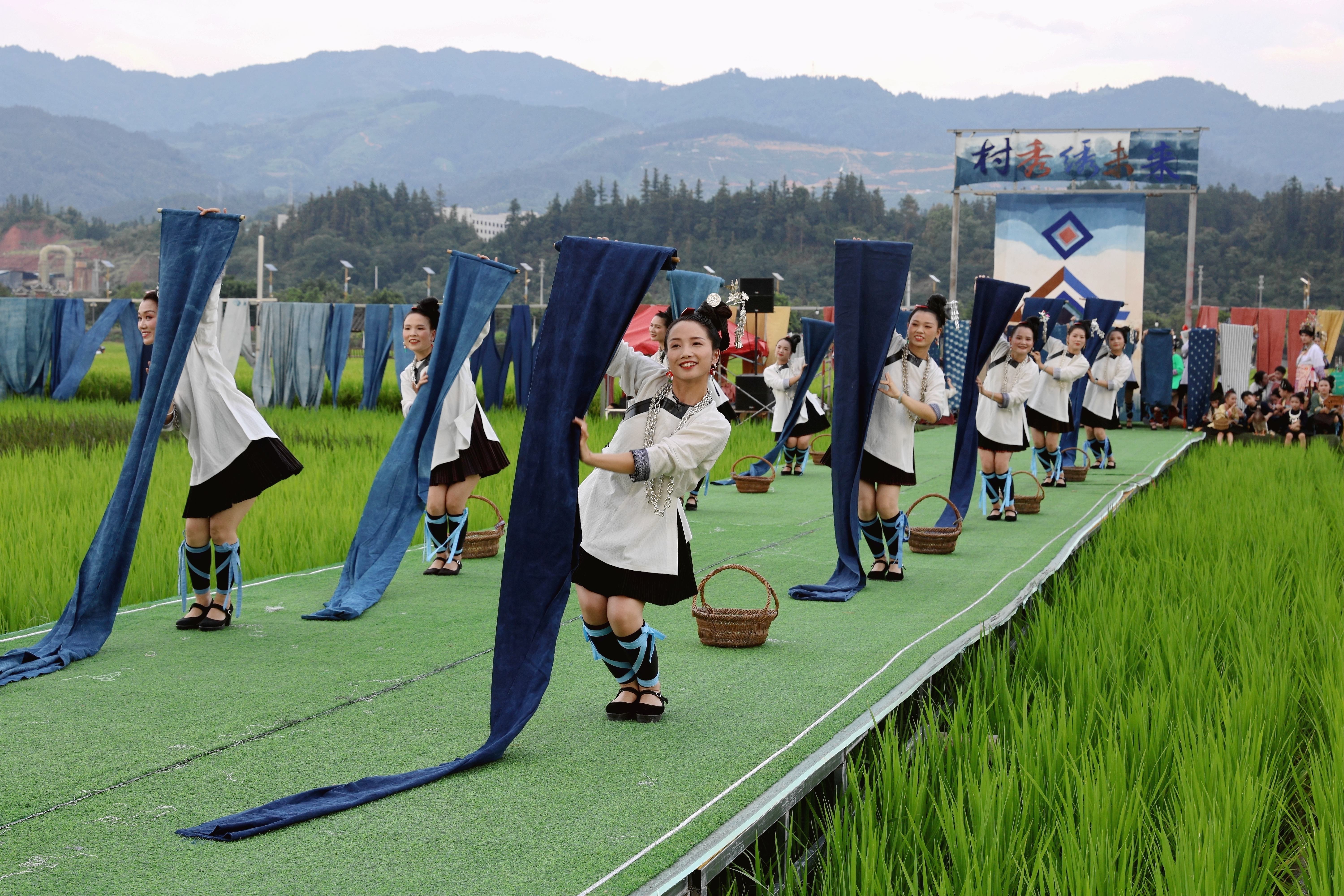 當(dāng)日,貴州省黔東南苗族侗族自治州榕江縣古州鎮(zhèn)在車江大壩田園風(fēng)光舉辦“村秀?繡未來”主題活動,當(dāng)?shù)卮迕裆碇⒀b參加“村秀?繡未來”走秀,展示她們刺繡工藝、紡織技藝、藍(lán)染制作、建筑工匠等絢麗多彩的民族文化?!按逍恪被顒邮且浴拔幕x能鄉(xiāng)村?傳統(tǒng)煥新時(shí)尚”為核心理念,旨在深度融合榕江侗族文化遺產(chǎn)與鄉(xiāng)村旅游融合發(fā)展政策,借助貴州“村超”賽事帶來的流量效應(yīng),打造集“非遺文化+生態(tài)展示+產(chǎn)業(yè)轉(zhuǎn)化”于一體的鄉(xiāng)村旅游標(biāo)桿。舉辦極具特色的活動,吸引眾多游客前來感受獨(dú)特的民族風(fēng)情,多姿多彩的民族服飾向游客展示榕江少數(shù)民族文化魅力。