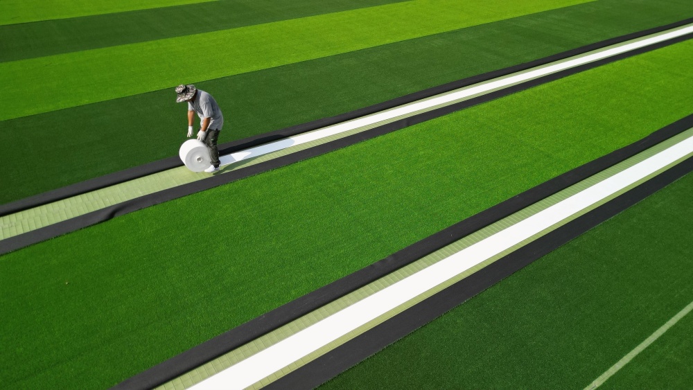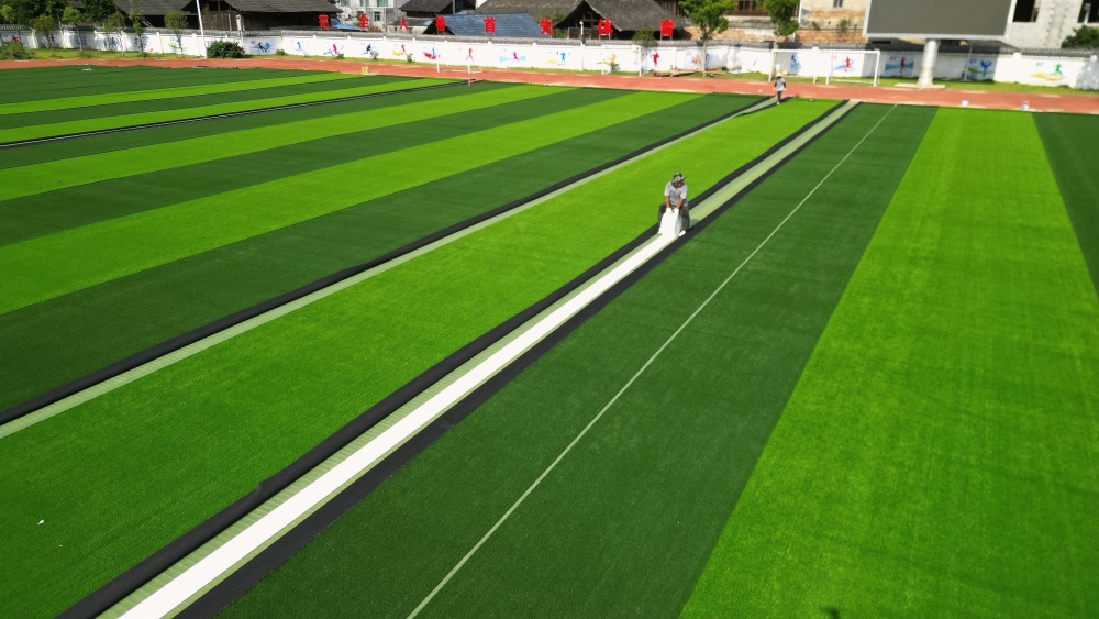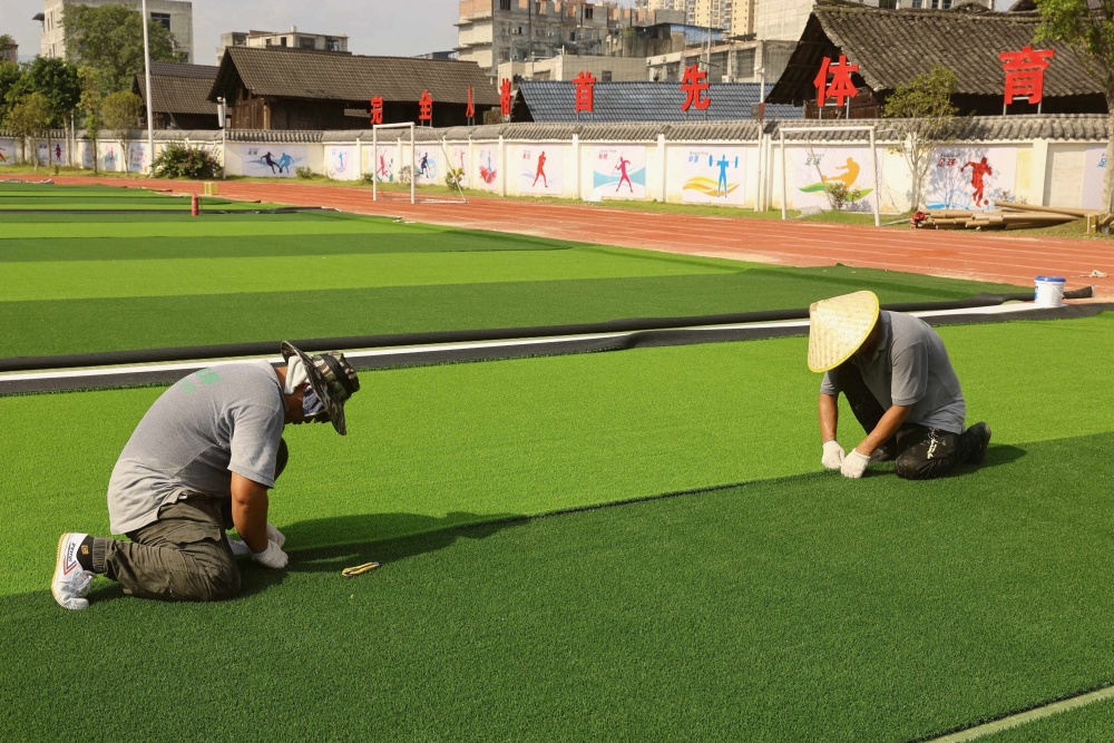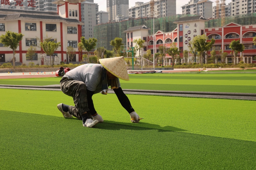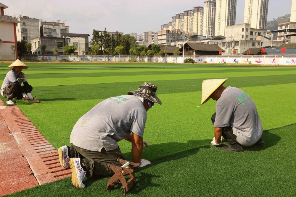 8月11日,工人在貴州省黔東南苗族侗族自治州榕江縣古州鎮(zhèn)第六小學足球場鋪設免填充人造草坪(無人機照片)。