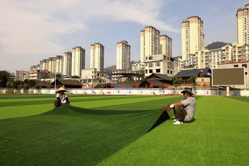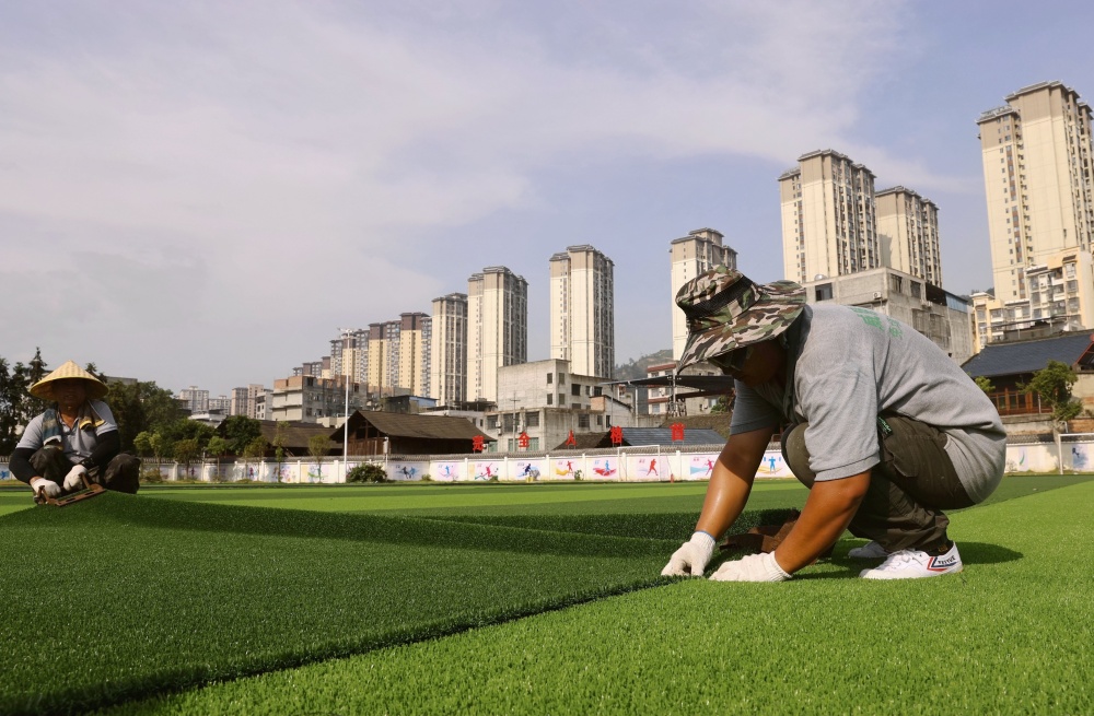 貴州榕江:災后10所校園足球場重建正酣