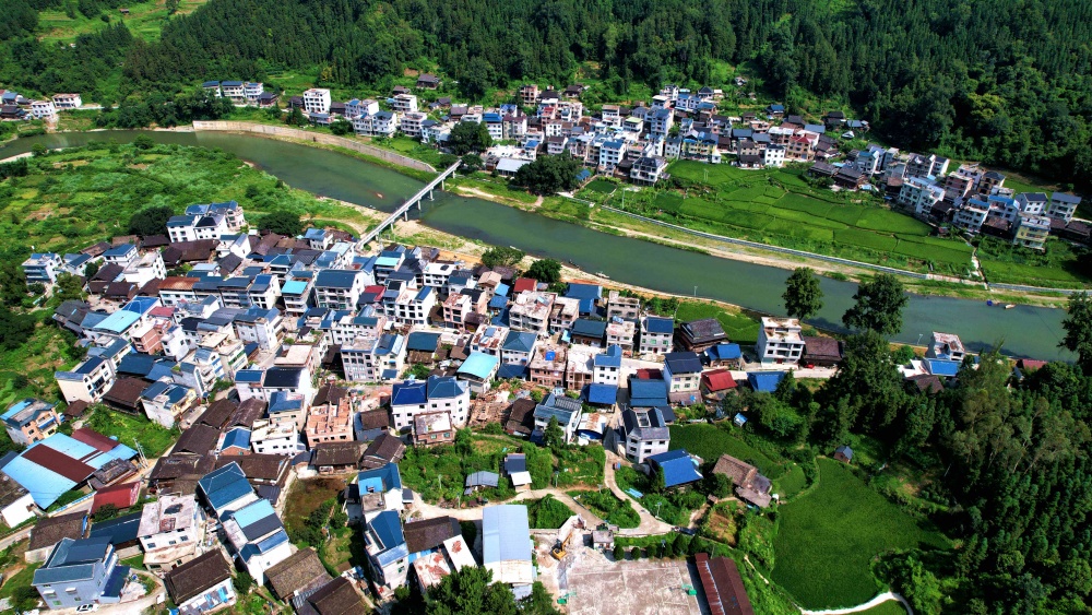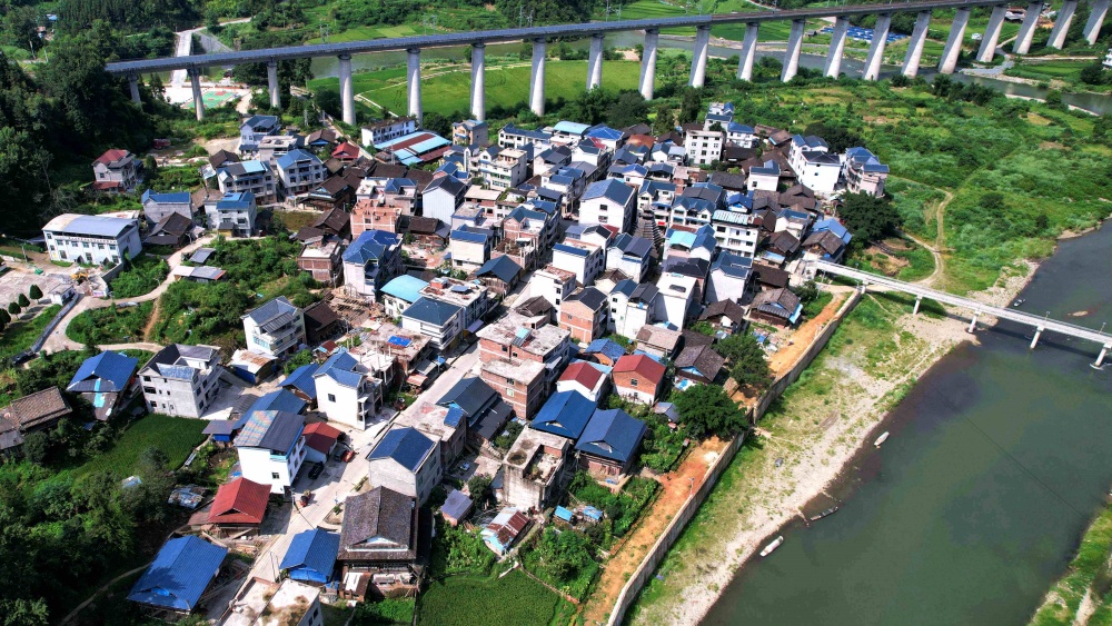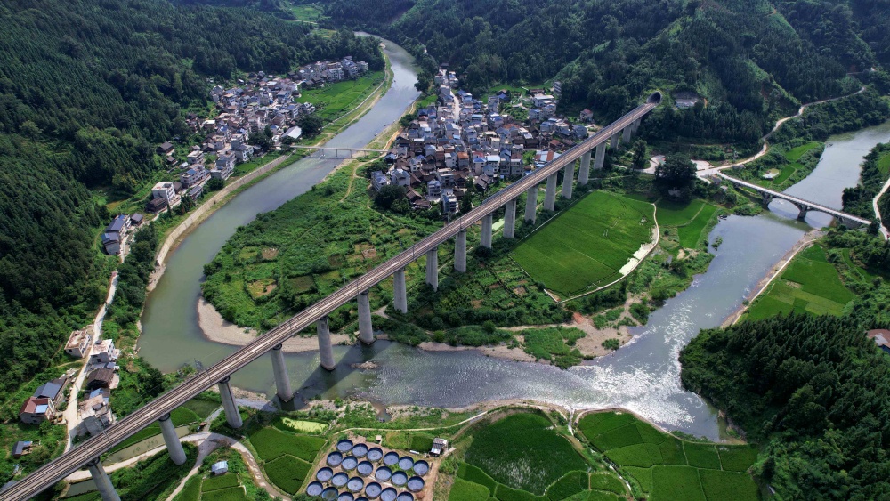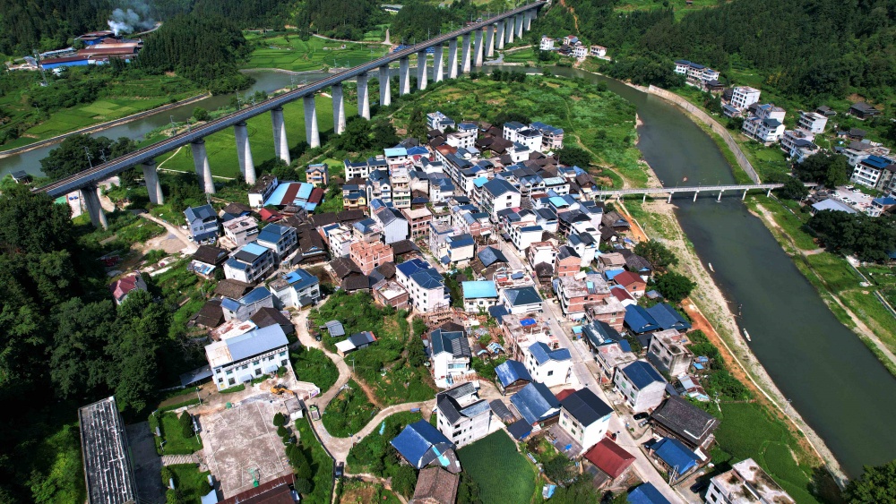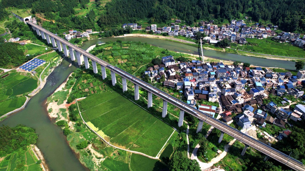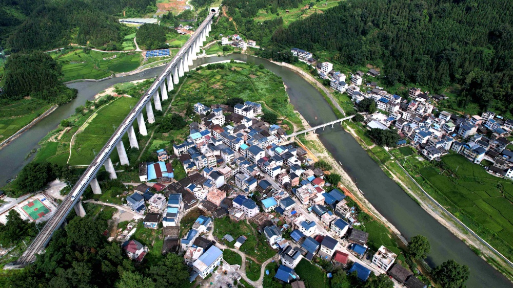 時下,列車在貴州省從江縣谷坪鄉(xiāng)幫土村高架橋穿過,高架橋與青山、侗寨、河流相映成趣,構成一幅美麗的秋日畫卷。