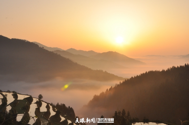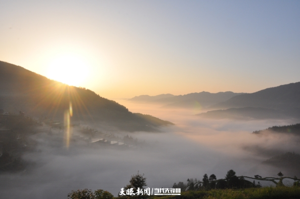 清晨,來(lái)到寨子時(shí),整個(gè)苗家村寨浸在朦朧的暗光里,輪廓顯得有些模糊,村后林木幽黑一片。漸漸地,暗色隱退,白亮的天色凸顯出來(lái)。山谷里,霧很安靜,不動(dòng)聲色地躺臥,沒(méi)有一絲躁動(dòng)。東邊的天空越來(lái)越亮,染著淡淡的暖色。轉(zhuǎn)眼間,暖色越來(lái)越濃,一會(huì)兒,太陽(yáng)從對(duì)面山頭上灑下彤紅的光芒,幾只早起的鴿子撲扇著翅膀呈弧形從苗家村寨上空飛過(guò),然后落在鄉(xiāng)政府大樓的樓頂上,不久又飛起來(lái),就再也尋不到蹤影。