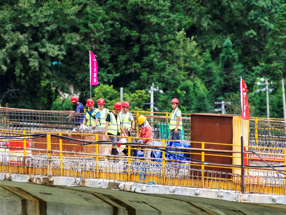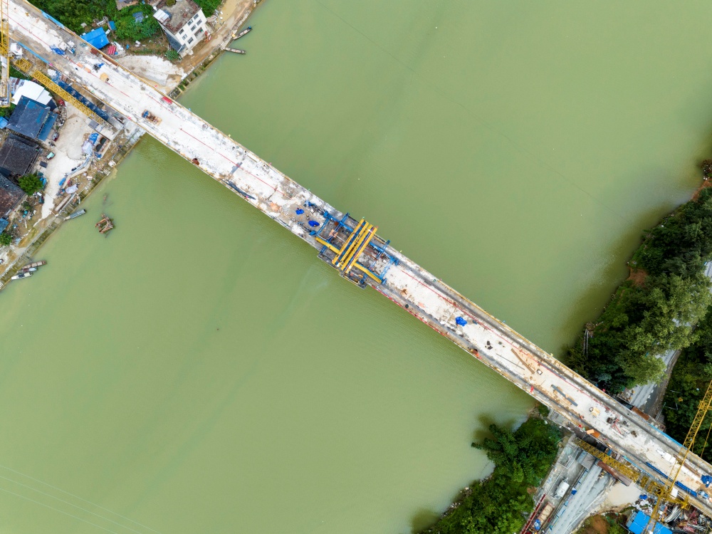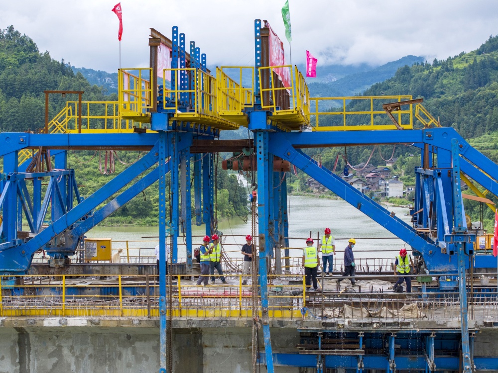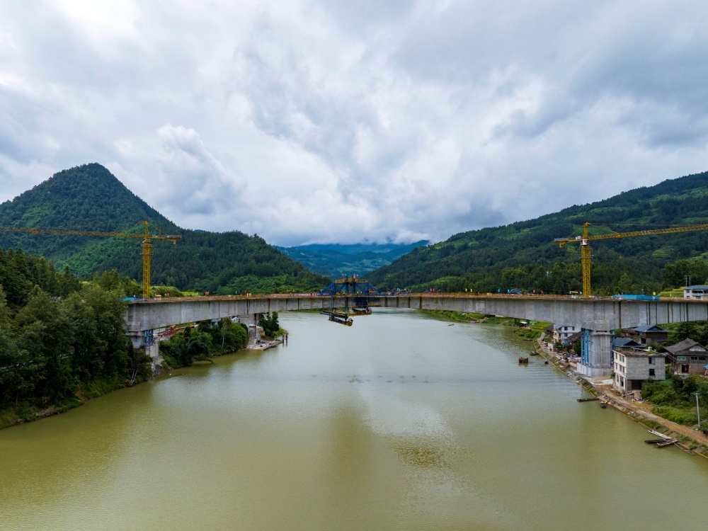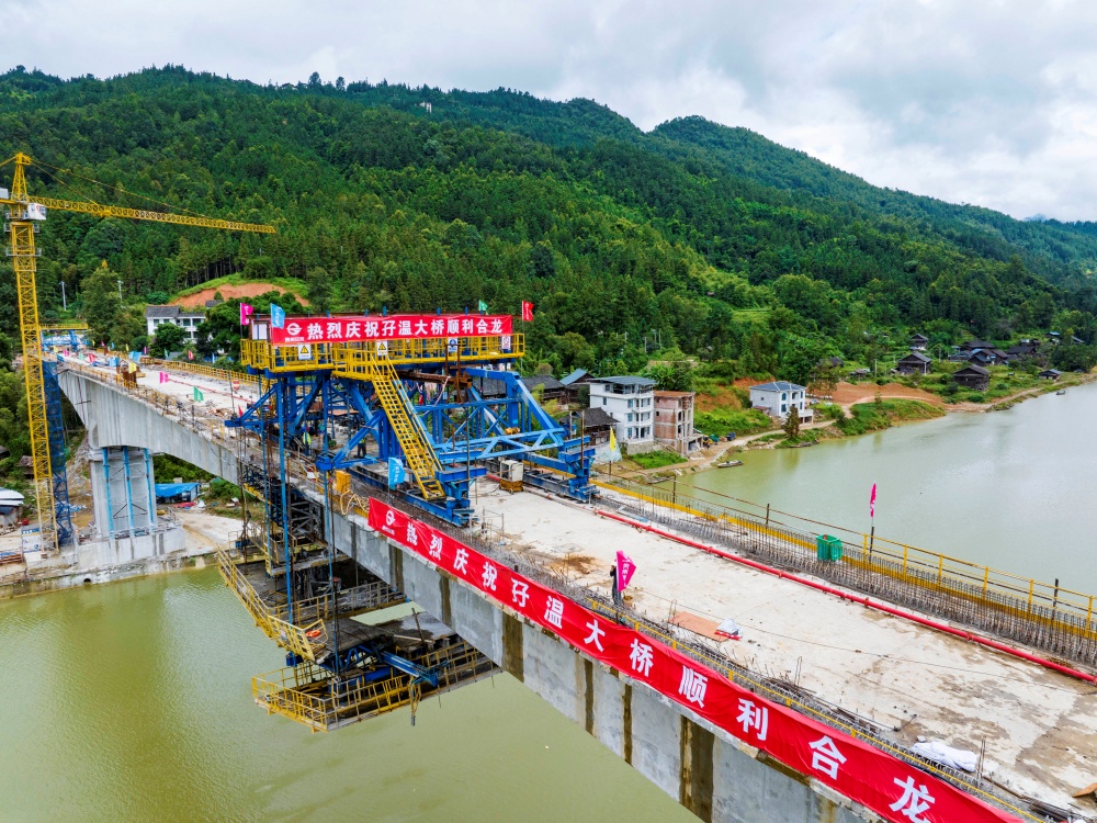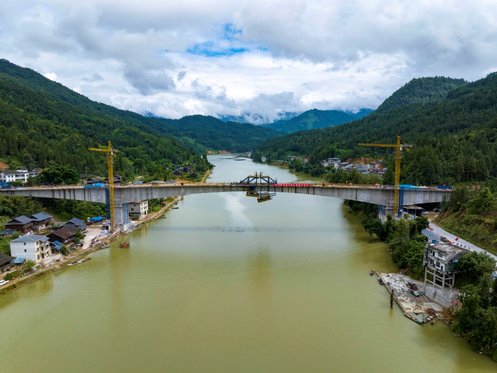 8月19日,工人在貴州省從江縣下江鎮(zhèn)孖溫大橋建設現(xiàn)場進行大橋合龍后的收尾作業(yè)(無人機照片)。