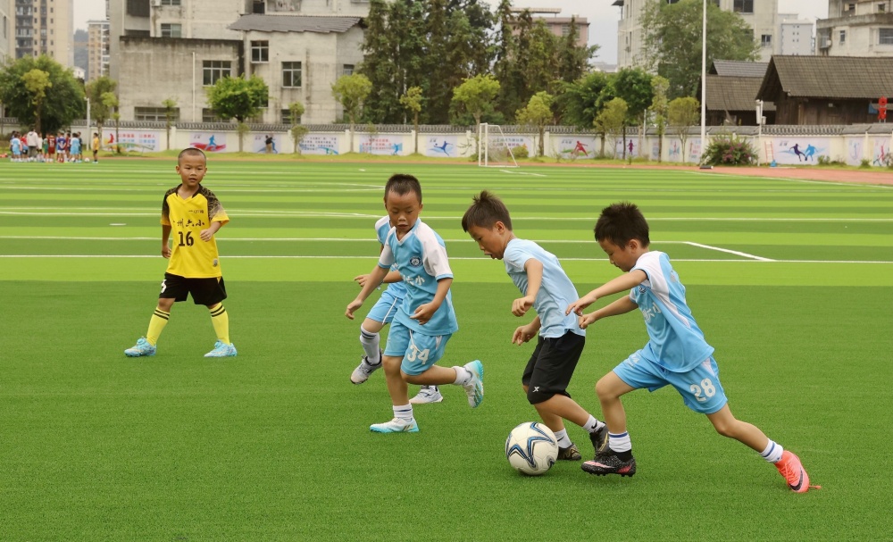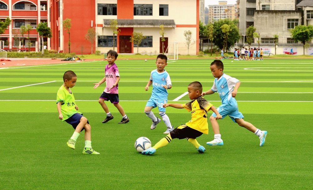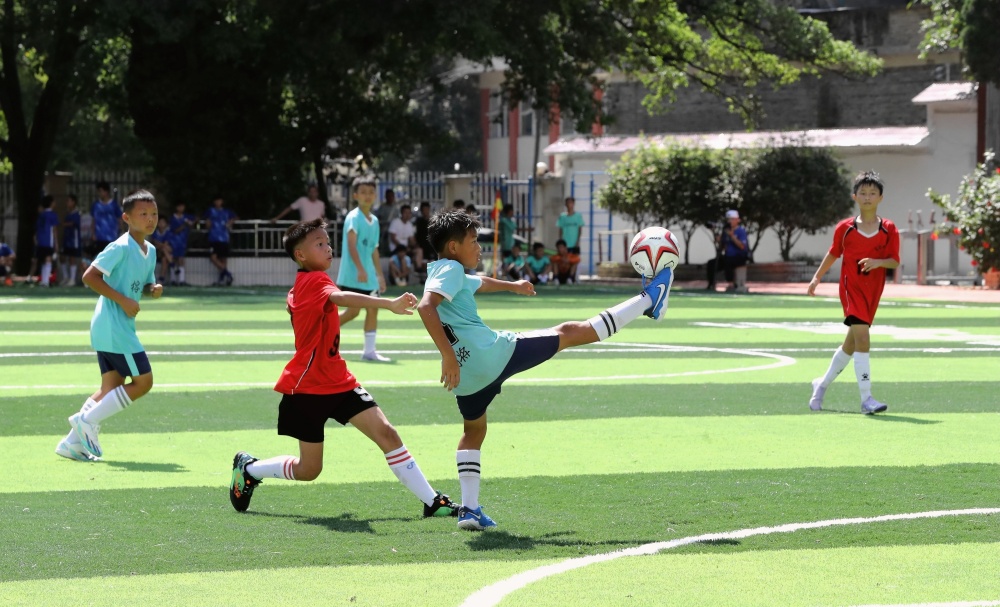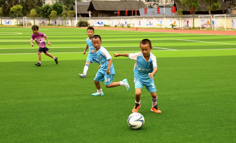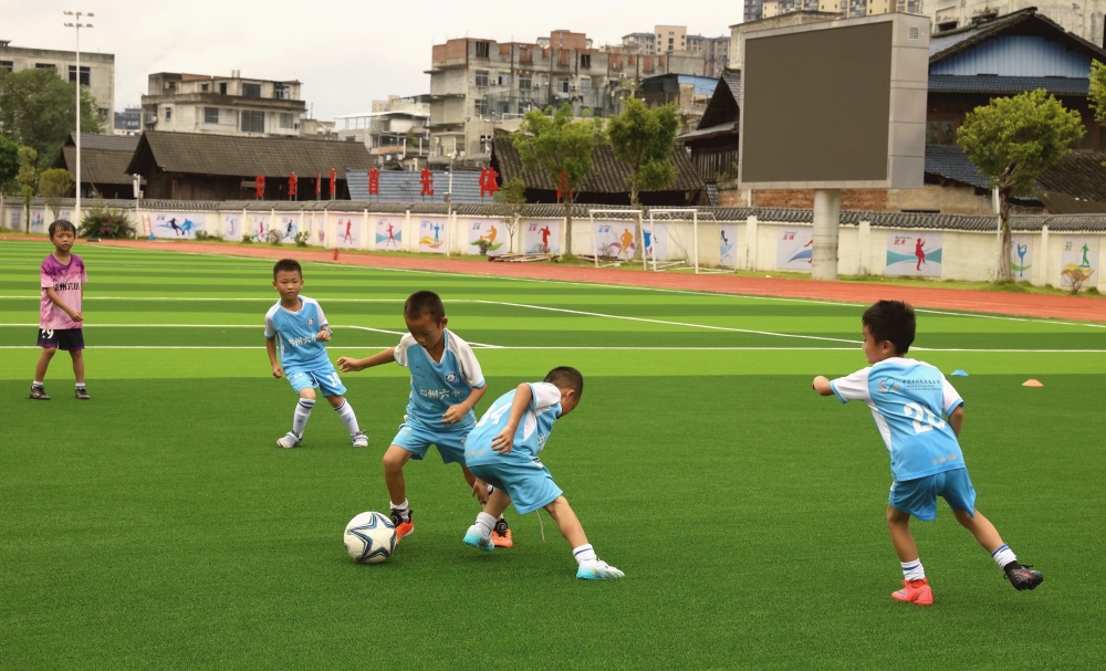 8月19日,小朋友在貴州省黔東南苗族侗族自治州榕江縣古州鎮(zhèn)第六小學(xué)新建的足球場練球。