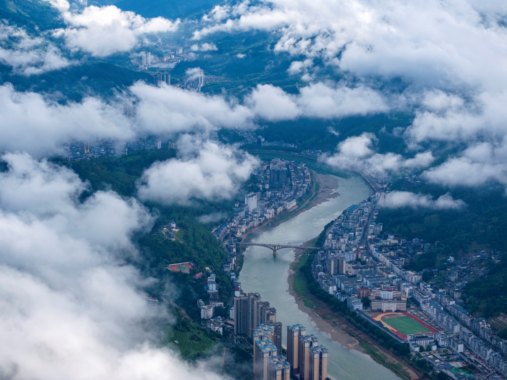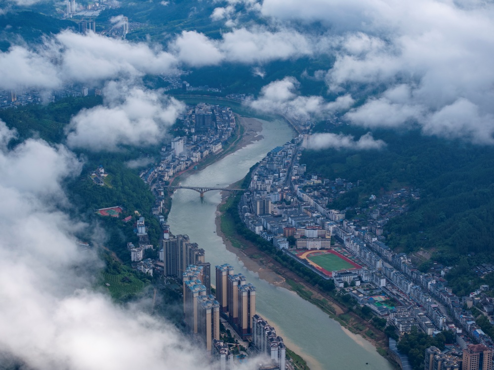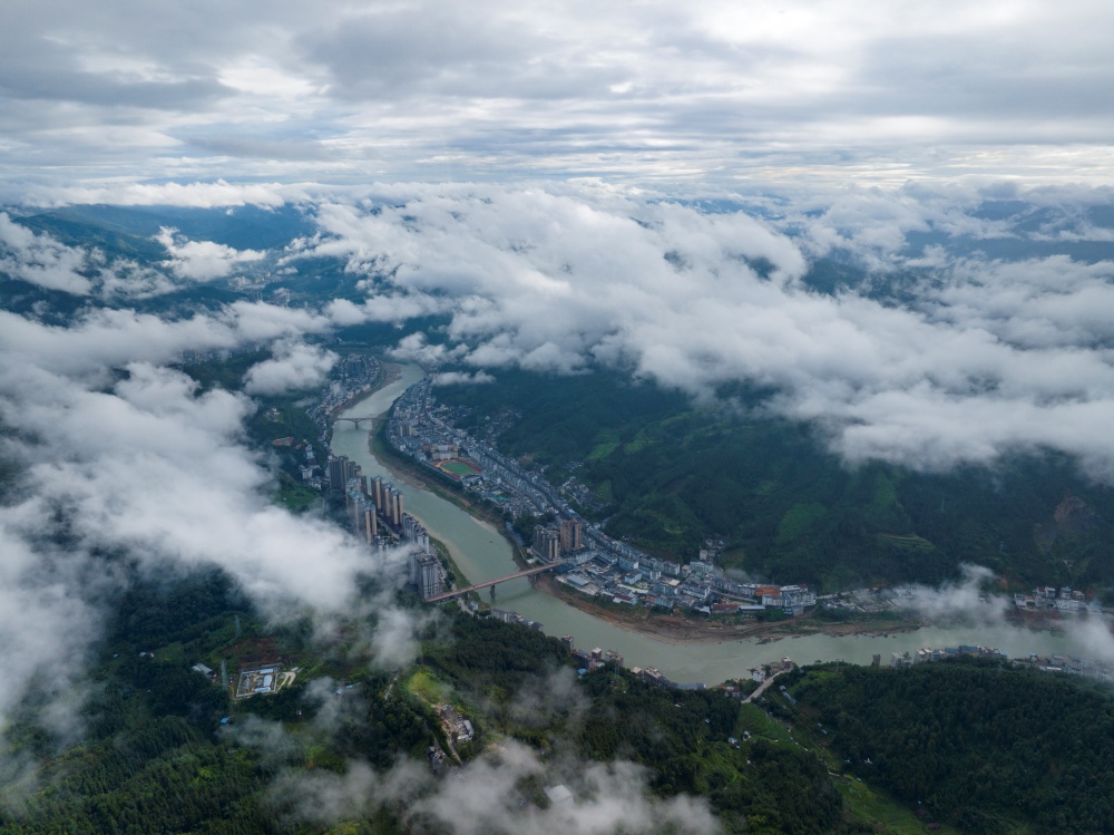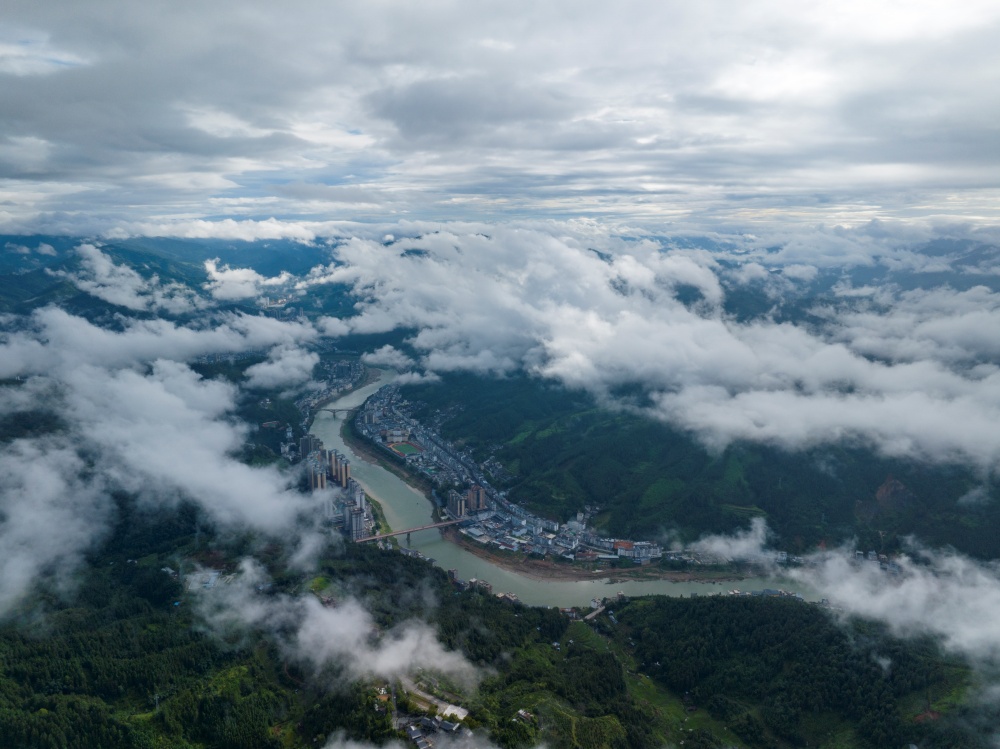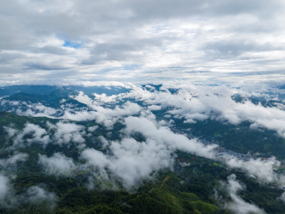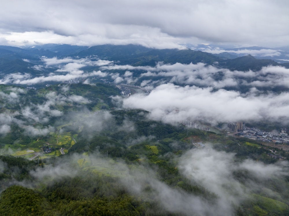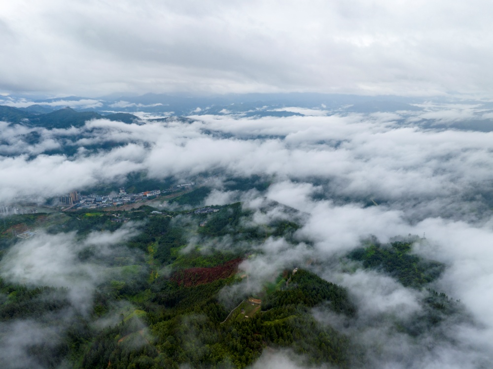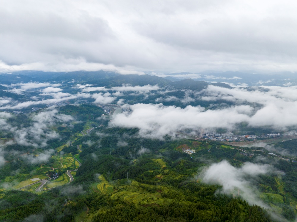 當日,雨后初晴,貴州省黔東南苗族侗族自治州從江縣城上空云霧繚繞,城市建筑、道路、橋梁、青山、田園、河流在云霧的籠罩下,若隱若現(xiàn),宛如仙境。