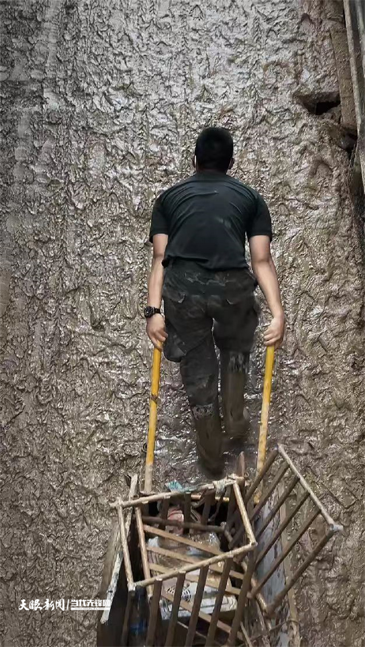 在榕江縣古州鎮(zhèn)東門(mén)村七街,垃圾堆積如山,近三米高,且?jiàn)A雜著沙發(fā)、床墊等大件物品。馬東昇和戰(zhàn)友們只能徒手清理,一點(diǎn)點(diǎn)摳出淤泥中的雜物,再抬出小巷。小巷出口處,一條25米長(zhǎng)的45度陡坡成了清淤的難題。救援機(jī)器無(wú)法進(jìn)入,只能依靠小推車(chē)運(yùn)輸。