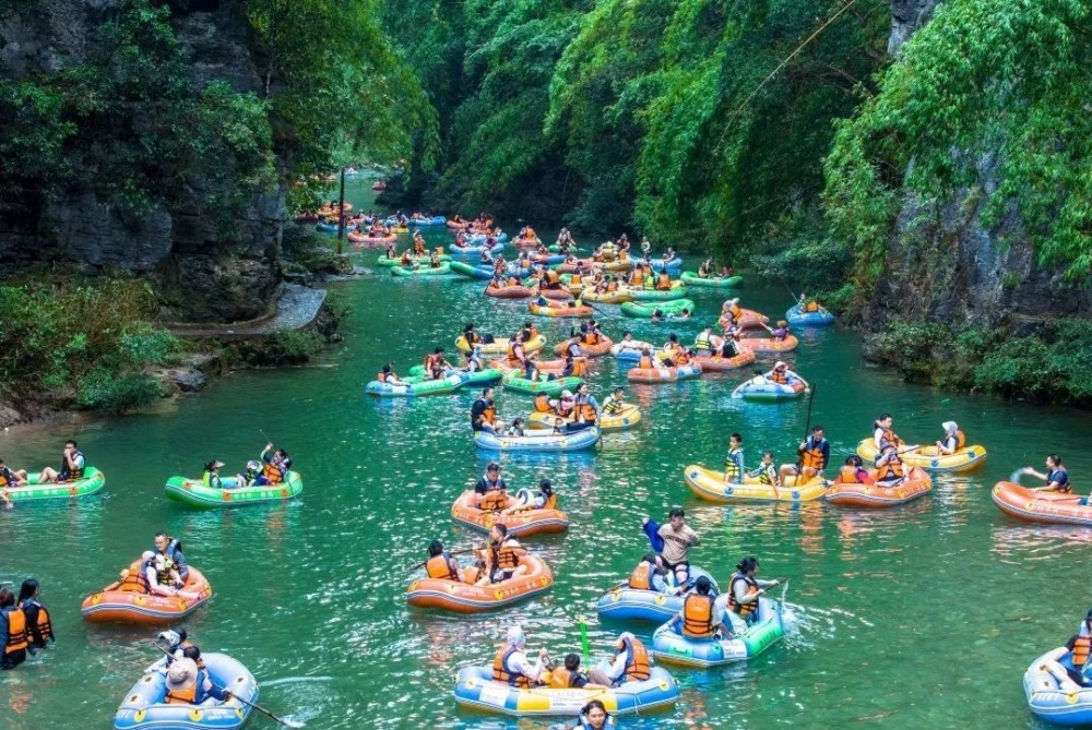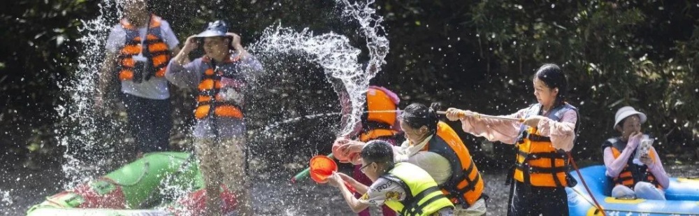 在施秉縣杉木河景區(qū),清澈見底的河水蜿蜒于峽谷之間,兩岸植被郁郁蔥蔥,為炎炎夏日帶來絲絲涼意。這里的漂流項(xiàng)目備受親子家庭青睞,平緩河段適合全家輕松戲水,時(shí)而出現(xiàn)的湍急水流則增添了刺激與歡樂?!疤猛胬?坐在皮筏艇上,一會(huì)兒慢悠悠地漂,一會(huì)兒又沖下小急流,濺起好大的水花,和爸爸媽媽一起玩太開心了!” 來自重慶的小朋友張宇軒興奮地說道。家長們也表示,在漂流過程中,既享受了親子互動(dòng)的樂趣,又能欣賞到如畫的自然風(fēng)光,一舉兩得。景區(qū)還配備專業(yè)護(hù)漂員全程護(hù)航,確保游客安全,讓家長們放心。