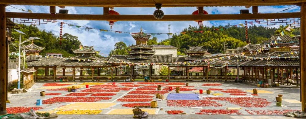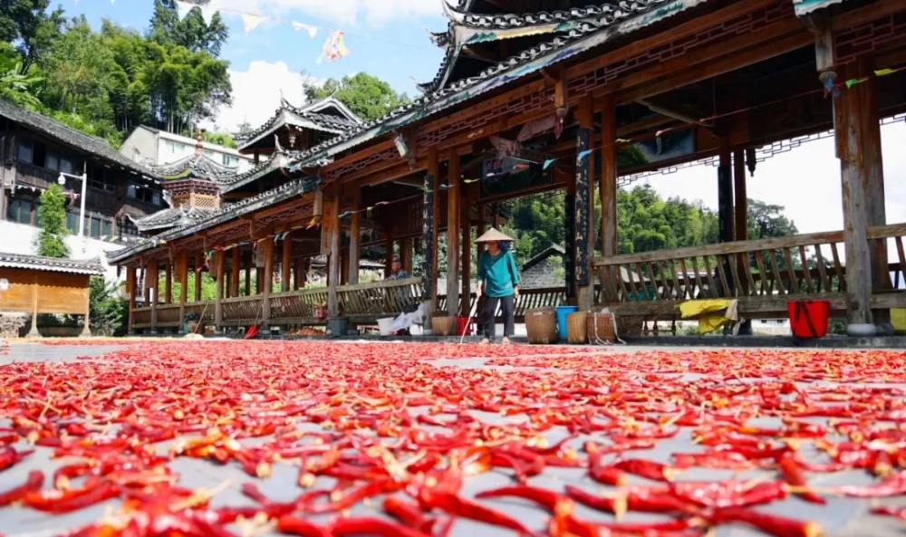 這片熱鬧的曬秋圖景,與周邊景致相映成趣:古樸的風(fēng)雨長廊下,幾位老人閑談小憩;錯落的民居炊煙裊裊,與廣場的色彩交相輝映。曬秋曬的是喜悅,晾的是希望,秀洞村村民們用這滿目的金紅,書寫著鄉(xiāng)村振興的生動篇章。
