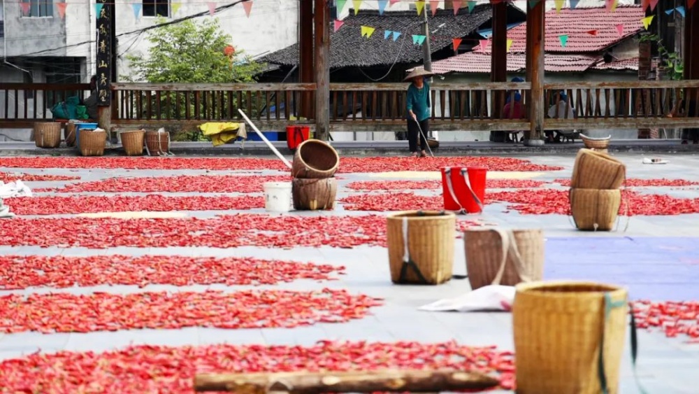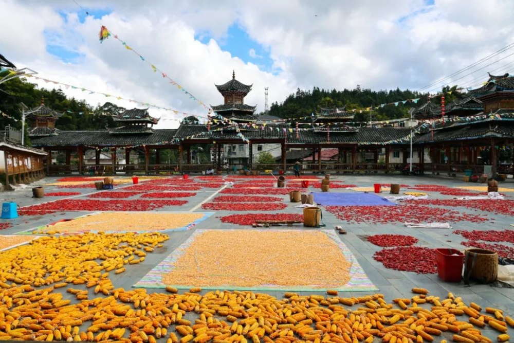 秀洞廣場上,玉米的金黃與辣椒的火紅鋪展成大片色塊,村民們往來穿梭:有的背著背篼,將紅辣椒均勻攤開;有的挑著竹籮筐,將玉米細(xì)心擺放。歡聲笑語中,飽滿的果實接受陽光的滋養(yǎng),散發(fā)著豐收的清香。