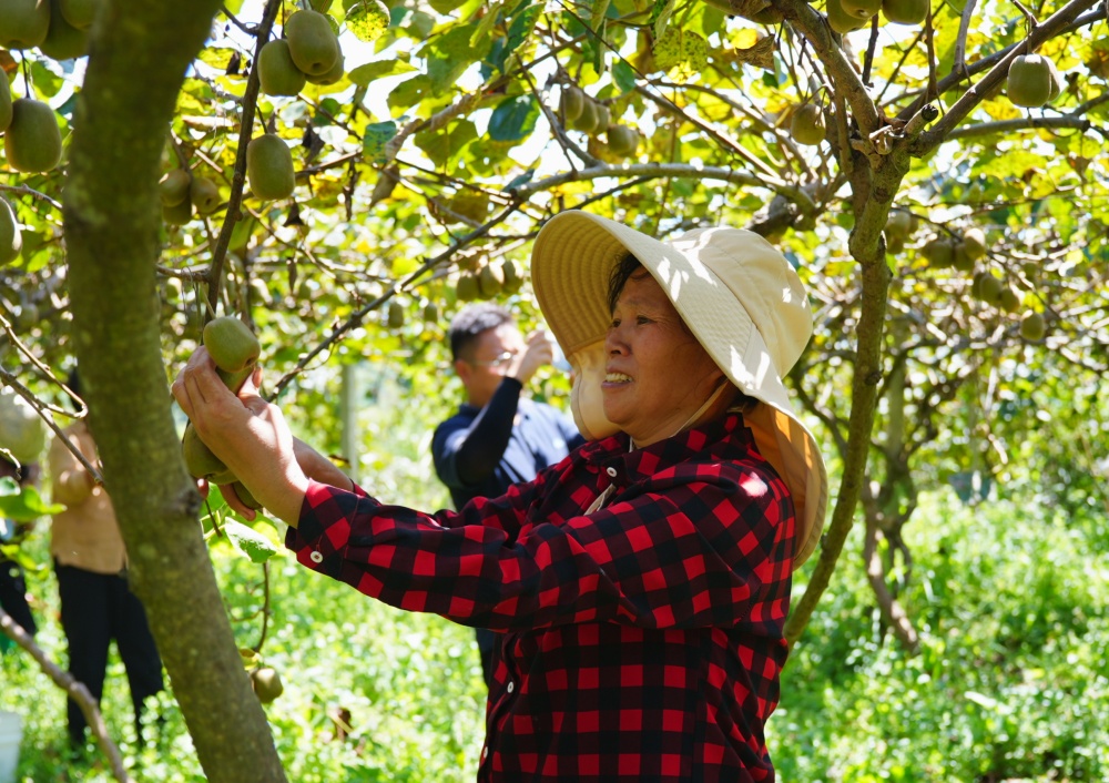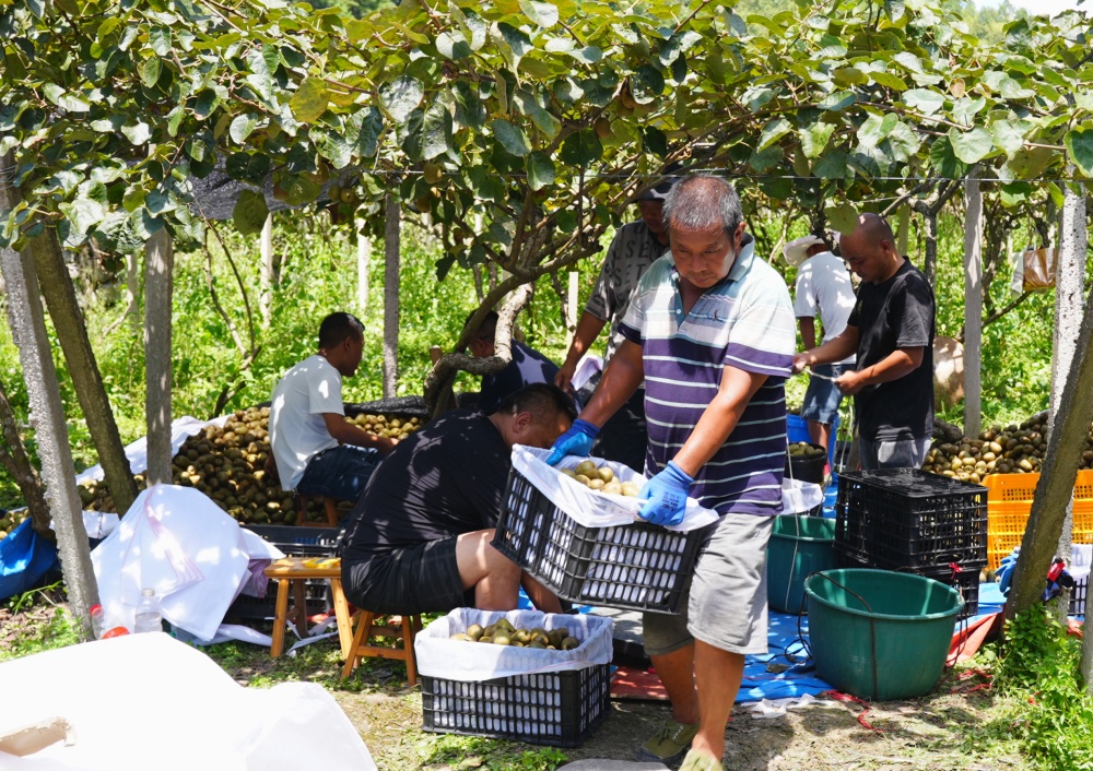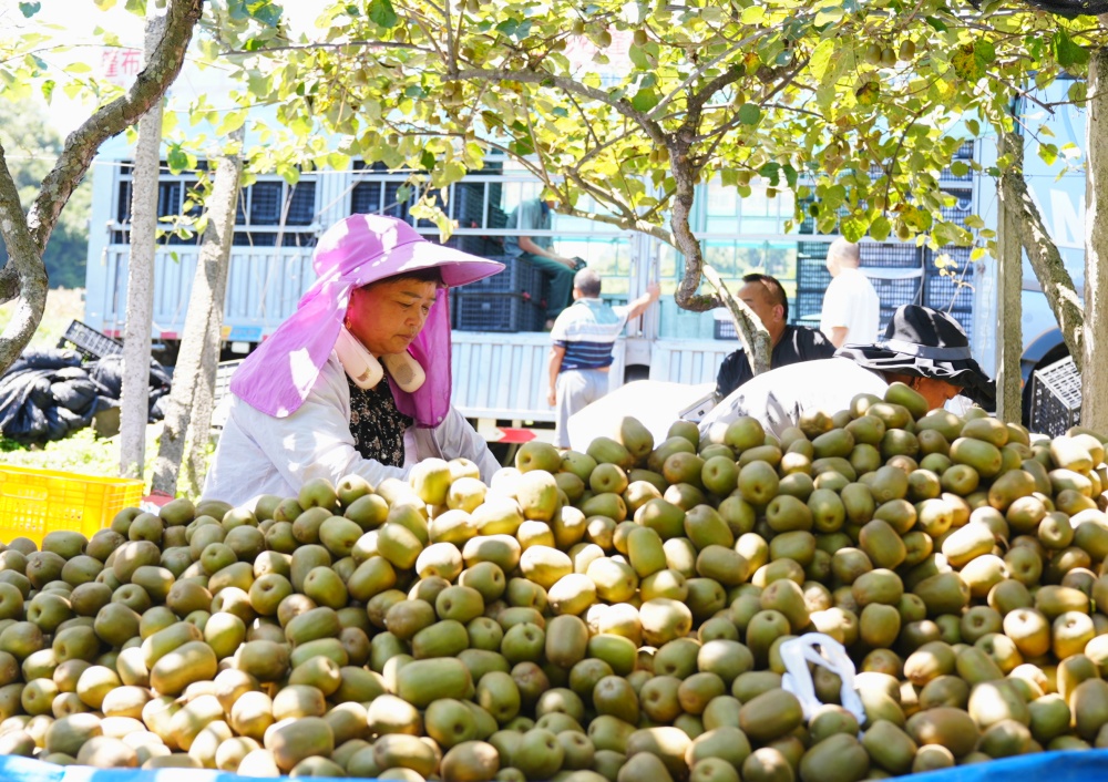 “今天陜西客商直接開大貨車來,一次就要2萬斤,我特意雇了10多人來幫忙采收,裝滿車就出發(fā)!”基地主人朱順權(quán)一邊麻利地摘果,一邊笑著介紹。他種植的30多畝紅心獼猴桃,一個(gè)月前就陸續(xù)成熟上市。采收前期主要以游客入園采摘、零散銷售為主。如今正值采收旺季,訂單紛至沓來。既有合作多年的老客戶提前鎖定貨源,也有像陜西客商史燕鋒這樣的新客戶慕名而來。