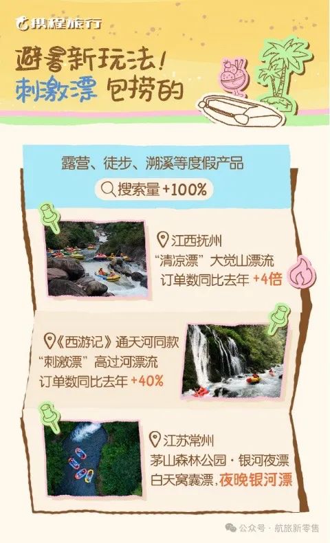 距美團(tuán)7月公布的《2025暑期熱點(diǎn)及趨勢(shì)報(bào)告》之后,攜程于8月25日發(fā)布《2025暑期出游市場(chǎng)報(bào)告》顯示,7月全國(guó)平均氣溫刷新同期紀(jì)錄,“清涼”成為暑期旅游第一關(guān)鍵詞。威海、黔東南、秦皇島、大連、青島、煙臺(tái)、安吉、桂林、大理白族自治州、貴陽(yáng)等平均氣溫不超過(guò)30℃的目的地,攜手沖進(jìn)攜程口碑榜“暑期十大玩水避暑目的地”。有《西游記》通天河同款之稱的高過(guò)河漂流則全長(zhǎng)5公里,落差200米的“刺激漂”攬獲年輕人喜愛,成交訂單數(shù)同比增加40%。