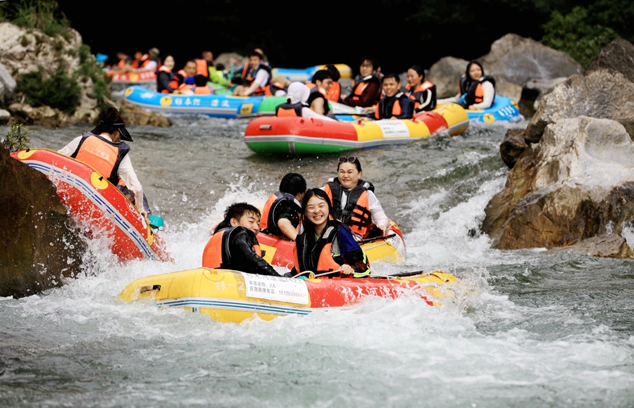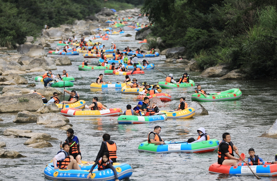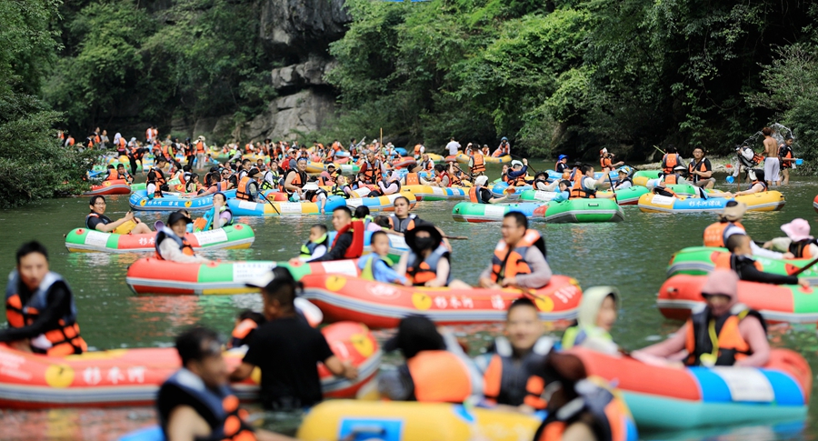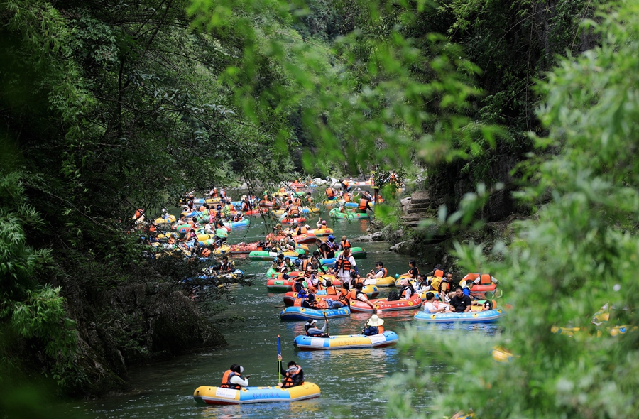 暑期期間,位于貴州省黔東南苗族侗族自治州施秉縣的杉木河景區(qū),峽谷幽深,樹木蔥翠,流水清澈,景色宜人,良好的生態(tài)環(huán)境吸引眾多游客前來漂流戲水,避暑納涼。