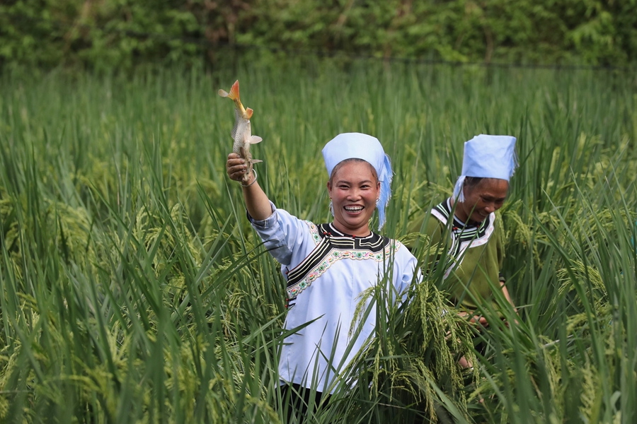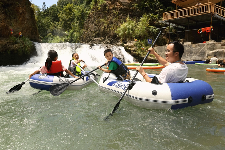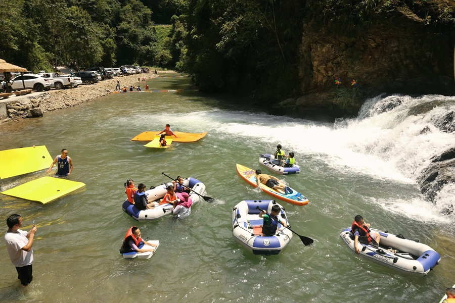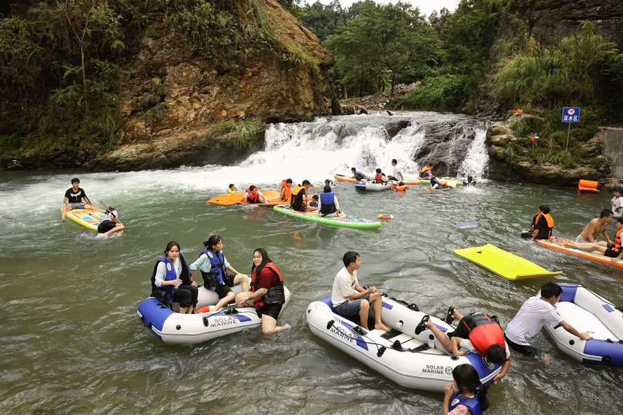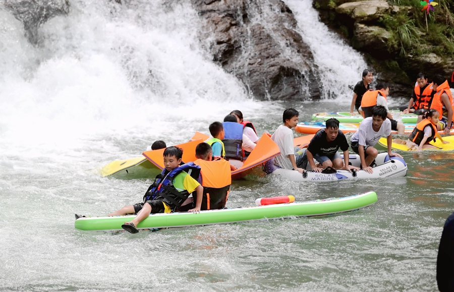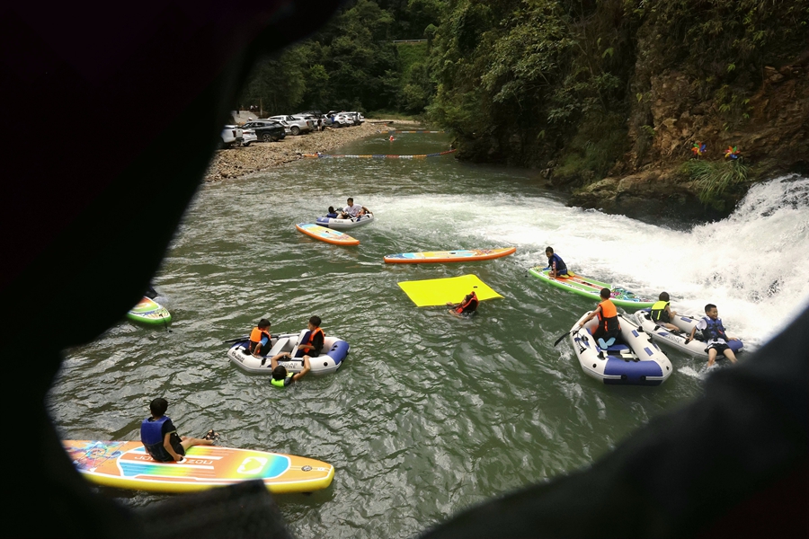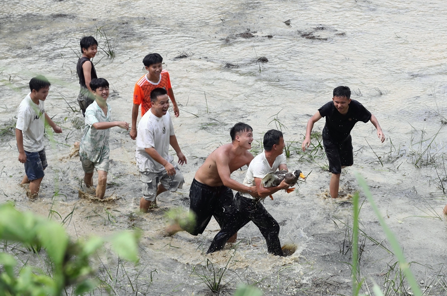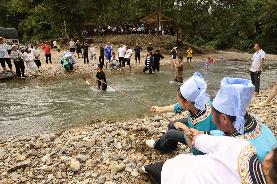 榕江縣水尾鄉(xiāng)水尾村月亮灣,游客參與水中游玩、摸螺螄比賽、抓魚比賽、抓鴨比賽、水上拔河、水族文化展示等,讓游客沉浸式享歡樂。