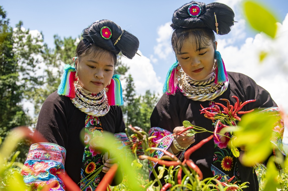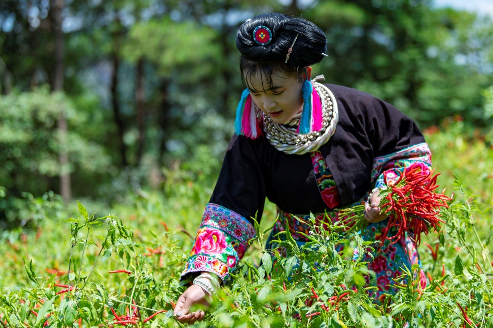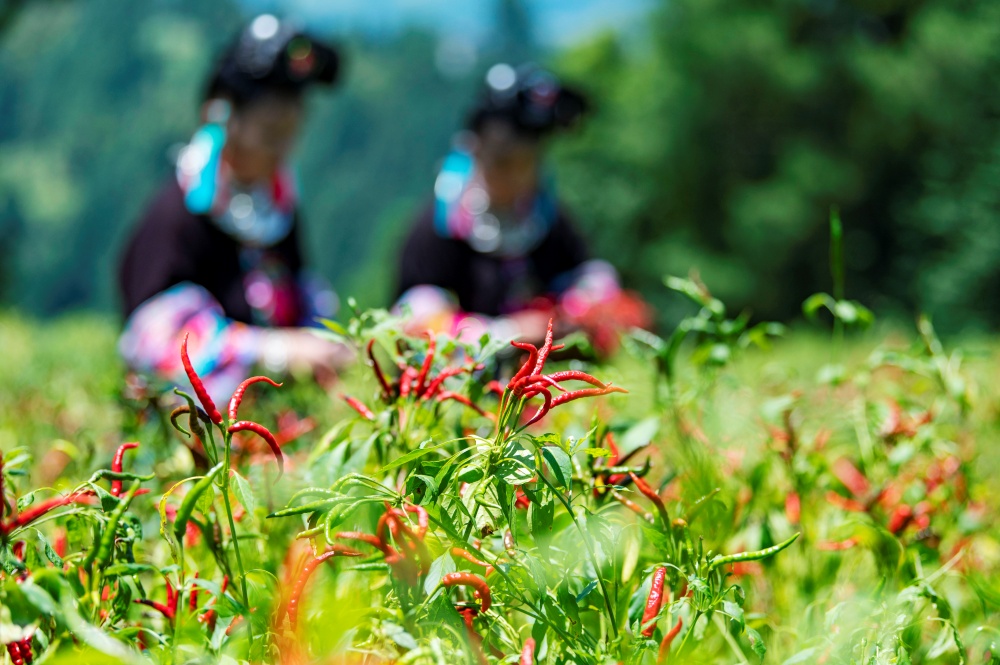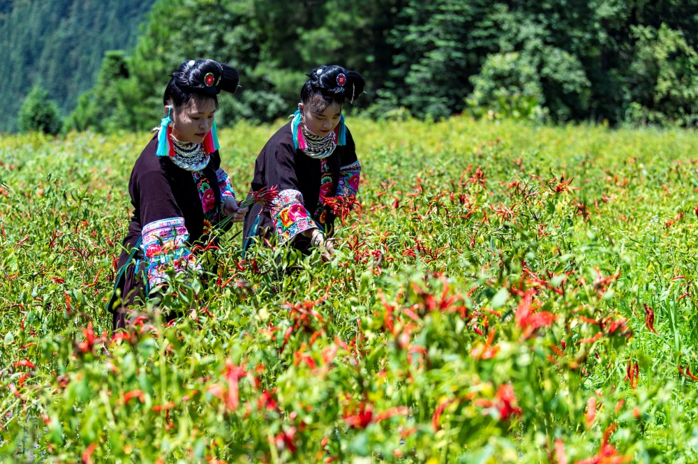 8月28日,在貴州省從江縣東朗鎮(zhèn)擺阿苗寨,村民在采收朝天椒。