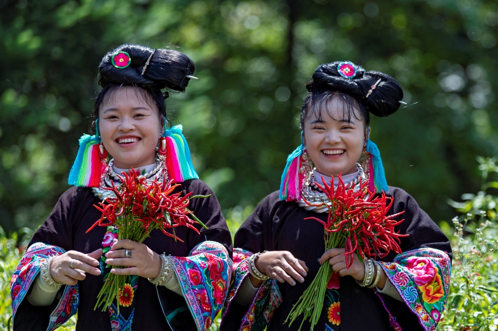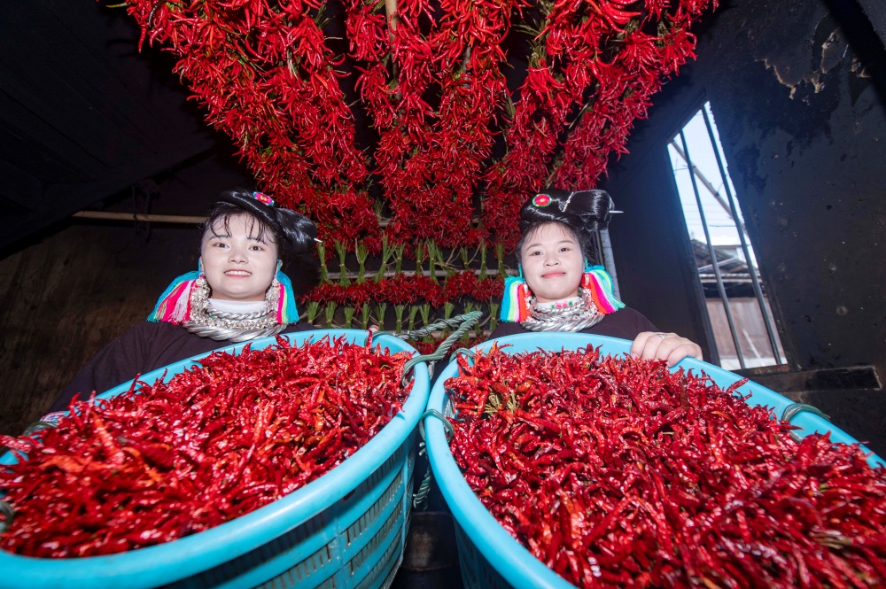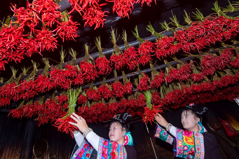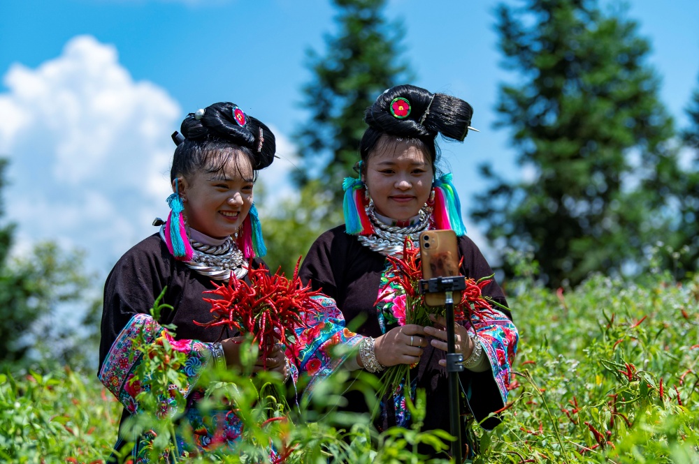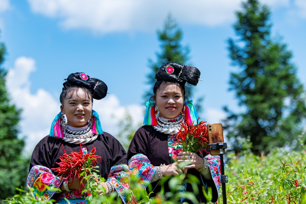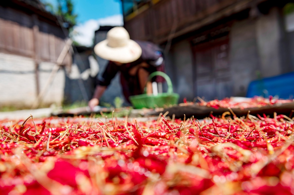 當(dāng)日,貴州省黔東南苗族侗族自治州從江縣東朗鎮(zhèn)擺阿苗寨種植的朝天椒喜獲豐收,村民利用晴好天氣抓緊采收、晾曬,并通過(guò)直播等方式拓寬銷(xiāo)售渠道。