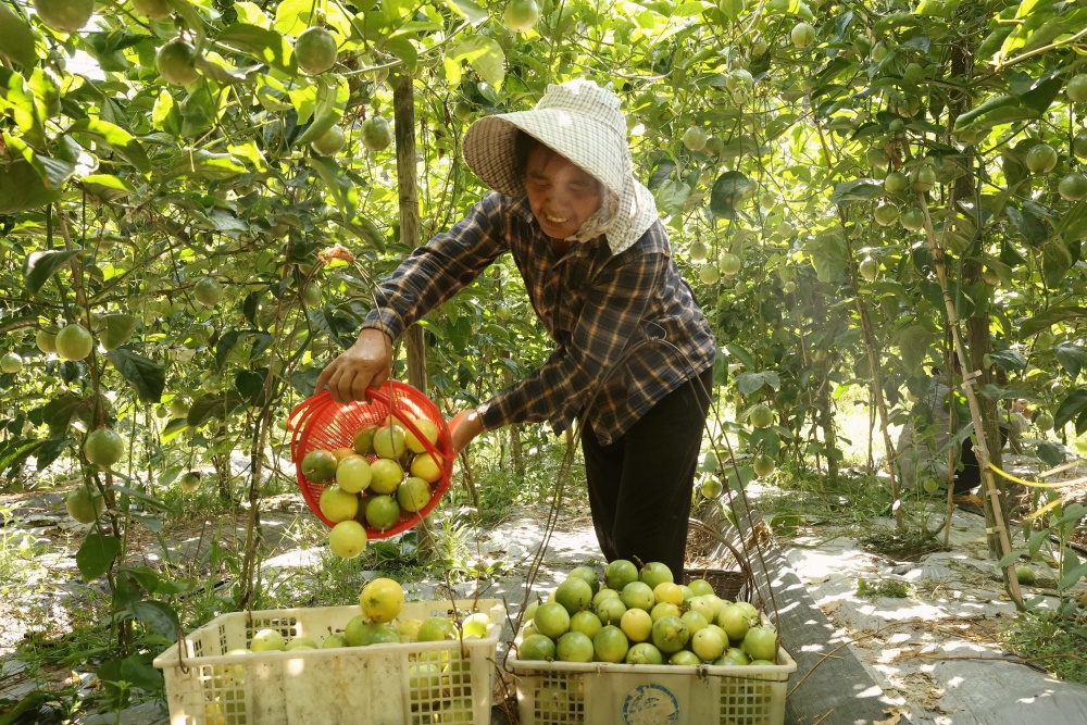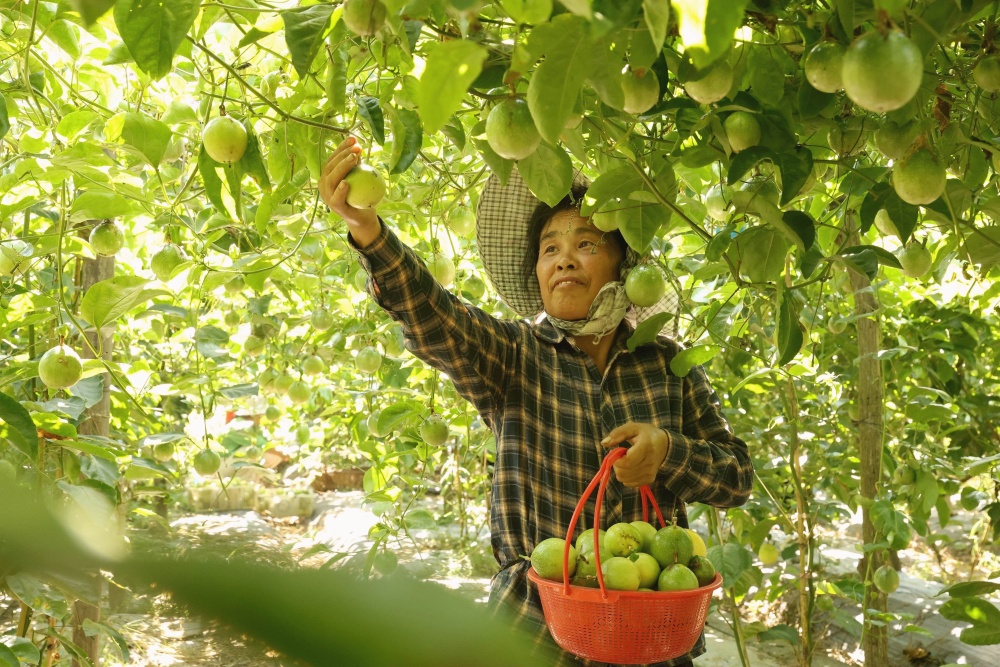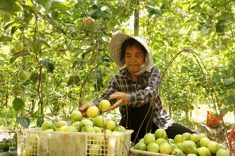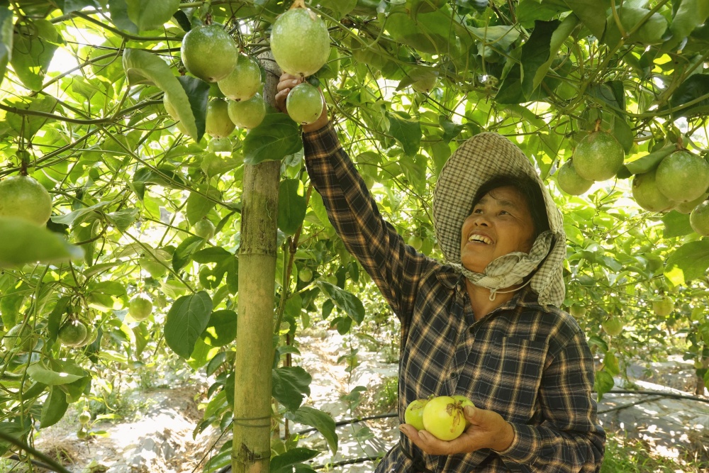 9月1日,在貴州省黔東南苗族侗族自治州榕江縣平江鎮(zhèn)巴魯村百香果種植基地,種植戶吳平香在采摘百香果。