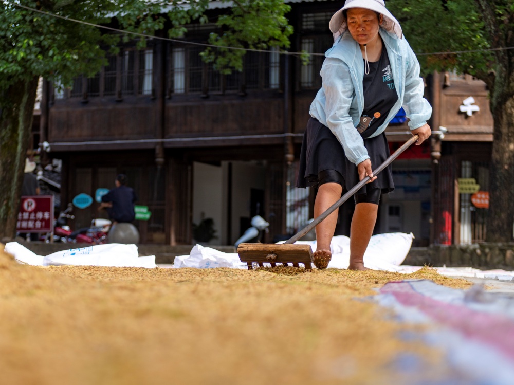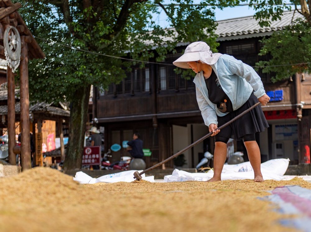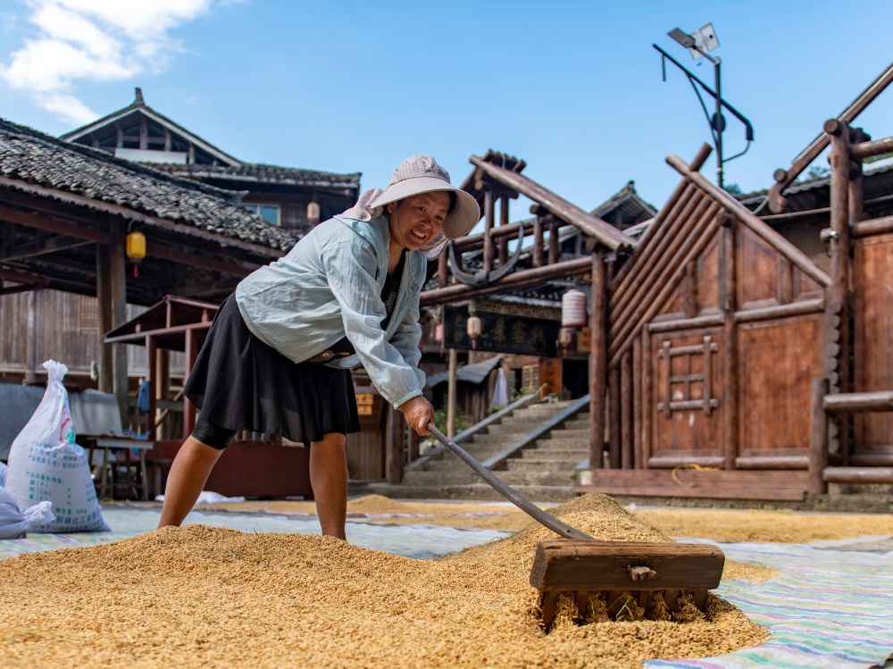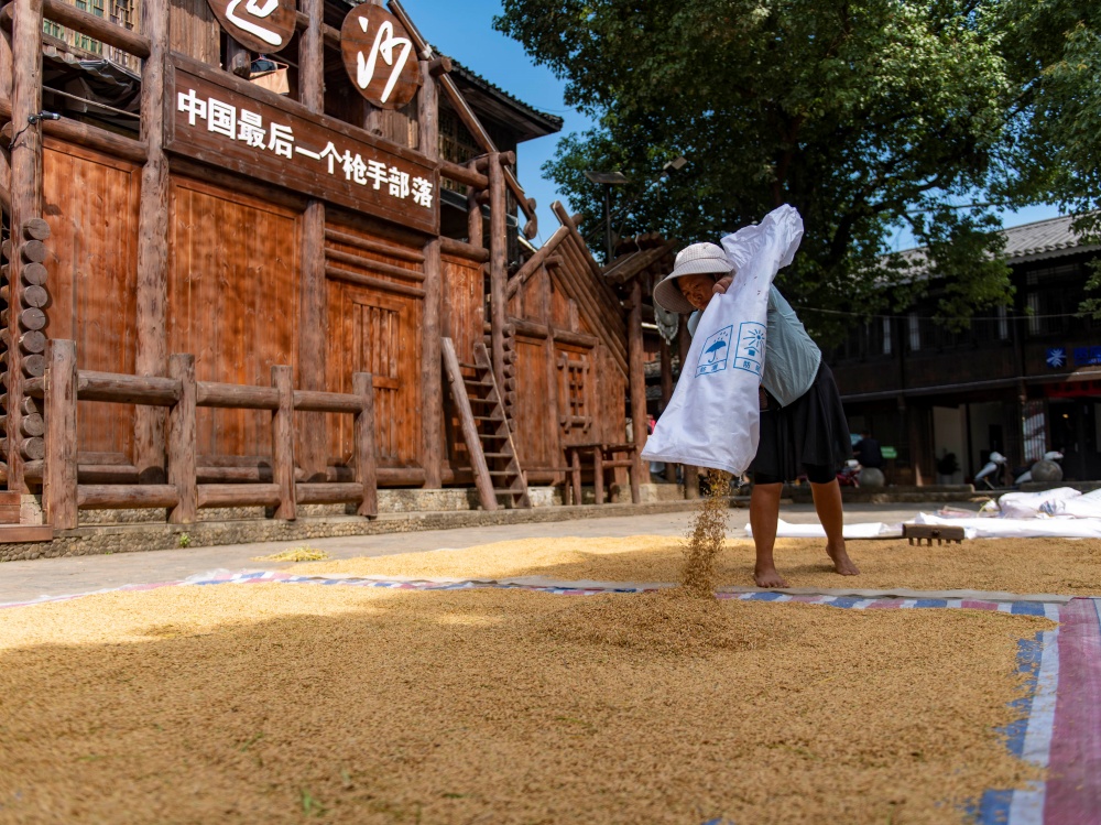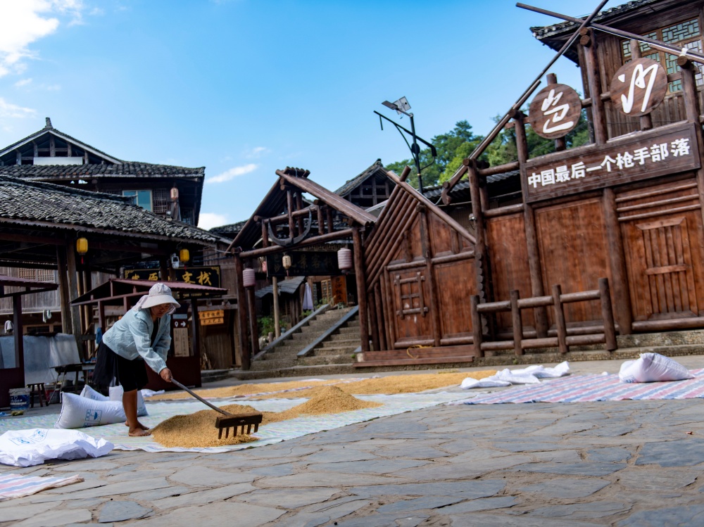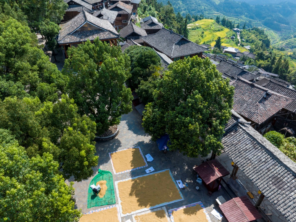 9月3日,在貴州省從江縣丙妹鎮(zhèn)岜沙苗寨,村民在晾曬稻谷。