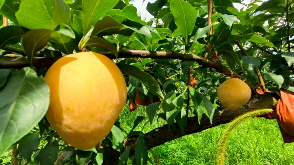 果園里,每一株黃金李碩果累累,桃子般大的黃金李第一眼看去以為是梨子,巨大的個頭讓初次見到的客人不禁贊嘆。