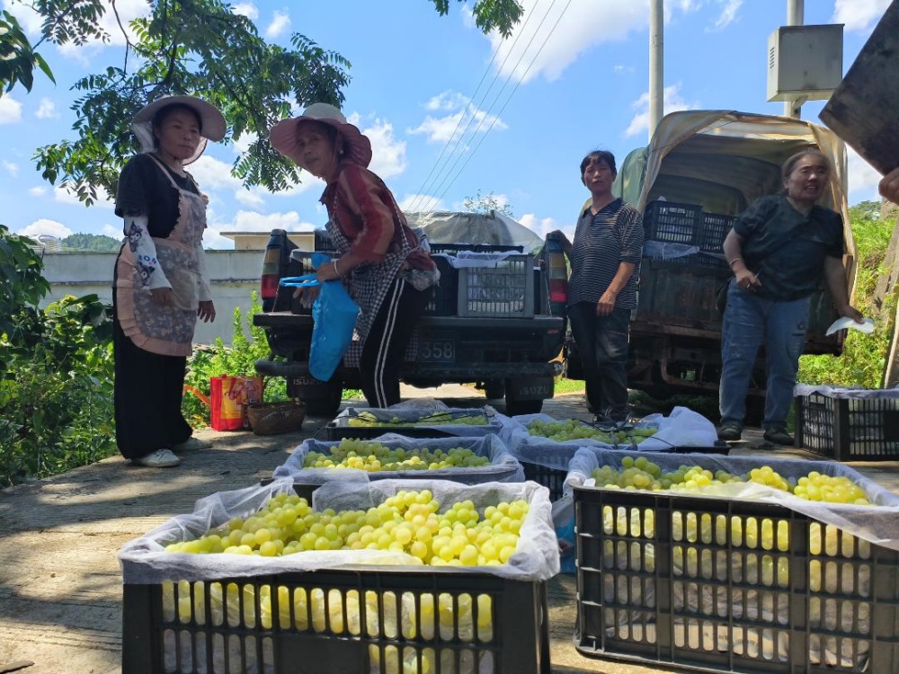 “獨山、湖南、貴陽的客戶都有,獨山的客戶今天過來,下午要發(fā)一貨車的水晶葡萄,所以要趕緊采摘”。 韓澤峰邊說邊引導(dǎo)工人抓緊采摘。?