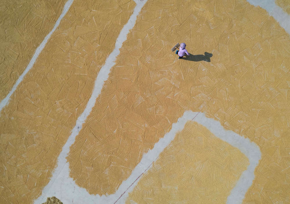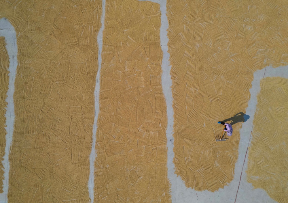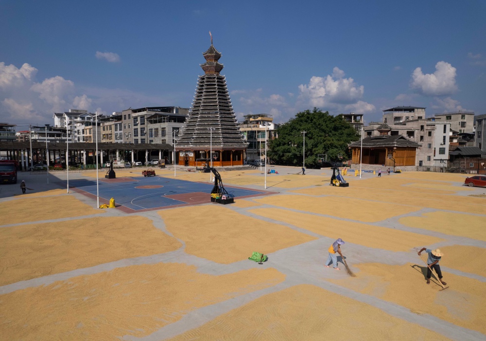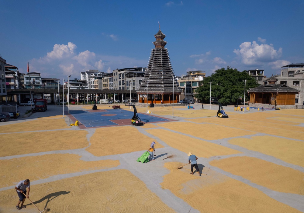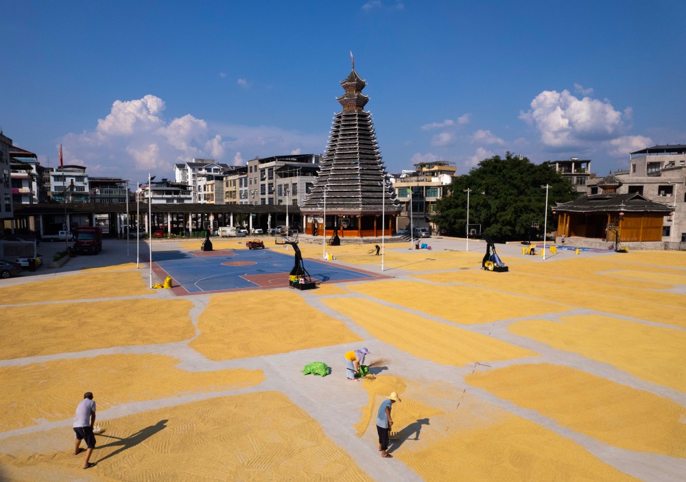 9月7日,貴州省黔東南苗族侗族自治州從江縣貫洞鎮(zhèn)臘陽村迎來晴好天氣。村民們抓住有利時(shí)機(jī),將豐收的稻谷搬運(yùn)至鼓樓廣場集中晾曬。金黃的稻谷鋪滿廣場,與古樸的侗寨建筑相映成趣,一幅充滿煙火氣的豐收畫卷在秋日里徐徐展開,盡顯鄉(xiāng)村豐收的喜悅與生機(jī)。