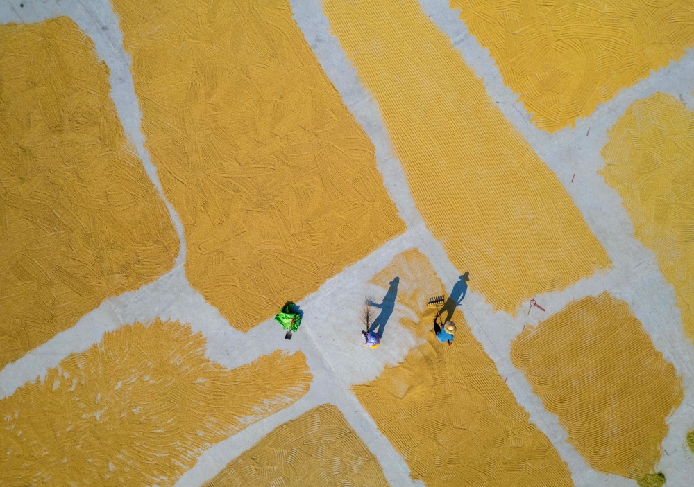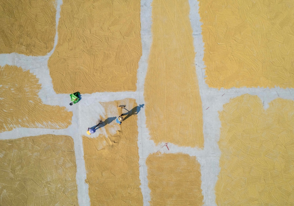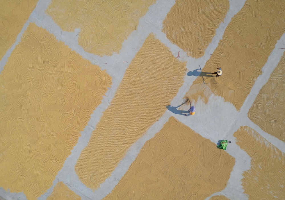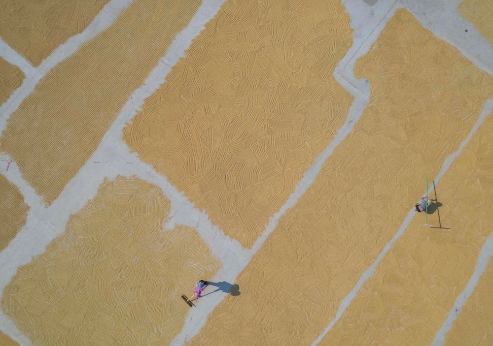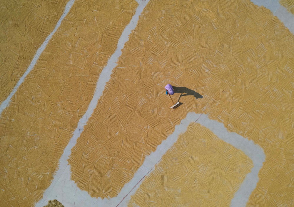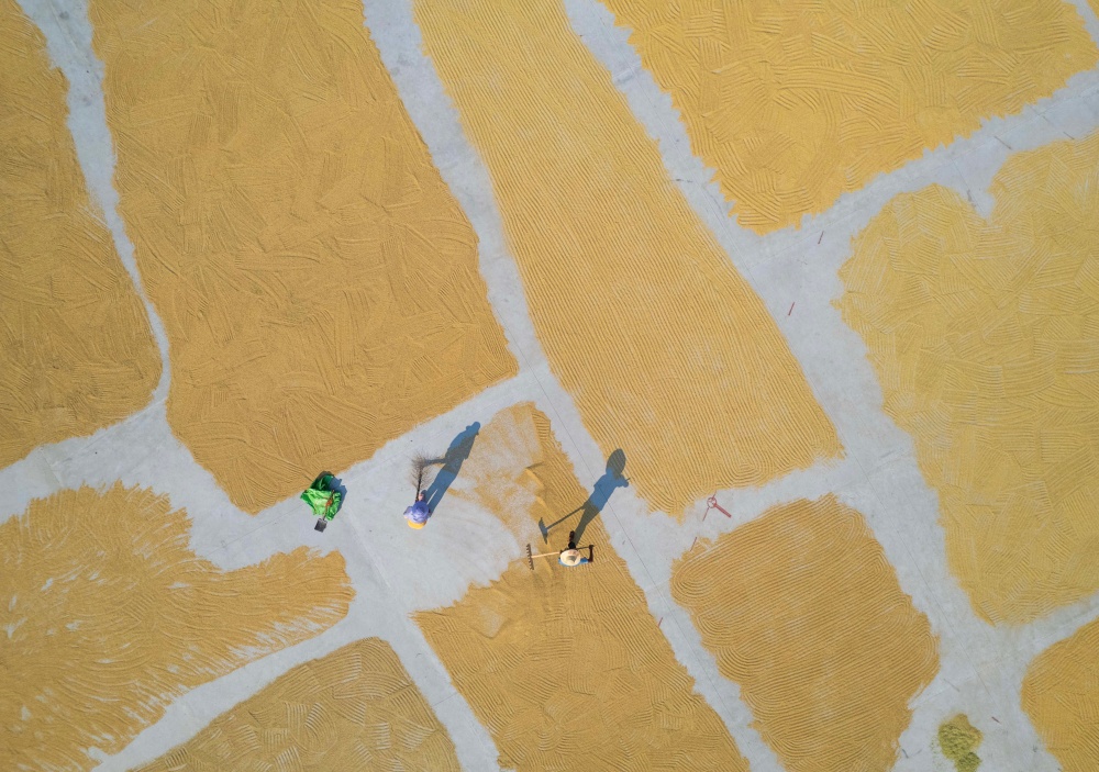9月7日,貴州省黔東南苗族侗族自治州從江縣貫洞鎮(zhèn)臘陽村迎來晴好天氣。村民們抓住有利時(shí)機(jī),將豐收的稻谷搬運(yùn)至鼓樓廣場集中晾曬。金黃的稻谷鋪滿廣場,與古樸的侗寨建筑相映成趣,一幅充滿煙火氣的豐收畫卷在秋日里徐徐展開,盡顯鄉(xiāng)村豐收的喜悅與生機(jī)。