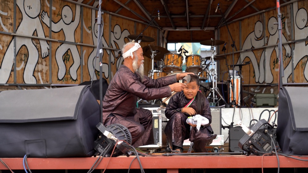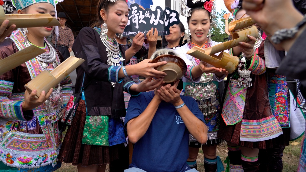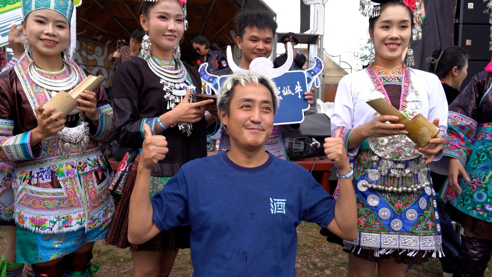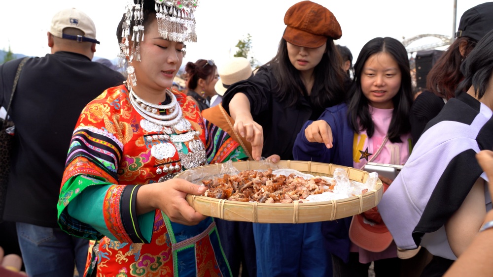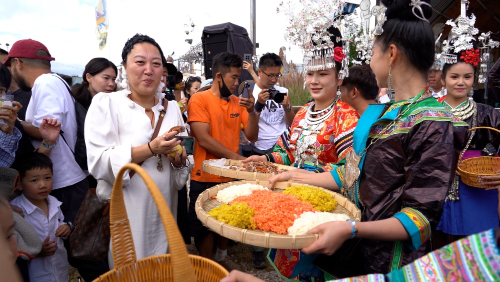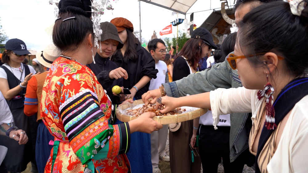 在“荒野之國”藝術園區(qū)表演現(xiàn)場,從江侗族多聲部合唱團帶來的《祖公落寨》,以無指揮、無伴奏、多聲部自然和聲的演唱方式震撼全場。侗族琵琶歌行歌坐月《讓我陪你坐一夜》,悠揚的旋律如潺潺流水般流淌而出,仿佛帶著觀眾走進了一個寧靜而美麗的侗族村寨。槍手部落《岜沙人》,演員英姿颯爽,步伐沉穩(wěn)有力,表演精彩絕倫、扣人心弦,最為驚險震撼的是,寨佬用鋒利的鐮刀為男子剃發(fā),手法嫻熟,驚險震撼。侗族、苗族、瑤族等多元民族非遺大秀驚艷全場,這不僅是T臺上的時尚演繹,更是一場“把生活穿在身上”的文化行走。從江香豬、五彩香禾飯和新鮮百香果等美食的推出,瞬間成為全場焦點,熱情的觀眾便從四面八方涌來,迅速形成合圍,遭遇觀眾瘋搶,現(xiàn)場感受美食帶來的樂趣。