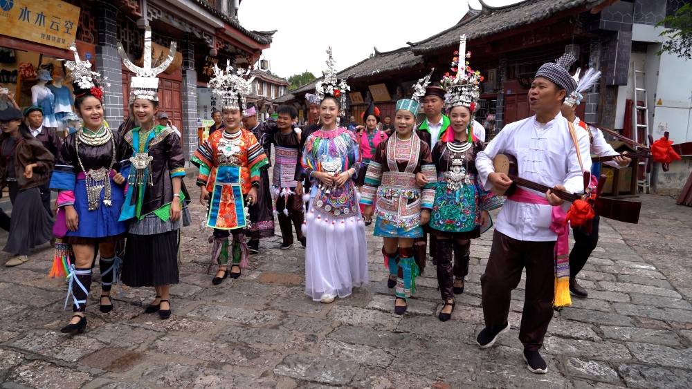 在麗江古城,從江表演團隊一路走一路表演,以流動的舞臺、行走的藝術,將黔東南大山深處的文化基因悄然播撒在滇西北的青石板路上,開啟了一場跨越地域的的民族文化巡禮。侗族大歌的多聲部天籟之音忽然從人群中升起,打破古城的寧靜,表演團隊與當?shù)丶{西族群眾載歌載舞,圍成同心圓跳起納西“打跳”與侗族“多耶”。大家手拉手,隨著歡快的音樂有節(jié)奏地跳躍、轉(zhuǎn)身,不同的旋律、不同的語言在此刻相互交織,讓各民族之間文化互相交流、交融。