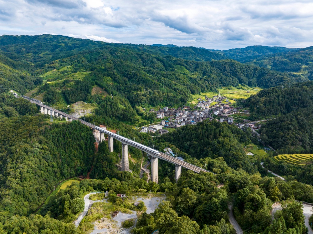 金秋時節(jié),貴州省黔東南苗族侗族自治州從江縣境內(nèi)的水稻陸續(xù)成熟,大地鋪金。一列列動車組飛速疾馳的列車經(jīng)過,與金黃色的稻田、傳統(tǒng)的侗寨民居、連綿的青山相互映襯,構(gòu)成一幅動人的秋日畫卷。