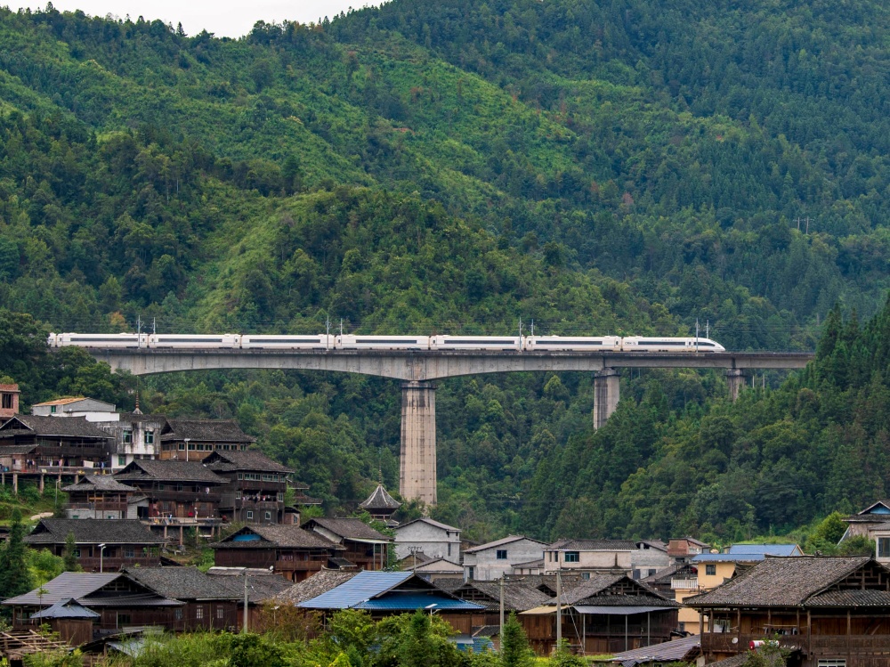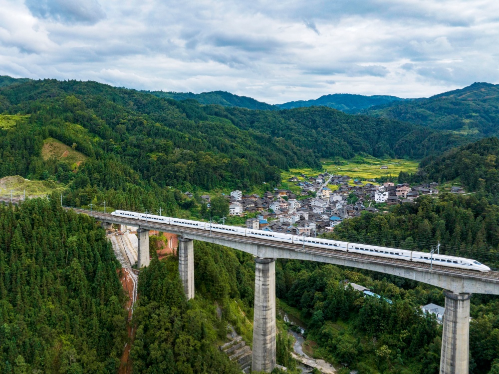 9月12日,一列動車組從貴州省從江縣往洞鎮(zhèn)朝利侗寨旁疾馳而過。