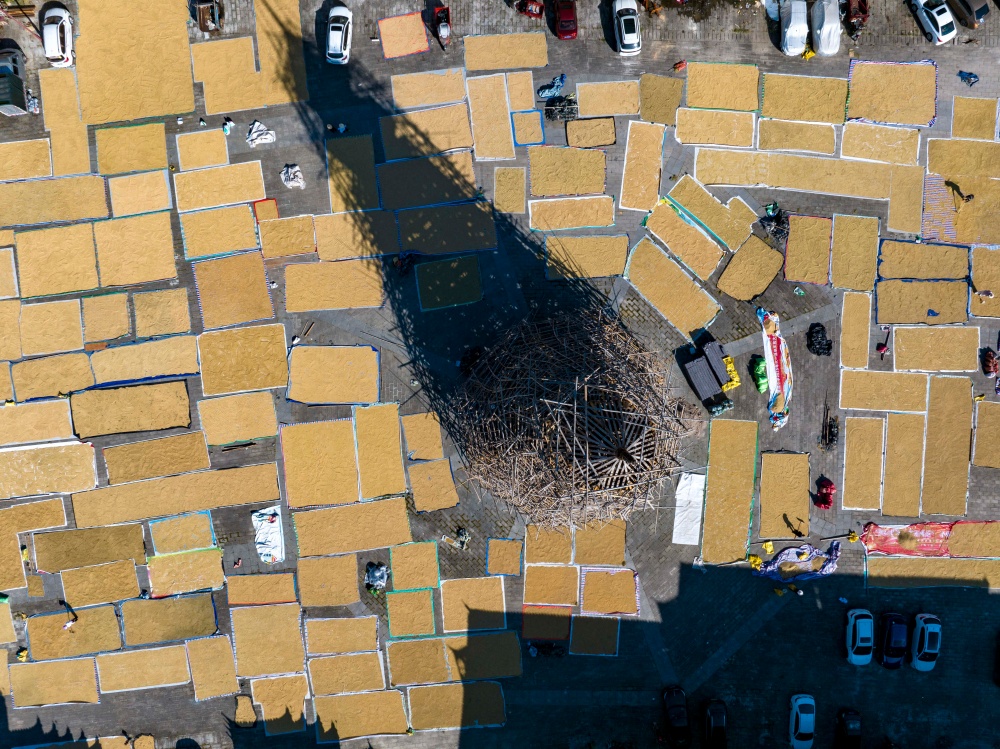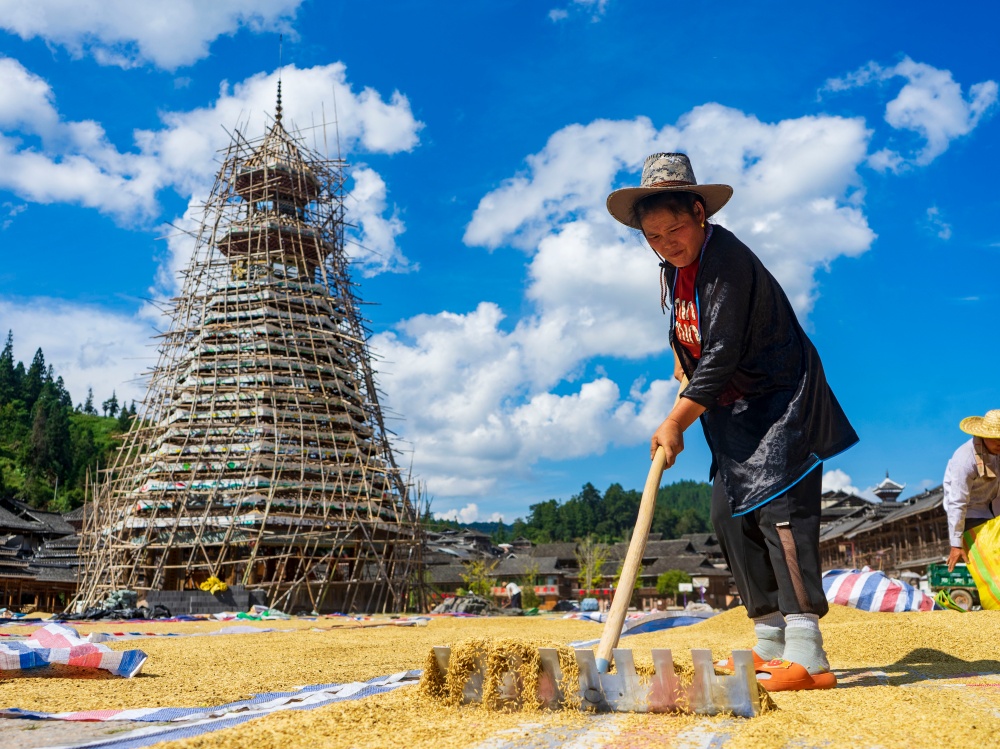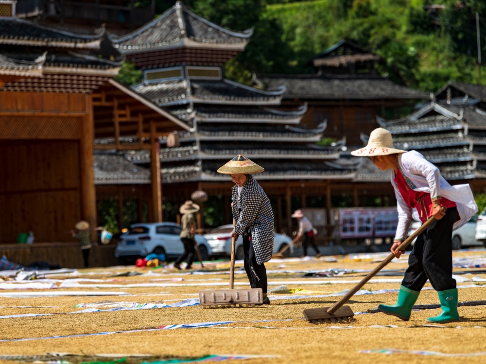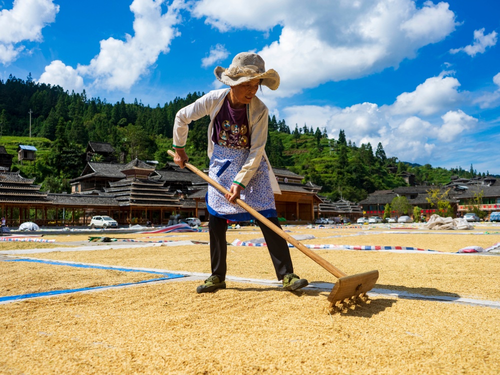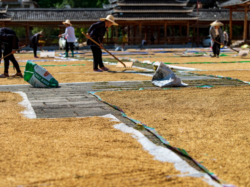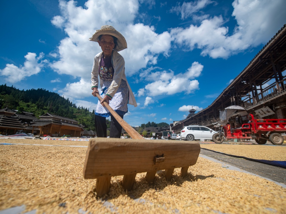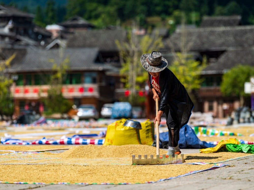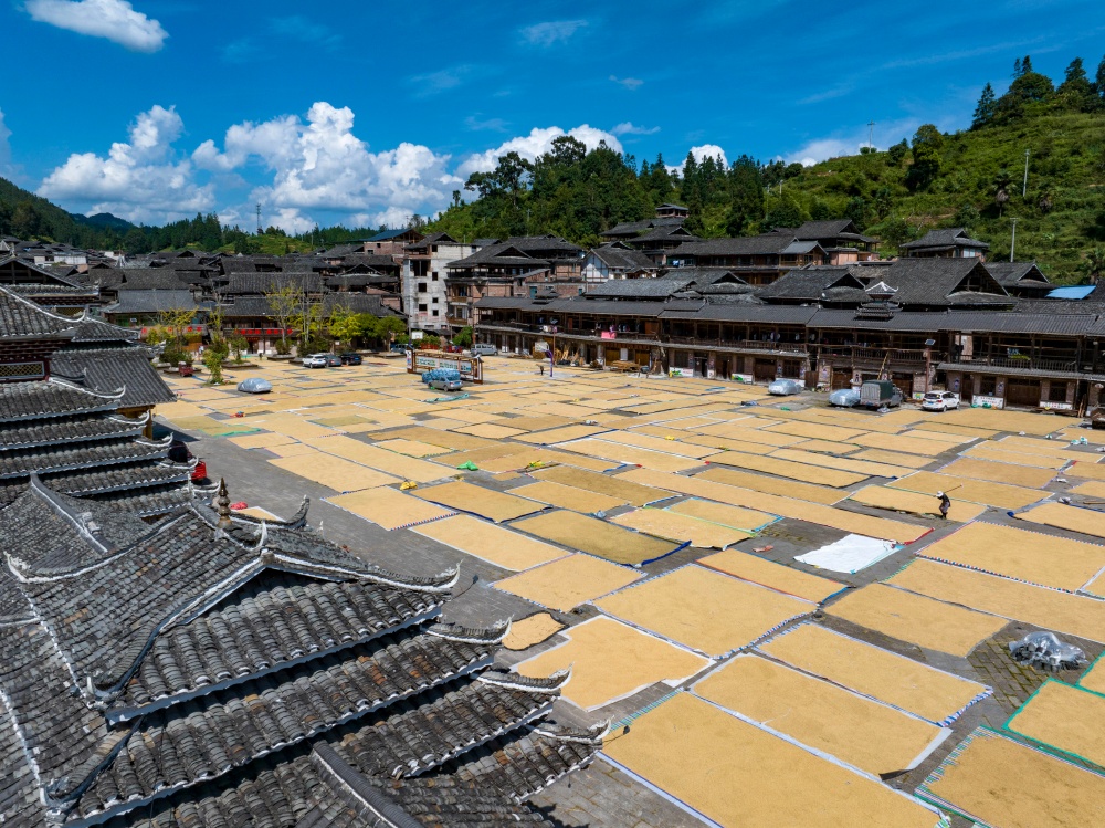 9月15日,村民在貴州省從江縣高增鄉(xiāng)小黃侗寨晾曬稻谷。