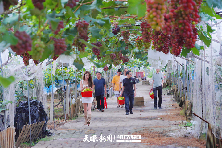 正在園內采摘的游客楊蘭高興地說:“我是他家的‘葡粉’,每年都開車帶著孩子一起來采摘。他家的葡萄顆粒飽滿、糖分足、口感好,家里人都喜歡吃?!?/p>
