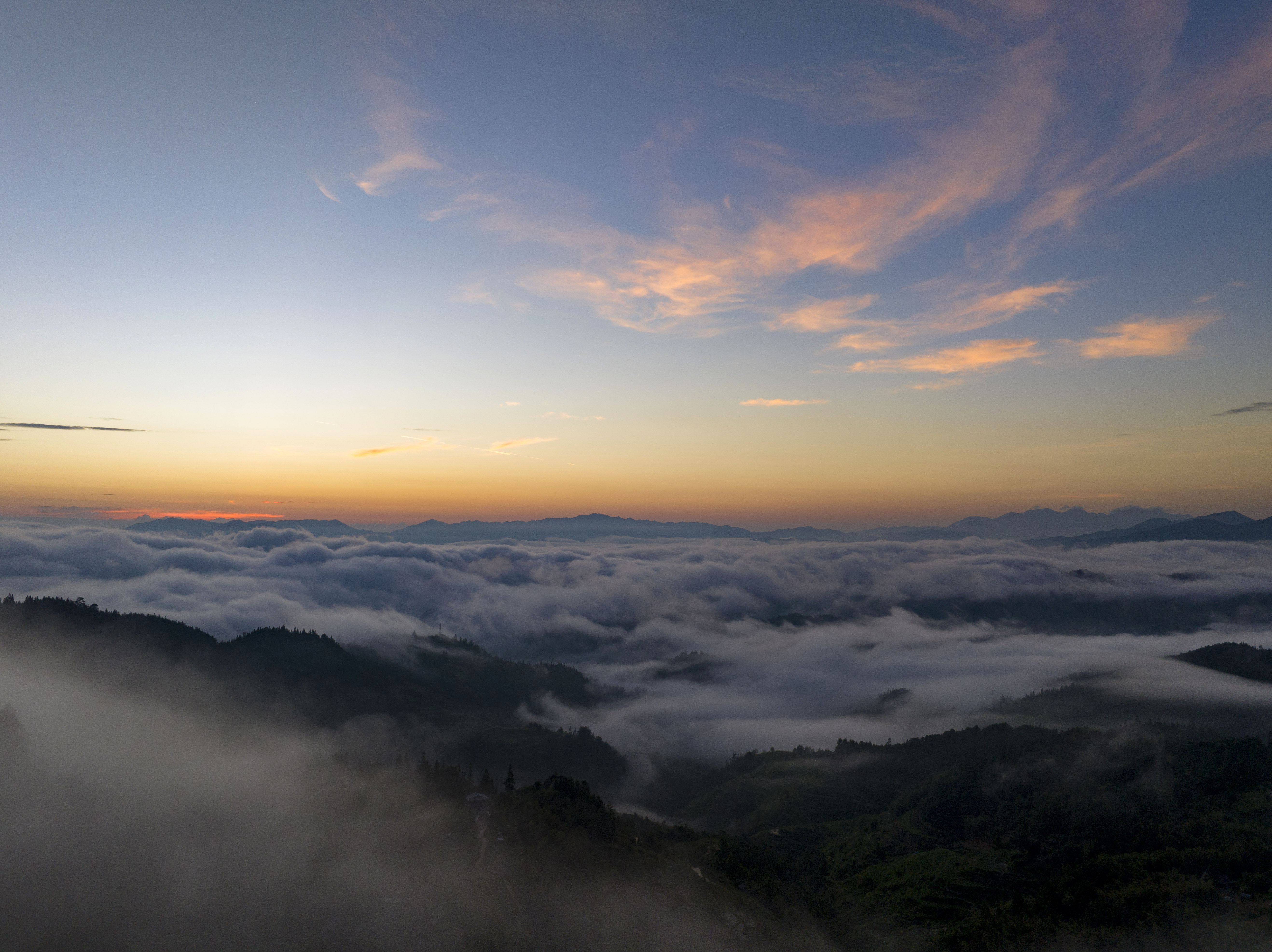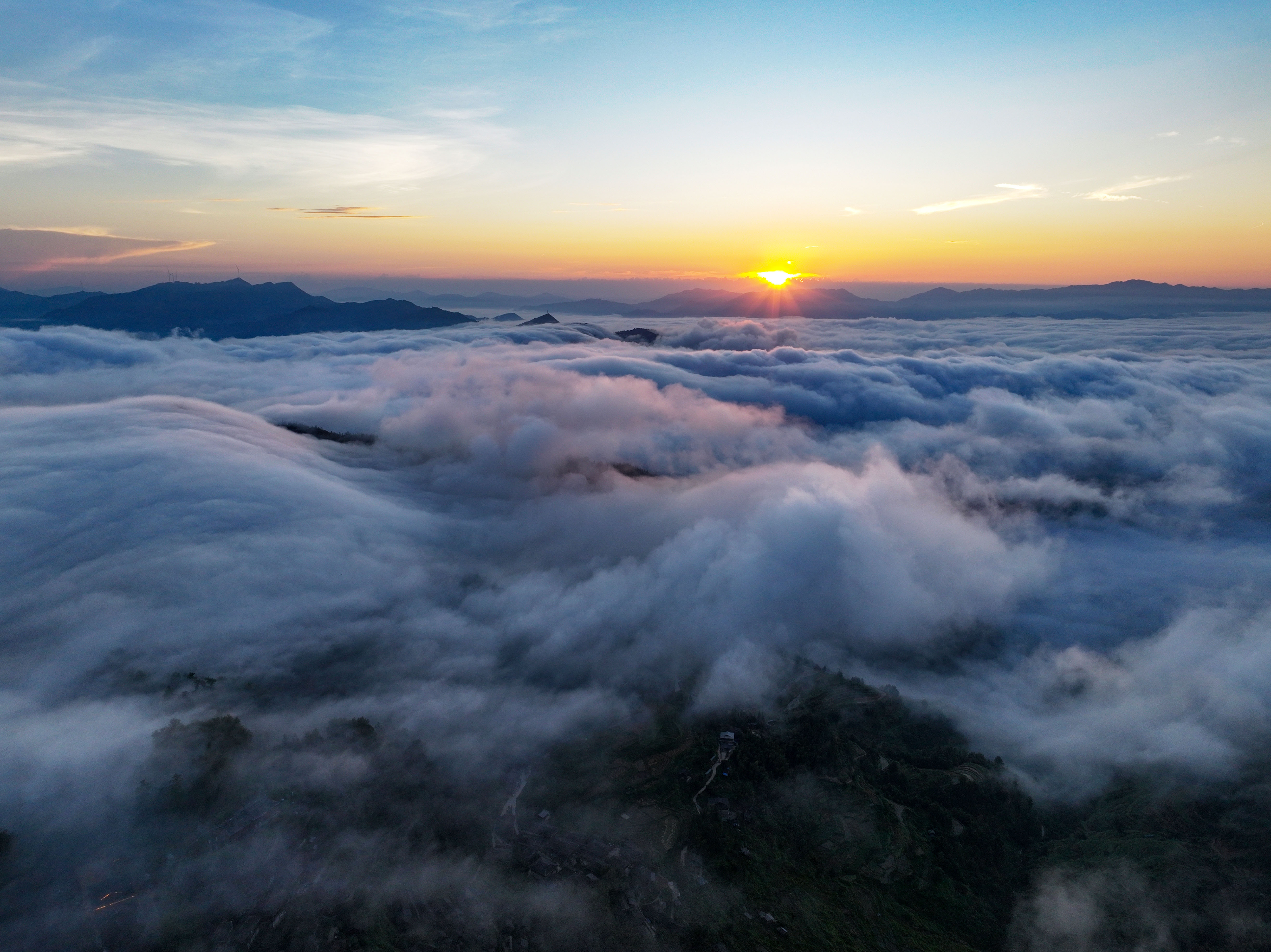 9月18日,在貴州省從江縣丙妹鎮(zhèn)岜沙苗寨拍攝的日出云海景觀(無人機(jī)照片)。
