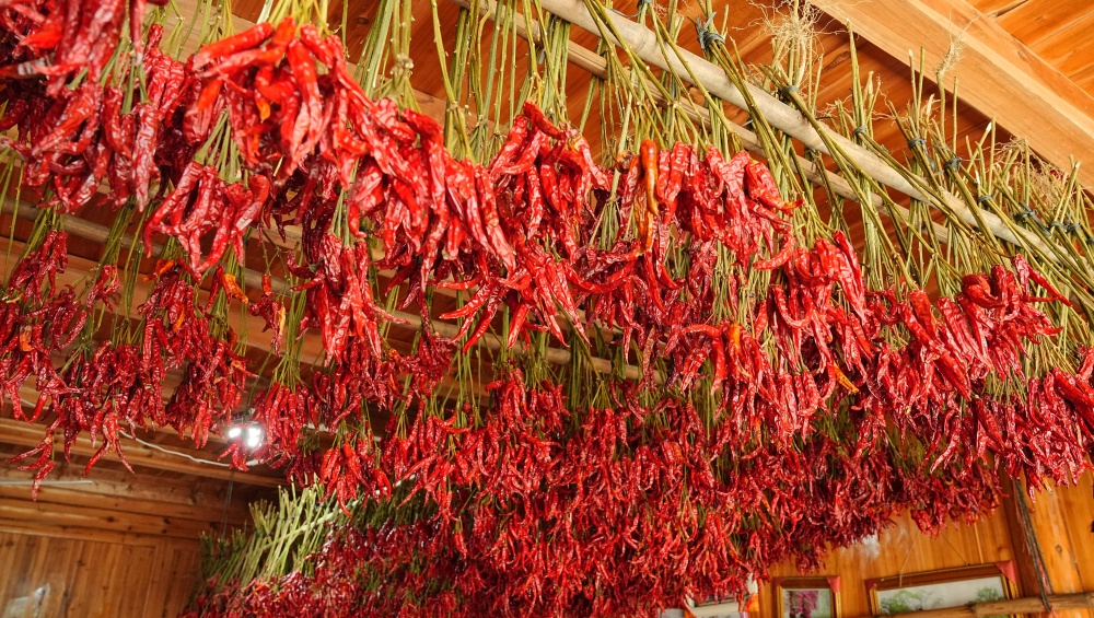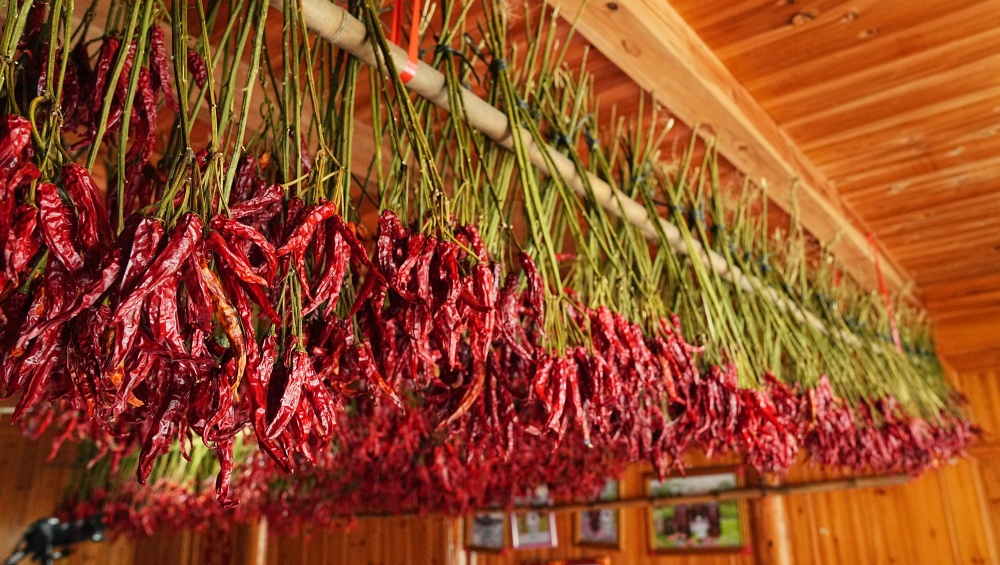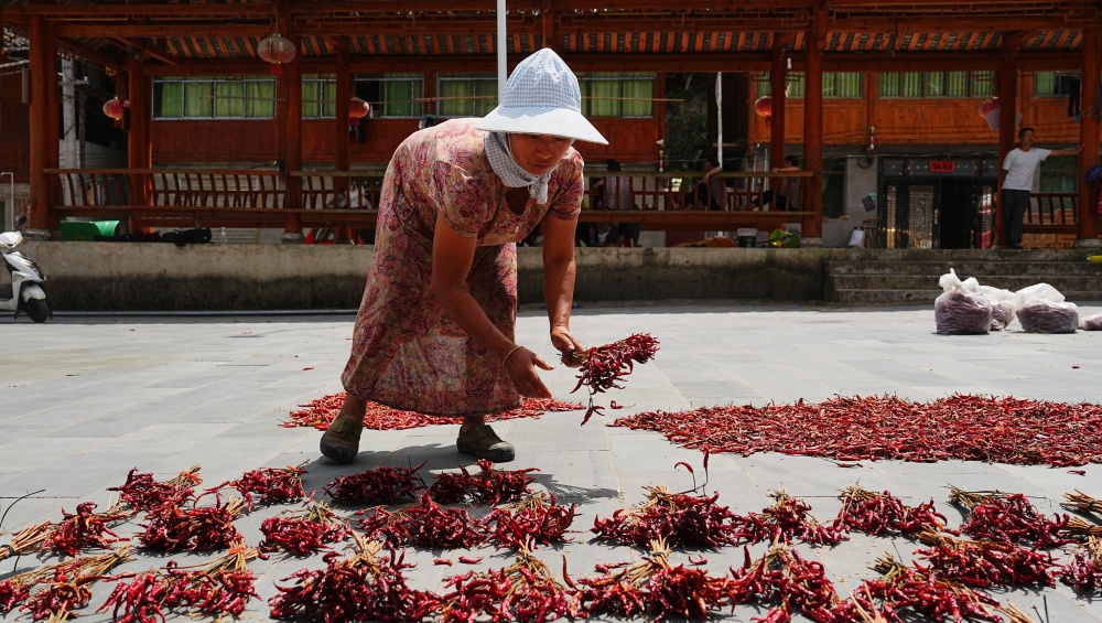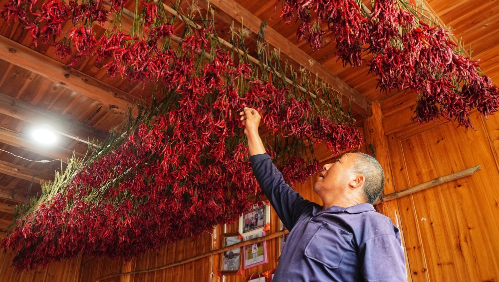趁著晴好天氣,不少村民將自家的辣椒搬到石板地上鋪開,動作嫻熟又認(rèn)真地將辣椒擺得均勻,確保每一顆都能被陽光充分照耀,好更快曬干收存。農(nóng)戶李大哥家的二樓屋頂,更是掛滿了一串串火紅的辣椒,像極了垂落的喜慶瓔珞。這滿室的紅,不僅是餐桌上的食材,更是一家人一年辛勤勞作的見證。