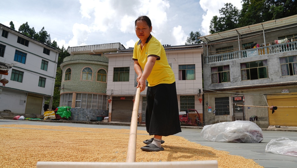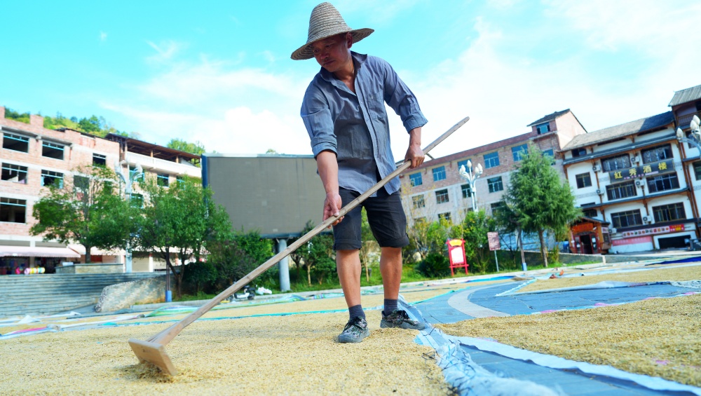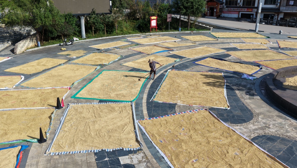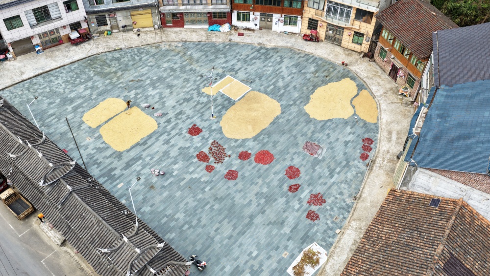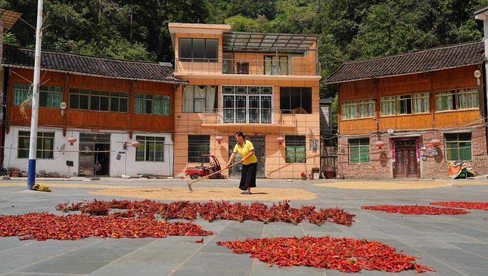 村中心廣場上,金黃的稻谷與艷紅的辣椒相映成趣,在陽光下折射出溫暖的光澤。村民們手持竹耙,細(xì)細(xì)翻曬著稻谷,竹耙起落間,稻谷的清香便在空氣中彌漫開來,被翻動的谷粒發(fā)出沙沙輕響,像是在低聲吟唱著豐收的歌謠。“今年天氣好、陽光足,谷子顆粒飽滿,收成比去年還多嘞!”村民李玉珍笑著說道,眼角眉梢滿是滿足。
