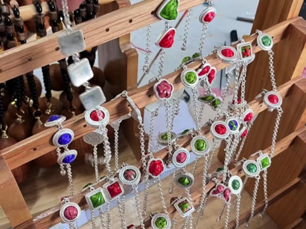 “現(xiàn)在我們花一小時編制的飾品能賣到上百元,而且都是訂單銷售?!睏疃啪杲榻B,大件商品價格從幾百元到上千元不等,但真正走量的正是這些幾十元的小飾品。