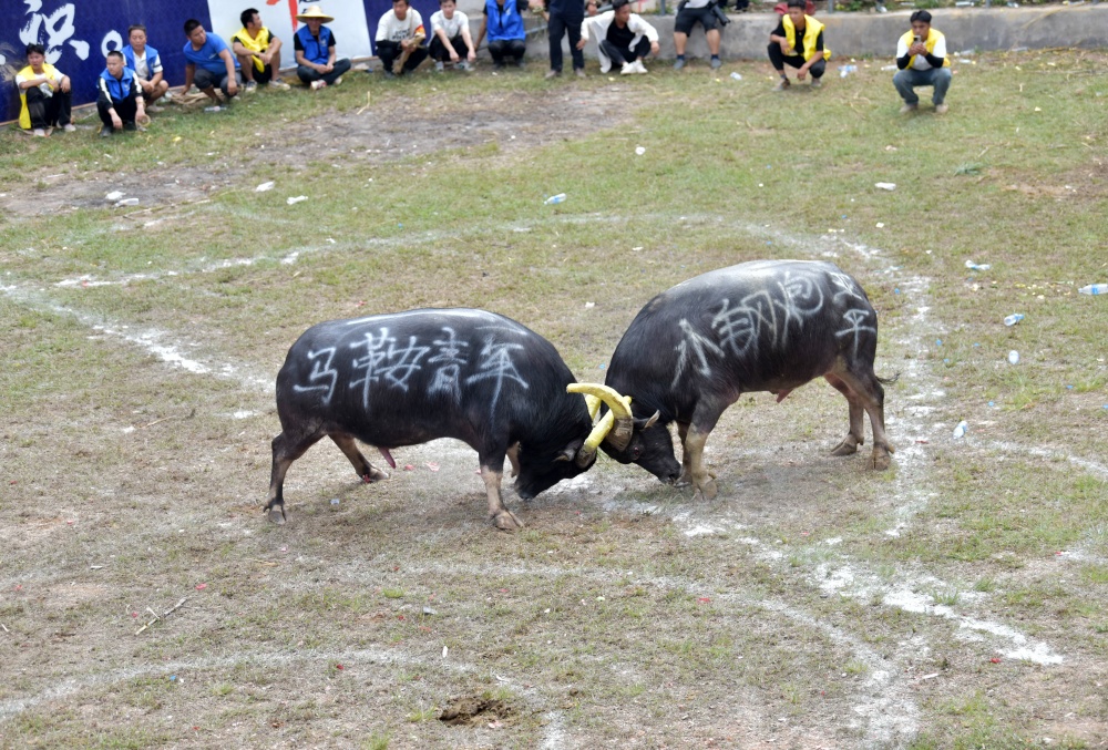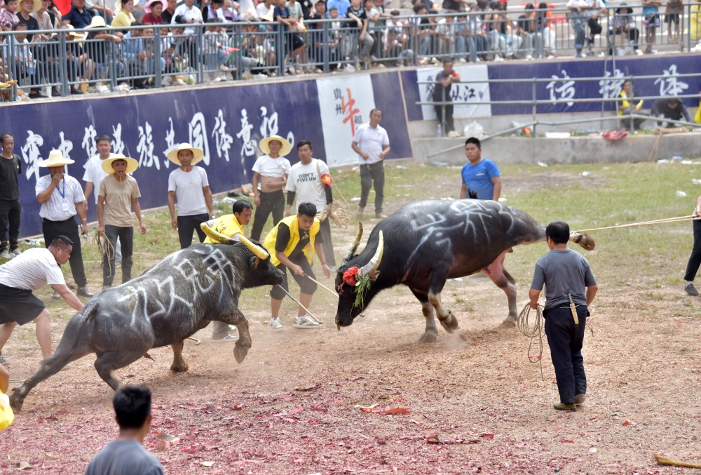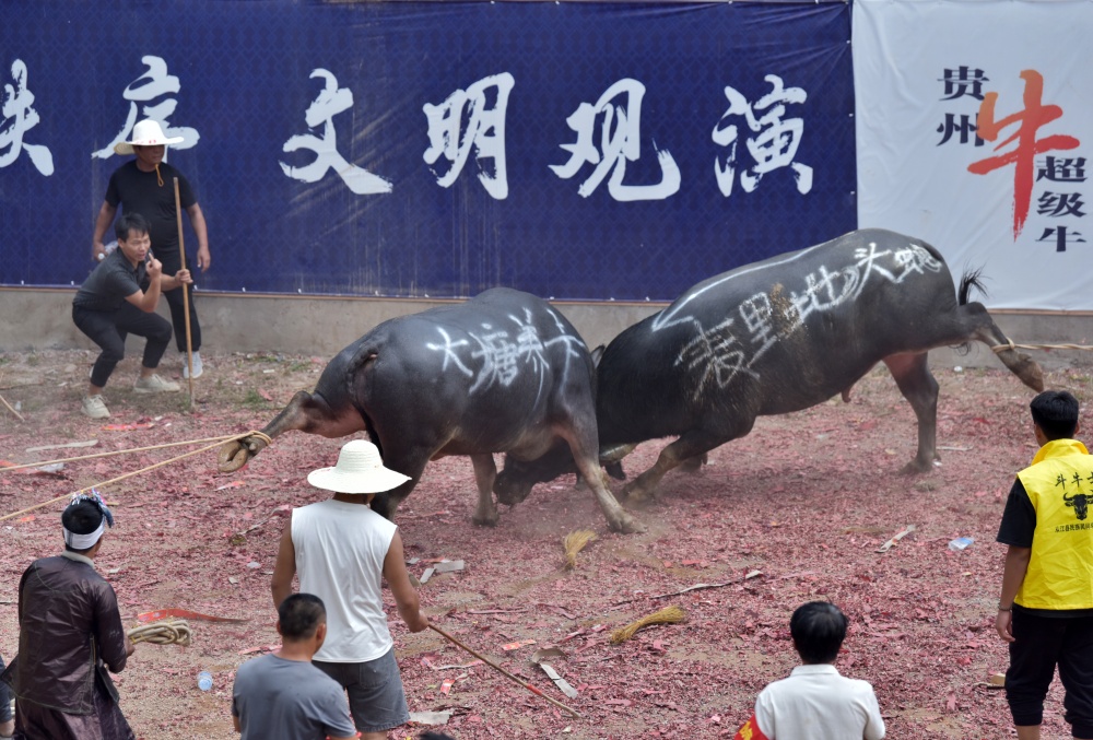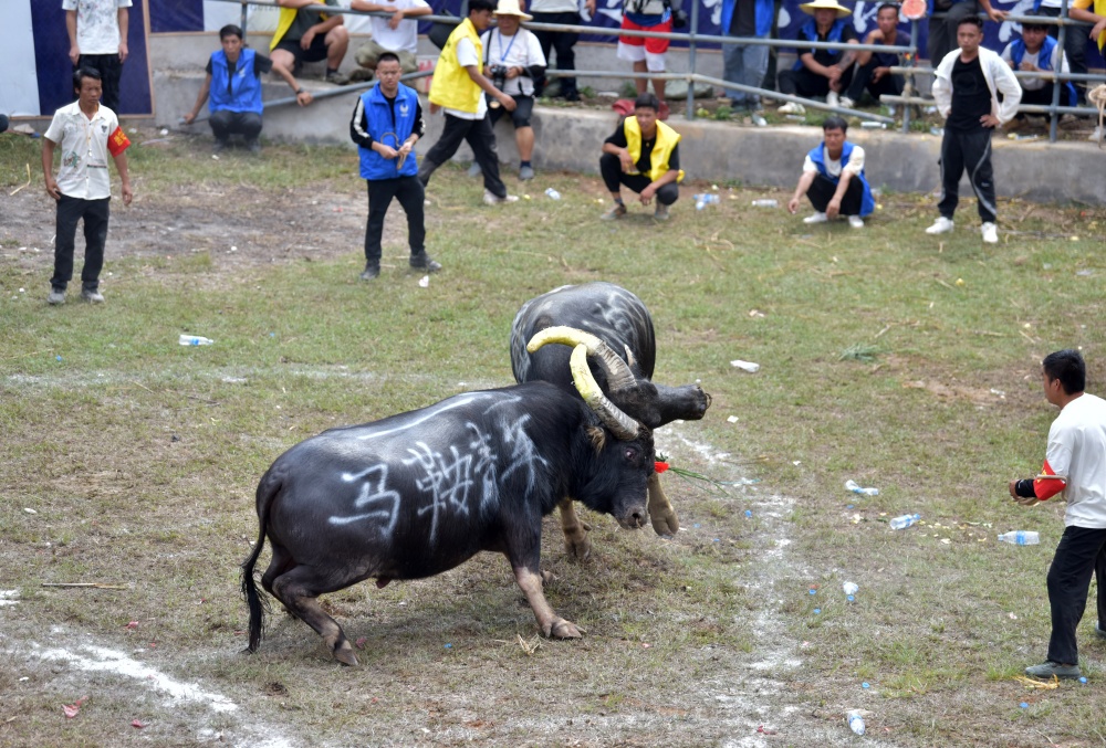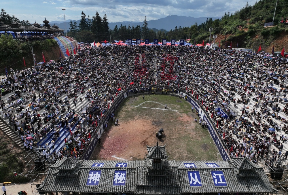 10月2日,貴州省黔東南苗族侗族自治州從江縣丙妹鎮(zhèn)大塘村松學(xué)斗牛塘舉行民俗文化展演和傳統(tǒng)民間斗牛等民俗活動(dòng),歡慶國(guó)慶,迎接中秋。