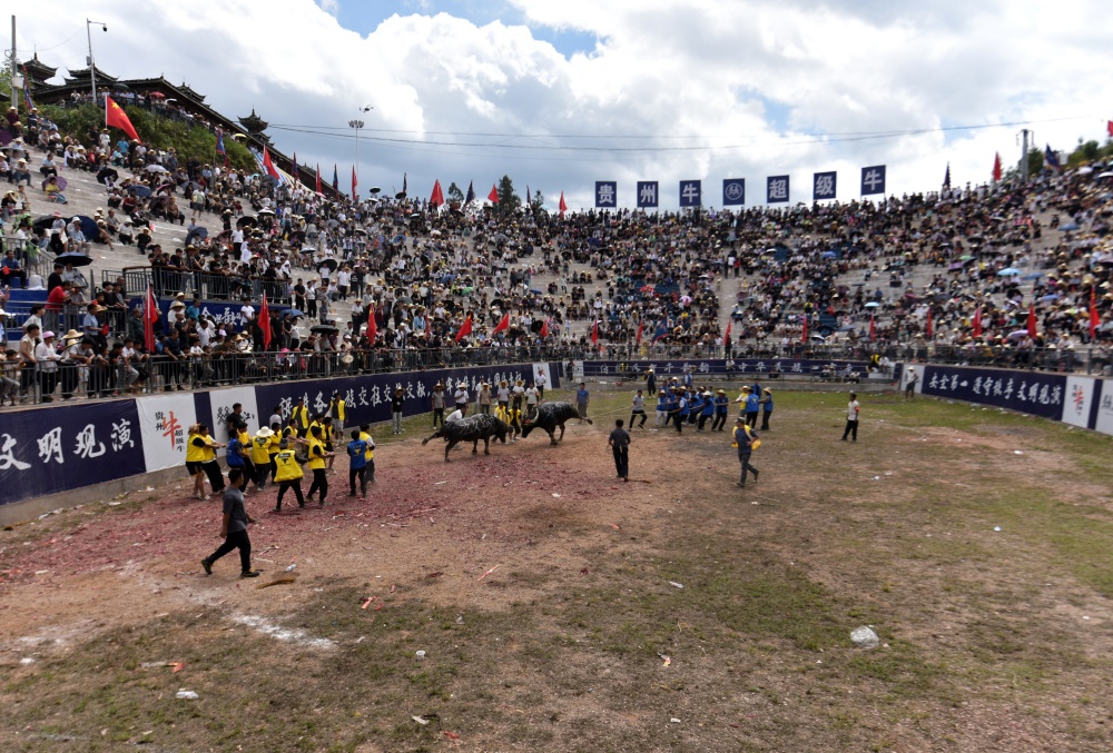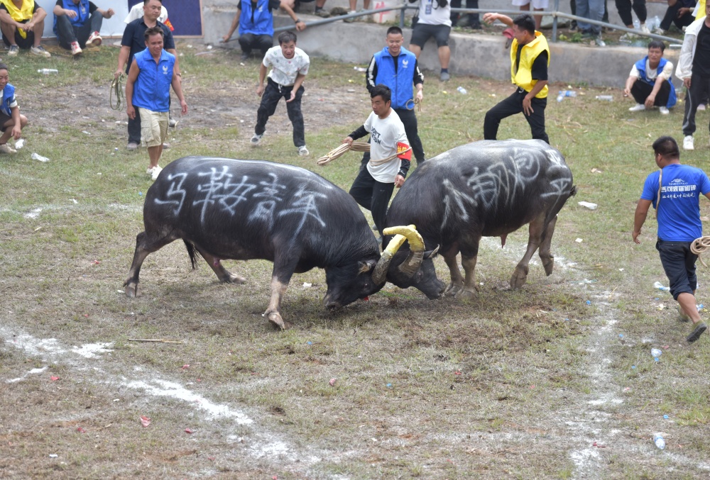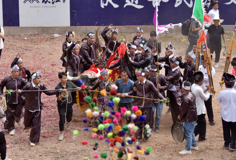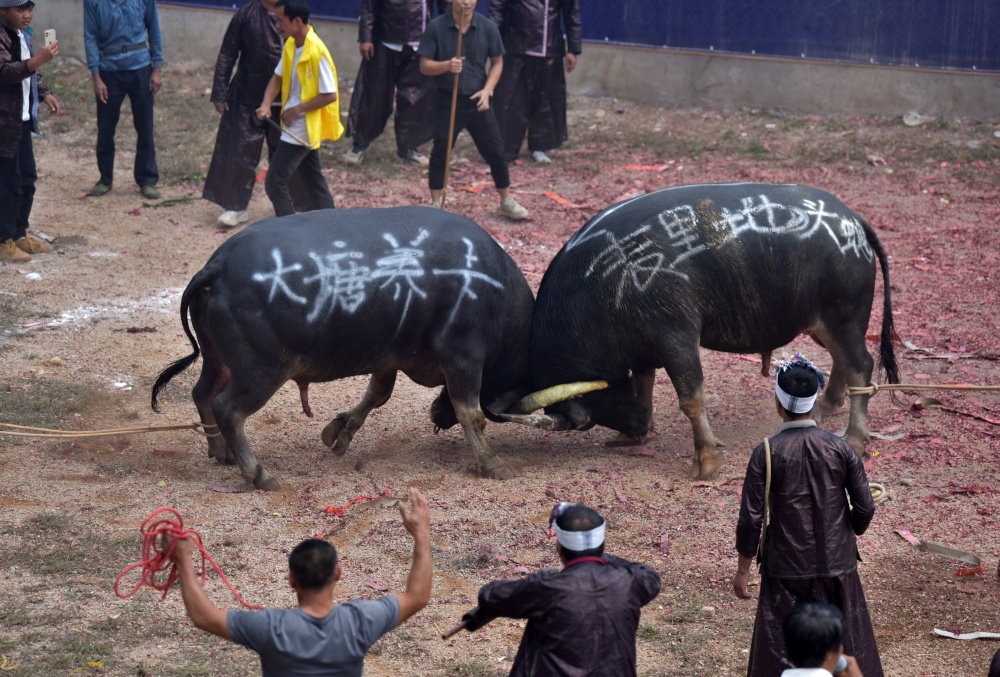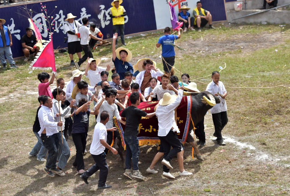 10月2日,貴州省黔東南苗族侗族自治州從江縣丙妹鎮(zhèn)大塘村松學(xué)斗牛塘舉行民俗文化展演和傳統(tǒng)民間斗牛等民俗活動(dòng),歡慶國(guó)慶,迎接中秋。