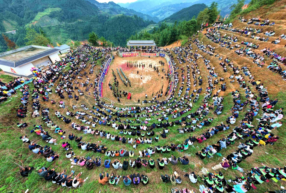 10月3日,位于貴州省黔東南苗族侗族自治州從江縣加勉鄉(xiāng)黨翁村的苗嶺牛塘舉行傳統(tǒng)斗牛活動(dòng),當(dāng)?shù)孛缱逋碇褡迨⒀b歡聚一堂,歡慶“雙節(jié)”。