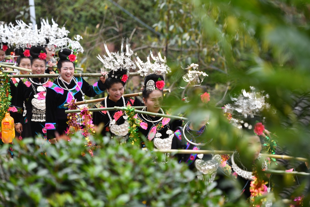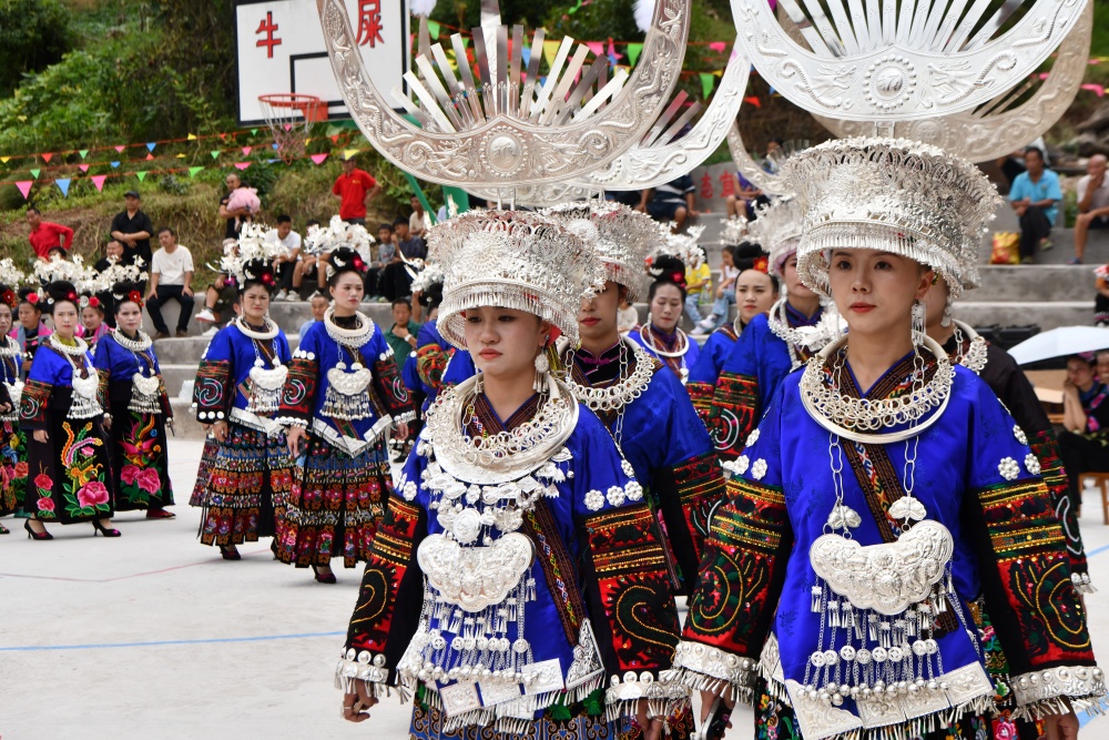 慶典這天,80多位姑媽穿著盛裝回了家,銀冠上的流蘇隨著腳步晃,圍著新球場(chǎng)跳蘆笙舞、唱苗歌,歌聲飄到山谷里,引得溪邊的水鳥(niǎo)撲棱著翅膀飛。