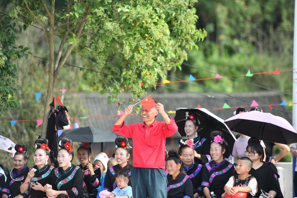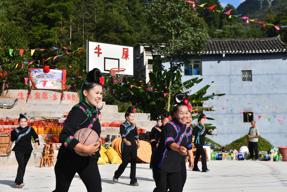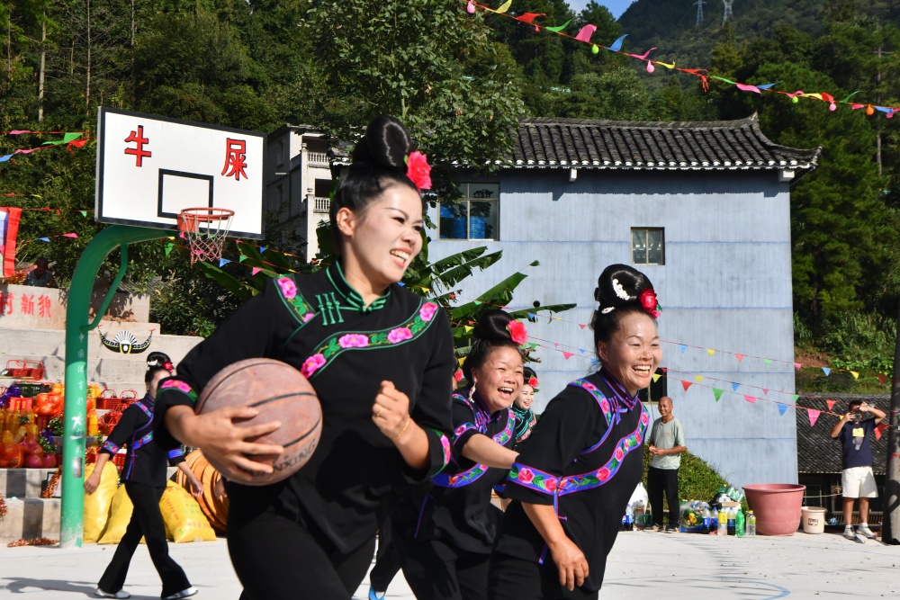 哨聲剛落,穿著黑色苗裝、額前發(fā)髻插著一朵紅花的姑媽舅媽們立馬“變身”運(yùn)動(dòng)員,抱著籃球樂(lè)呵呵往籃下沖。投中一個(gè)球就有人遞上瓶礦泉水當(dāng)“彩頭”。場(chǎng)上跑著笑著,你搶我傳;場(chǎng)下老人們大吹奏蘆笙,唱苗歌,娃娃們追著球跑,歡呼聲、笑聲裹著蘆笙調(diào)飄滿(mǎn)山谷,整個(gè)牛屎寨成了歡樂(lè)的海洋。20分鐘比賽結(jié)束,滿(mǎn)頭大汗的舅媽顧榜橋還意猶未盡:“托黨和政府的福,咱農(nóng)村日子越來(lái)越甜!頭回用‘姑媽籃球賽’慶新中國(guó)76歲生日,開(kāi)心得很,有意義得很!”