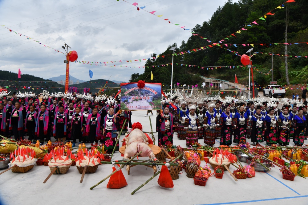 姑媽、姑爹、老表們結(jié)隊(duì)抬著肥豬、挑著糯米飯、糖果飲品,卻被舅舅舅媽們的盛情“堵”在兩道苗家攔門(mén)酒外,唱口家鄉(xiāng)的米酒,嘗口媽媽的味道,浩浩蕩蕩,依次穿過(guò)寨中間公路上用青竹搭起的半圓形拱門(mén),彩氣球在綠葉間晃蕩,炮聲齊鳴,與苗家過(guò)年一樣熱鬧——這個(gè)地轄鴨塘街道馬安村、只有50余戶(hù)人家的苗寨,正借著球場(chǎng)修繕竣工的喜事兒,頭一回邀外嫁的姑媽們回娘家,過(guò)一個(gè)別樣的國(guó)慶節(jié)。