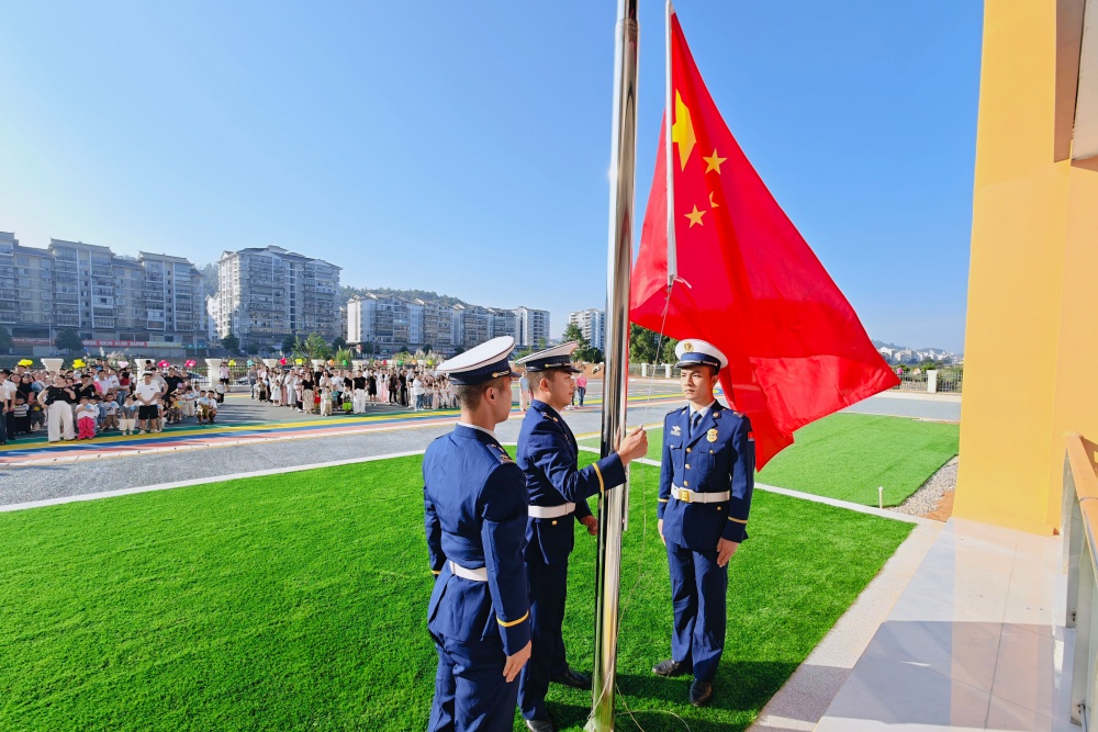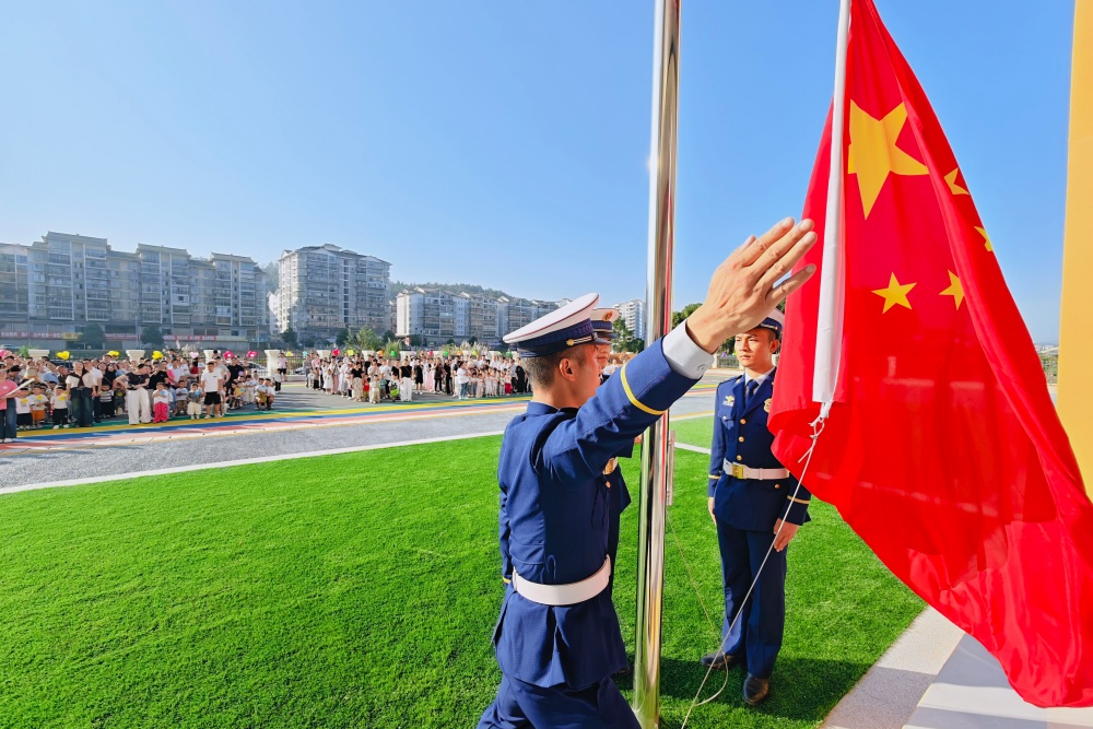 隨后舉行了莊嚴的升旗儀式,伴隨著雄壯的國歌,消防隊官兵到場將五星紅旗緩緩升起,萌娃們在老師的引導(dǎo)下立正注目,小小的臉龐滿是認真,在心中種下愛國的種子。