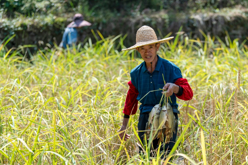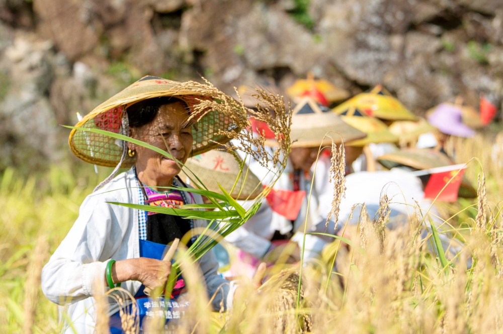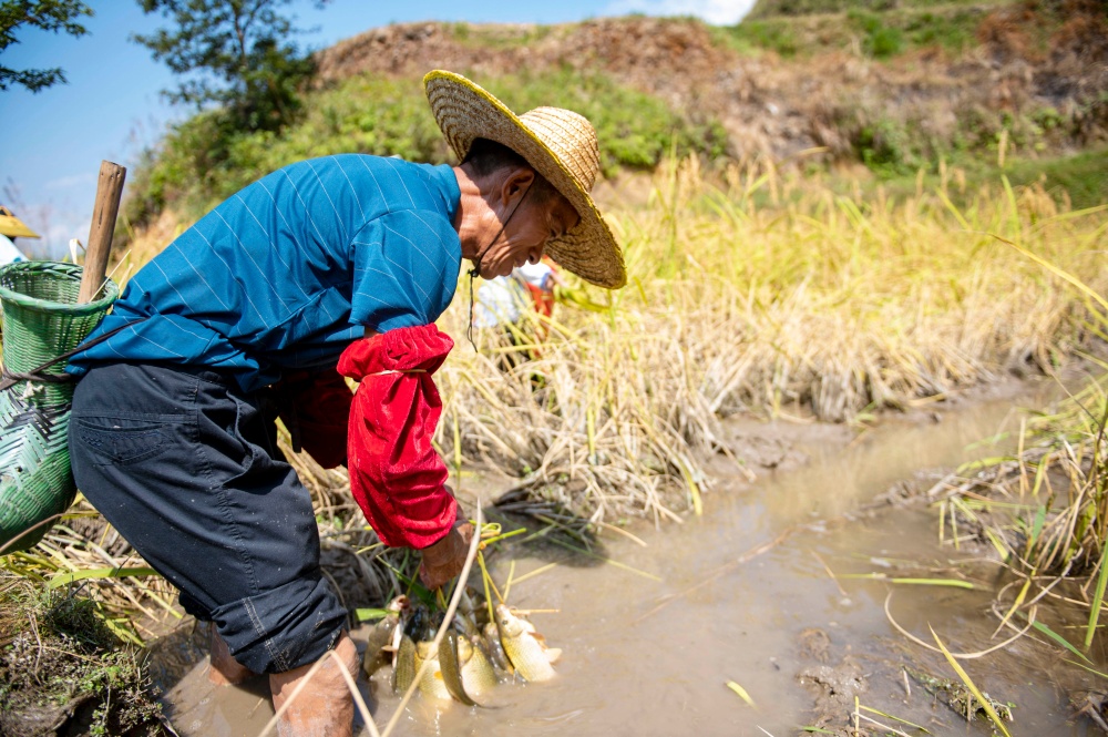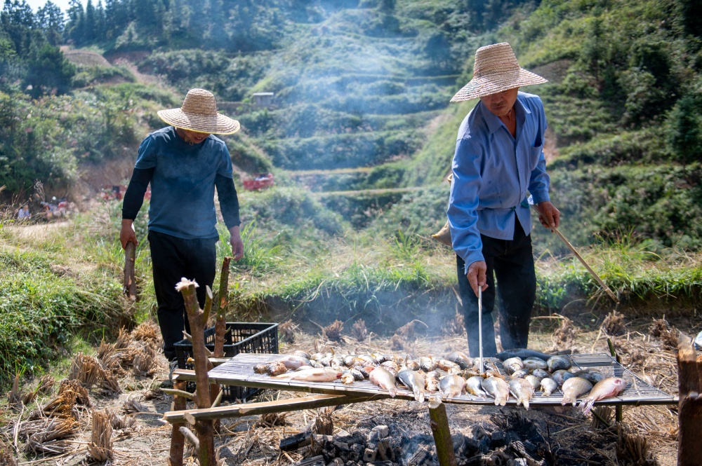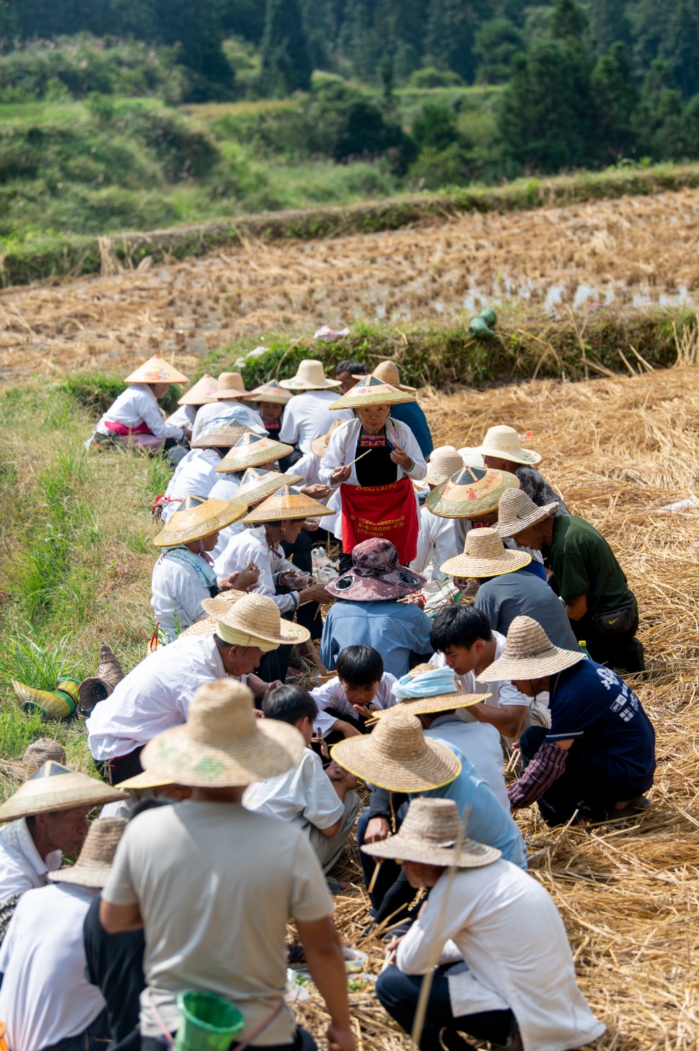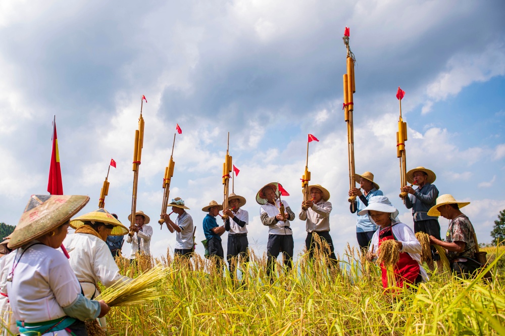 當日,貴州省黔東南苗族侗族自治州從江縣舉辦2025年香禾糯新品種測產(chǎn)驗收暨慶豐收活動。當?shù)囟弊逋麄冊诮鹕牡咎锢锎底嗵J笙、收割香禾糯稻谷、稻田抓魚、共享燒魚宴,以傳統(tǒng)方式慶祝豐收。